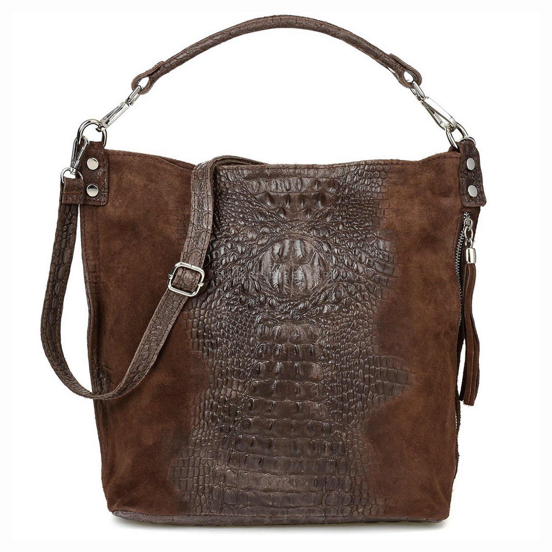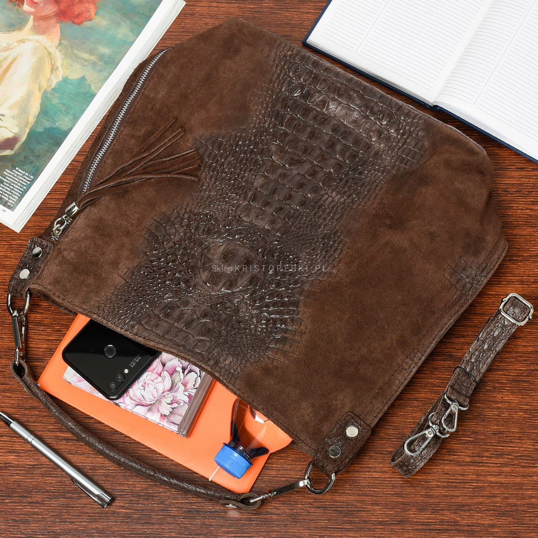 Włoska skórzana torebka damska typu shopper znanej i cenionej marki VERA PELLE ITALY w kolorze CIEMNEGO CZEKOLADOWEGO BRĄZU. Wykonana została bardzo starannie z wysokiej jakości zamszowej skóry naturalnej. Wygląda niezwykle oryginalnie dzięki ciekawemu połączeniu zamszu z fakturą imitującą skórę krokodyla. Torebka posiada wygodną rączkę do noszenia w ręku a dodatkowy długi, odpinany i regulowany pasek pozwala ją nosić również wygodnie na ramieniu. Torebka posiada okucia w kolorze srebrnym. Jest duża i pojemna, dzięki czemu bez trudu pomieści format A4. Po prawej stronie torebki znajduje się duża i funkcjonalna kieszeń zamykana na suwak z ozdobnym frędzelkiem. Środek zamykany jest na suwak oraz wykończony wysokiej jakości podszewką. Torebka posiada jedną, zamykaną na suwak komorę, wewnątrz której znajduje się mała, boczna, zasuwana kieszonka. Z tyłu torebki znajdziesz kolejną praktyczną, zamykaną na suwak dużą kieszeń. Torebka jest bardzo wygodna w codziennym użytkowaniu a jej wygląda sprawia, że będzie pasowała do większości codziennych stylizacji. Jest lekka, a jej kształt i materiał sprawiają, że jest bardzo wygodna w użytkowaniu.