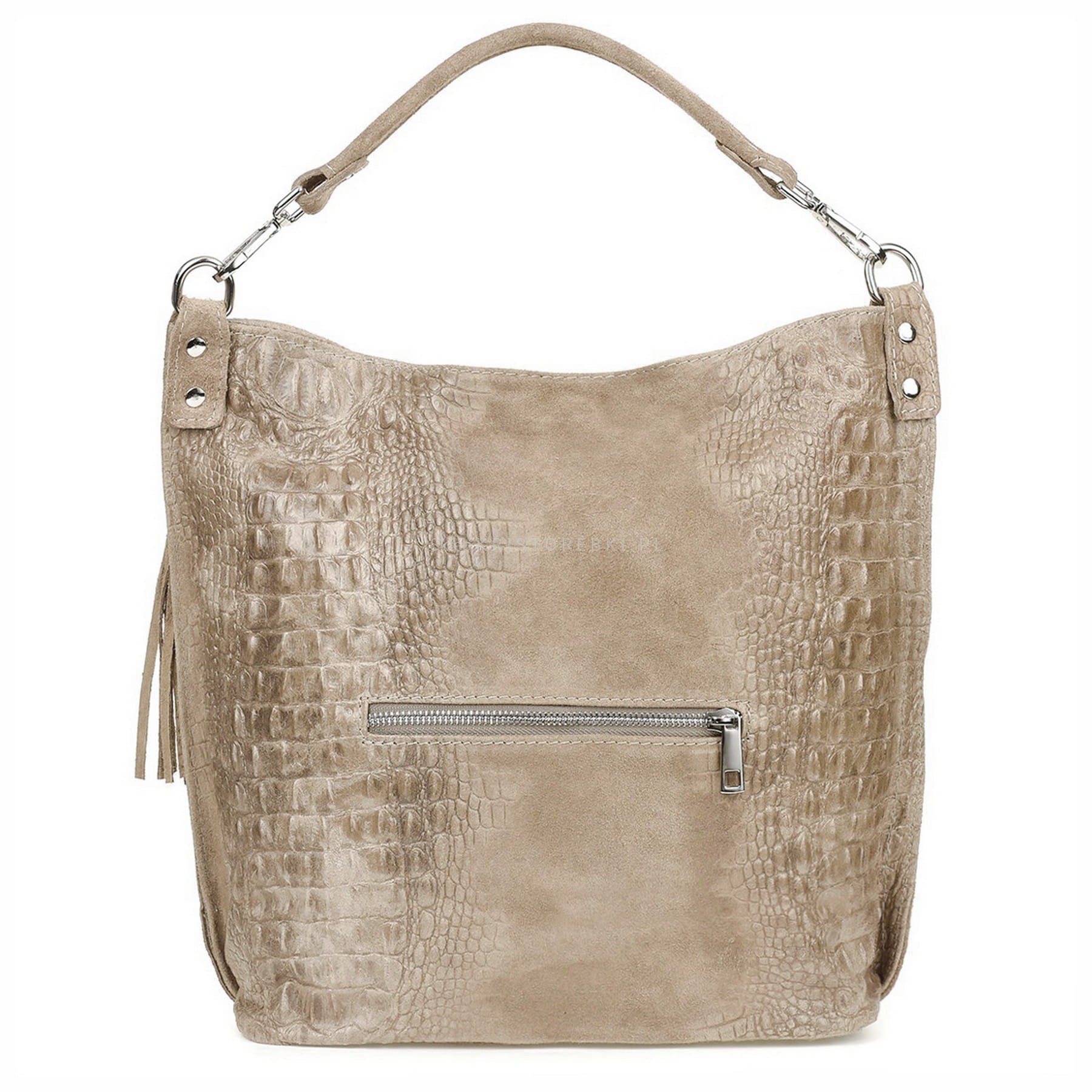 Włoska skórzana torebka damska typu shopper znanej i cenionej marki VERA PELLE ITALY w kolorze CIEMNEGO JEANSU. Wykonana została bardzo starannie z wysokiej jakości zamszowej skóry naturalnej. Wygląda niezwykle oryginalnie dzięki ciekawemu połączeniu zamszu z fakturą imitującą skórę krokodyla. Torebka posiada wygodną rączkę do noszenia w ręku a dodatkowy długi, odpinany i regulowany pasek pozwala ją nosić również wygodnie na ramieniu. Torebka posiada okucia w kolorze srebrnym. Jest duża i pojemna, dzięki czemu bez trudu pomieści format A4. Po prawej stronie torebki znajduje się duża i funkcjonalna kieszeń zamykana na suwak z ozdobnym frędzelkiem. Środek zamykany jest na suwak oraz wykończony wysokiej jakości podszewką. Torebka posiada jedną, zamykaną na suwak komorę, wewnątrz której znajduje się mała, boczna, zasuwana kieszonka. Z tyłu torebki znajdziesz kolejną praktyczną, zamykaną na suwak dużą kieszeń. Torebka jest bardzo wygodna w codziennym użytkowaniu a jej wygląda sprawia, że będzie pasowała do większości codziennych stylizacji. Jest lekka, a jej kształt i materiał sprawiają, że jest bardzo wygodna w użytkowaniu.
