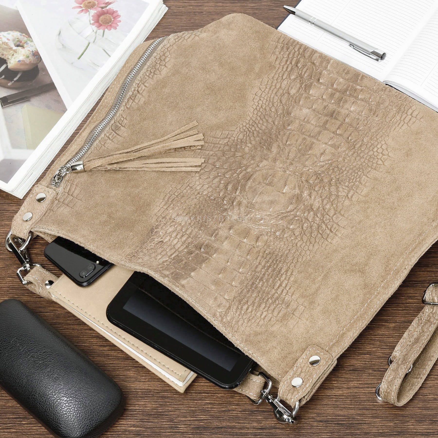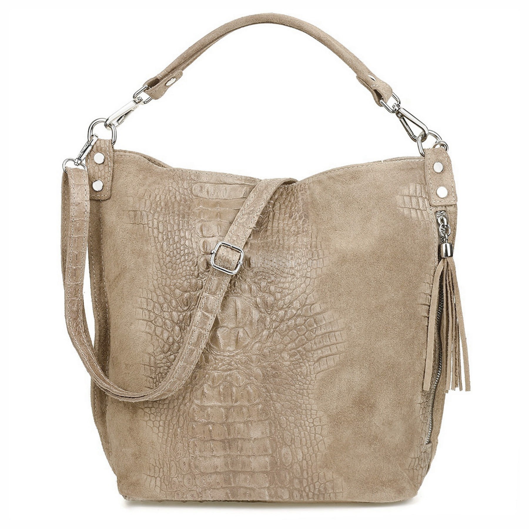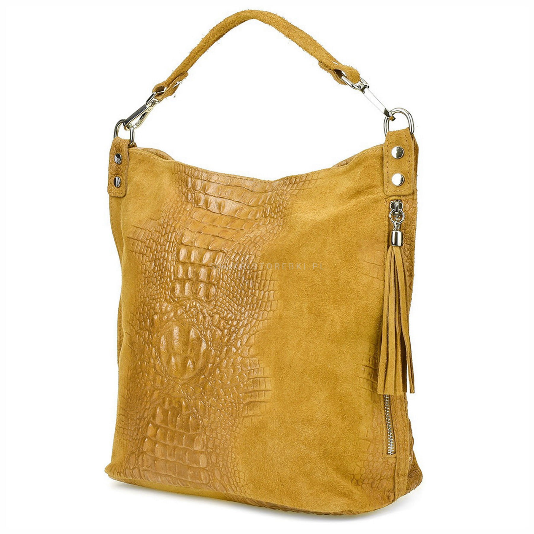Włoska skórzana torebka damska typu shopper znanej i cenionej marki VERA PELLE ITALY w kolorze MUSZTARDOWYM. Wykonana została bardzo starannie z wysokiej jakości zamszowej skóry naturalnej. Wygląda niezwykle oryginalnie dzięki ciekawemu połączeniu zamszu z fakturą imitującą skórę krokodyla. Torebka posiada wygodną rączkę do noszenia w ręku a dodatkowy długi, odpinany i regulowany pasek pozwala ją nosić również wygodnie na ramieniu. Torebka posiada okucia w kolorze srebrnym. Jest duża i pojemna, dzięki czemu bez trudu pomieści format A4. Po prawej stronie torebki znajduje się duża i funkcjonalna kieszeń zamykana na suwak z ozdobnym frędzelkiem. Środek zamykany jest na suwak oraz wykończony wysokiej jakości podszewką. Torebka posiada jedną, zamykaną na suwak komorę, wewnątrz której znajduje się mała, boczna, zasuwana kieszonka. Z tyłu torebki znajdziesz kolejną praktyczną, zamykaną na suwak dużą kieszeń. Torebka jest bardzo wygodna w codziennym użytkowaniu a jej wygląda sprawia, że będzie pasowała do większości codziennych stylizacji. Jest lekka, a jej kształt i materiał sprawiają, że jest bardzo wygodna w użytkowaniu.