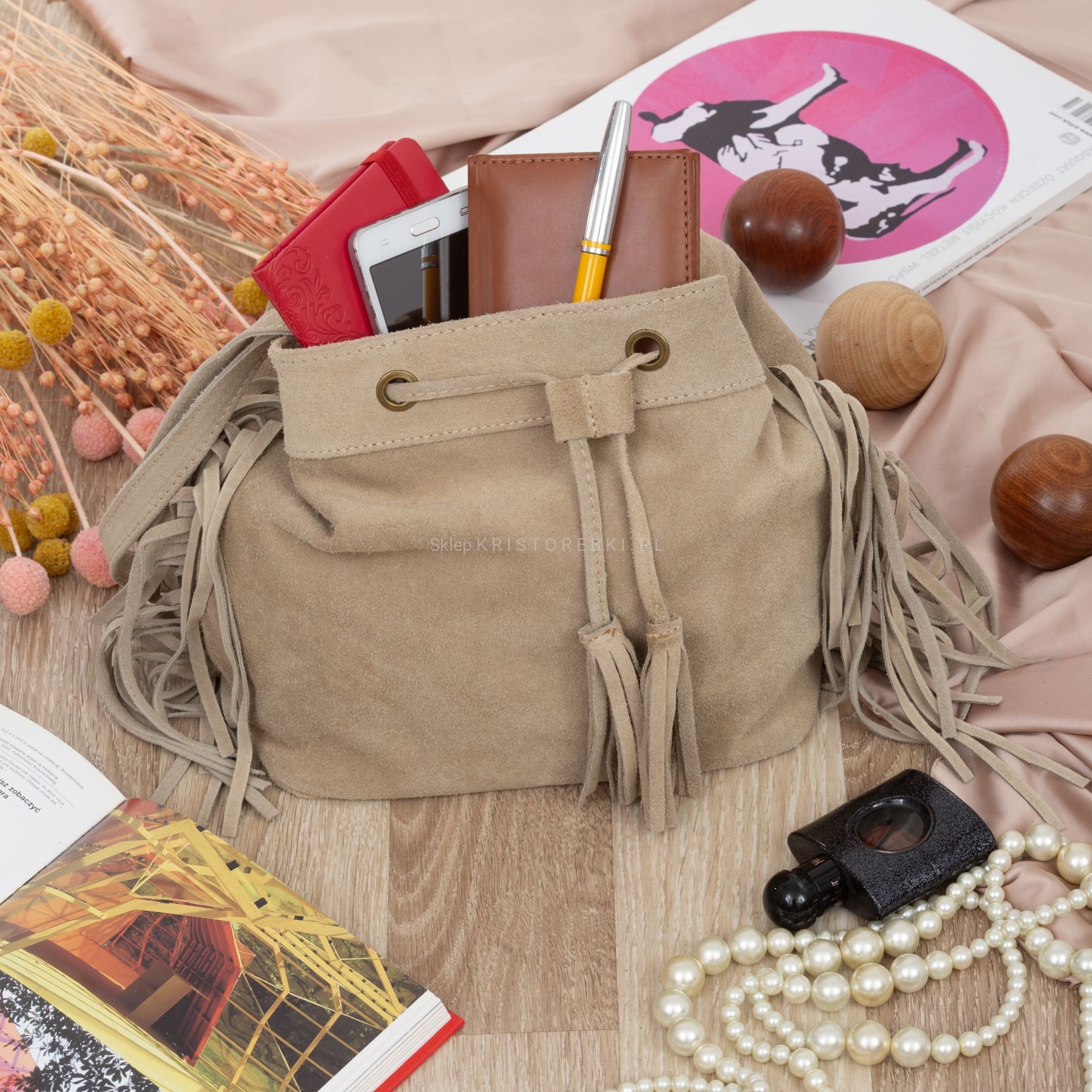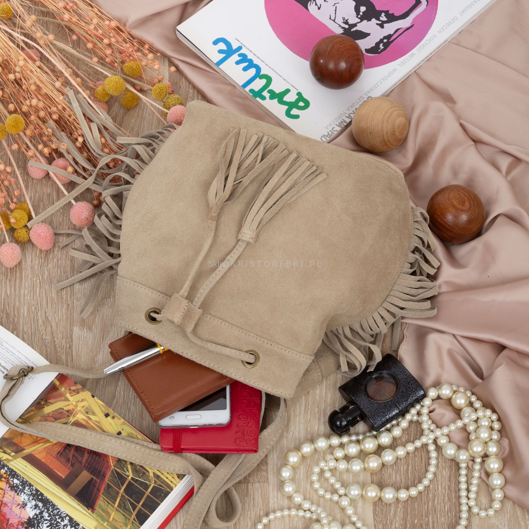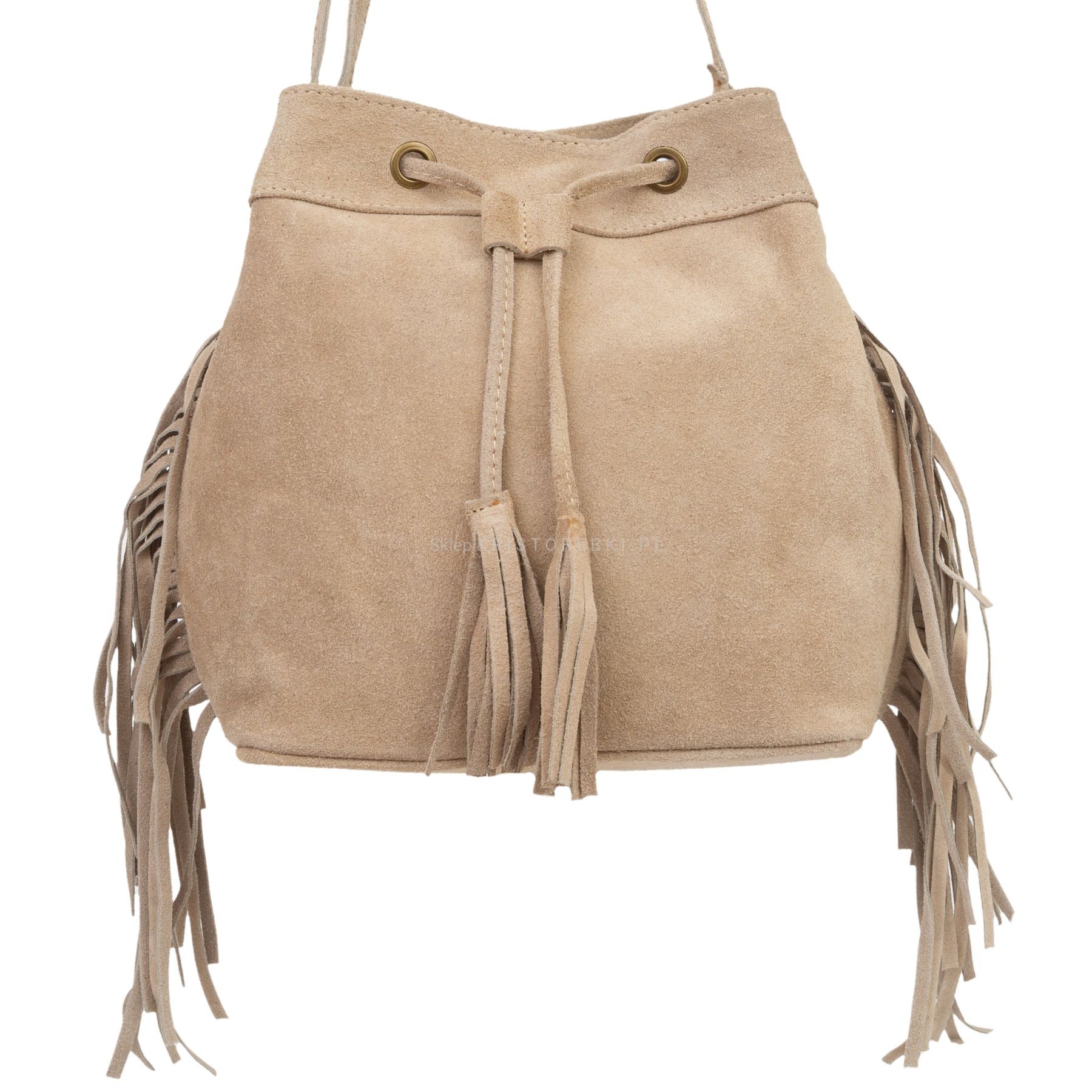VERA PELLE torebka damska zamszowa listonoszka worek z frędzlami boho na ramię V477 beżowa