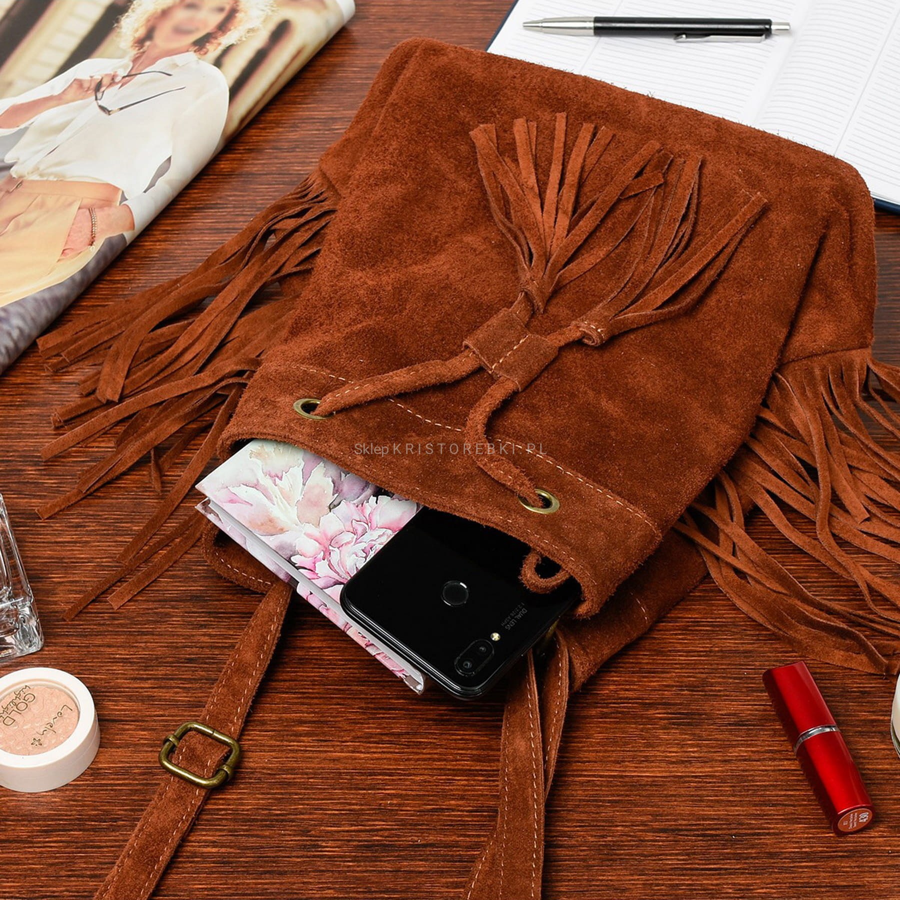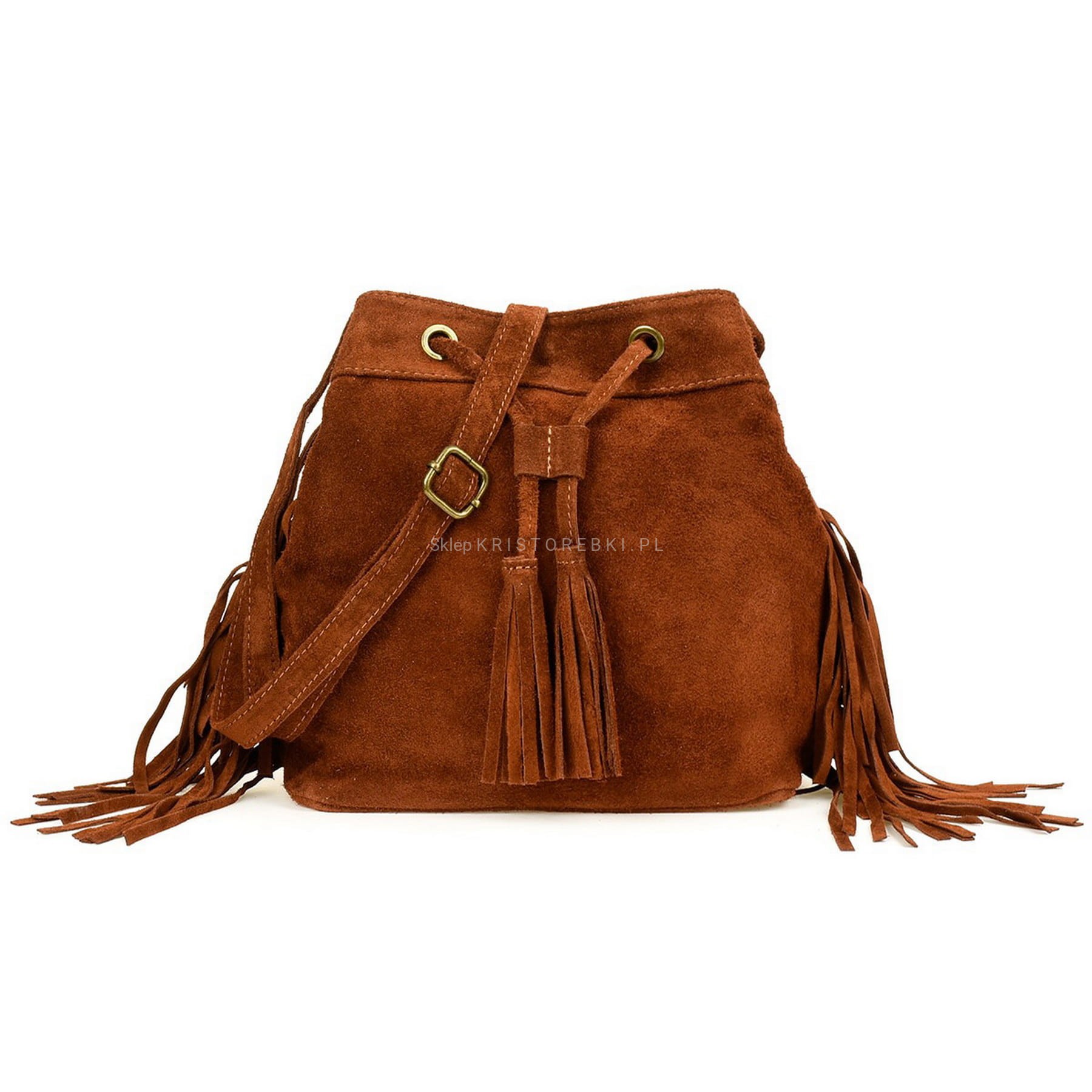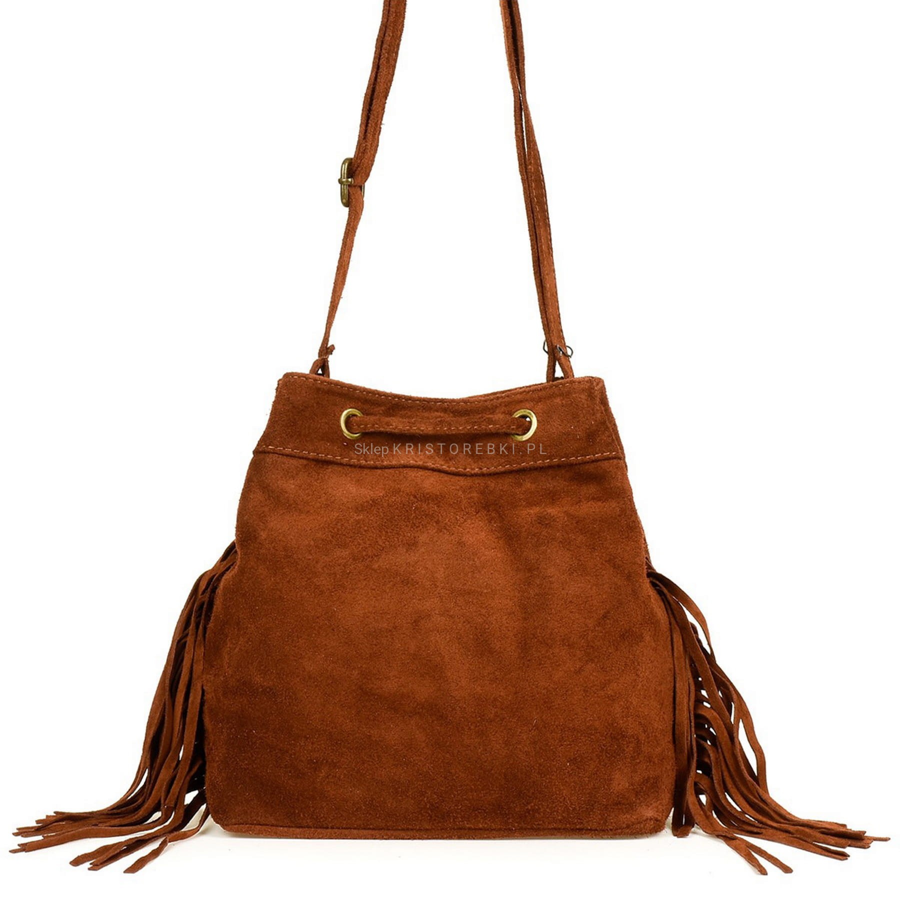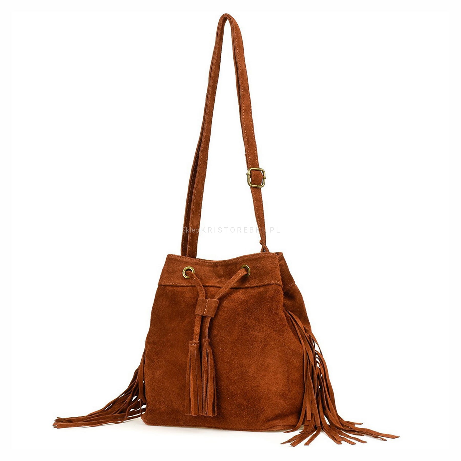 VERA PELLE torebka damska zamszowa listonoszka worek z frędzlami boho na ramię V477 brązowa