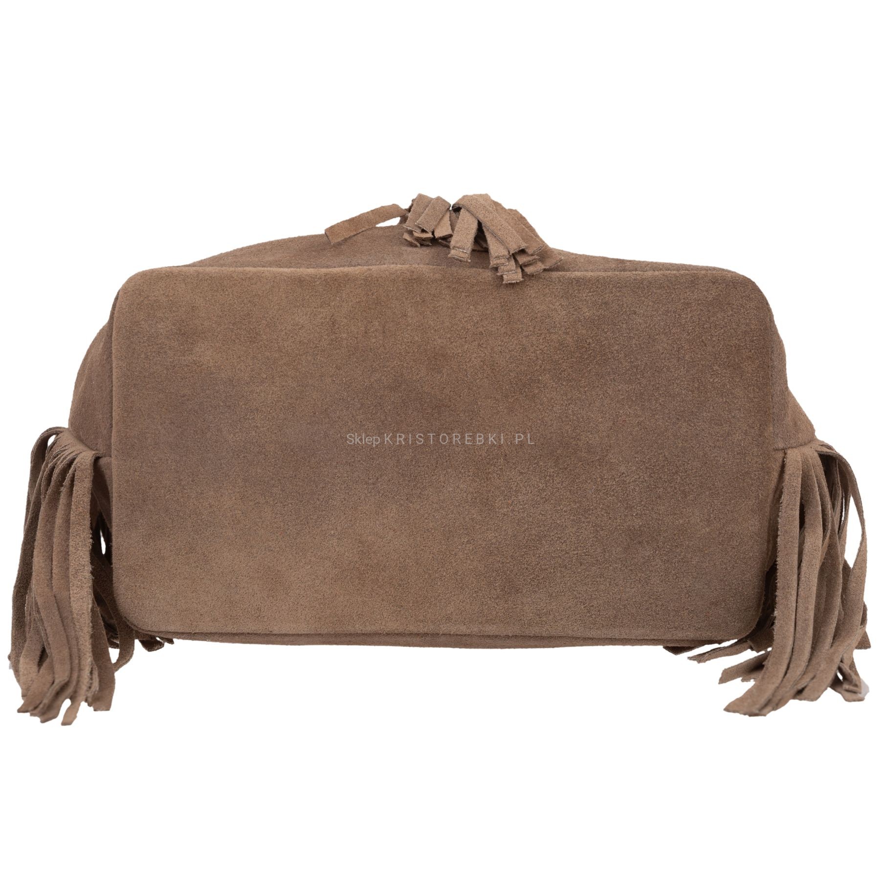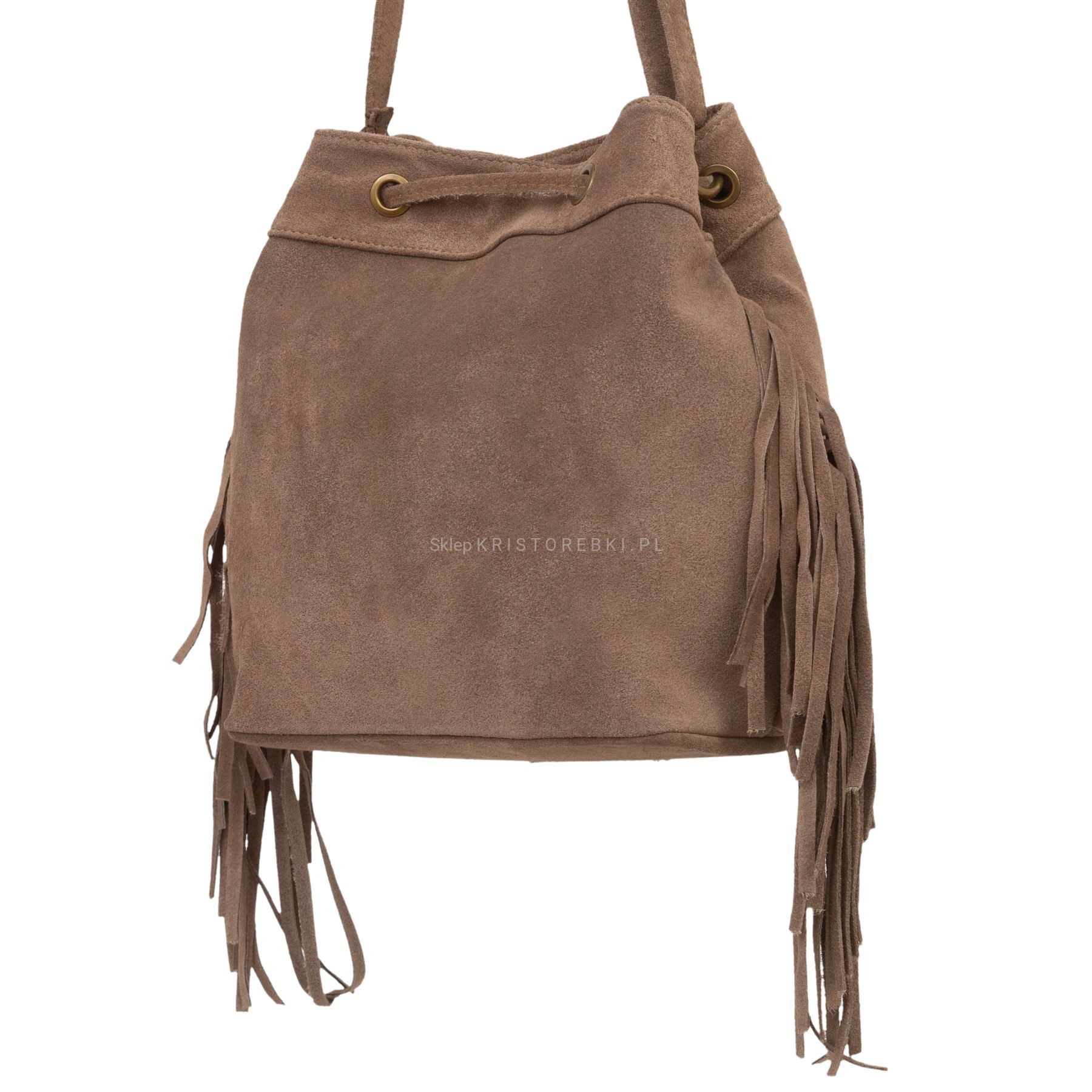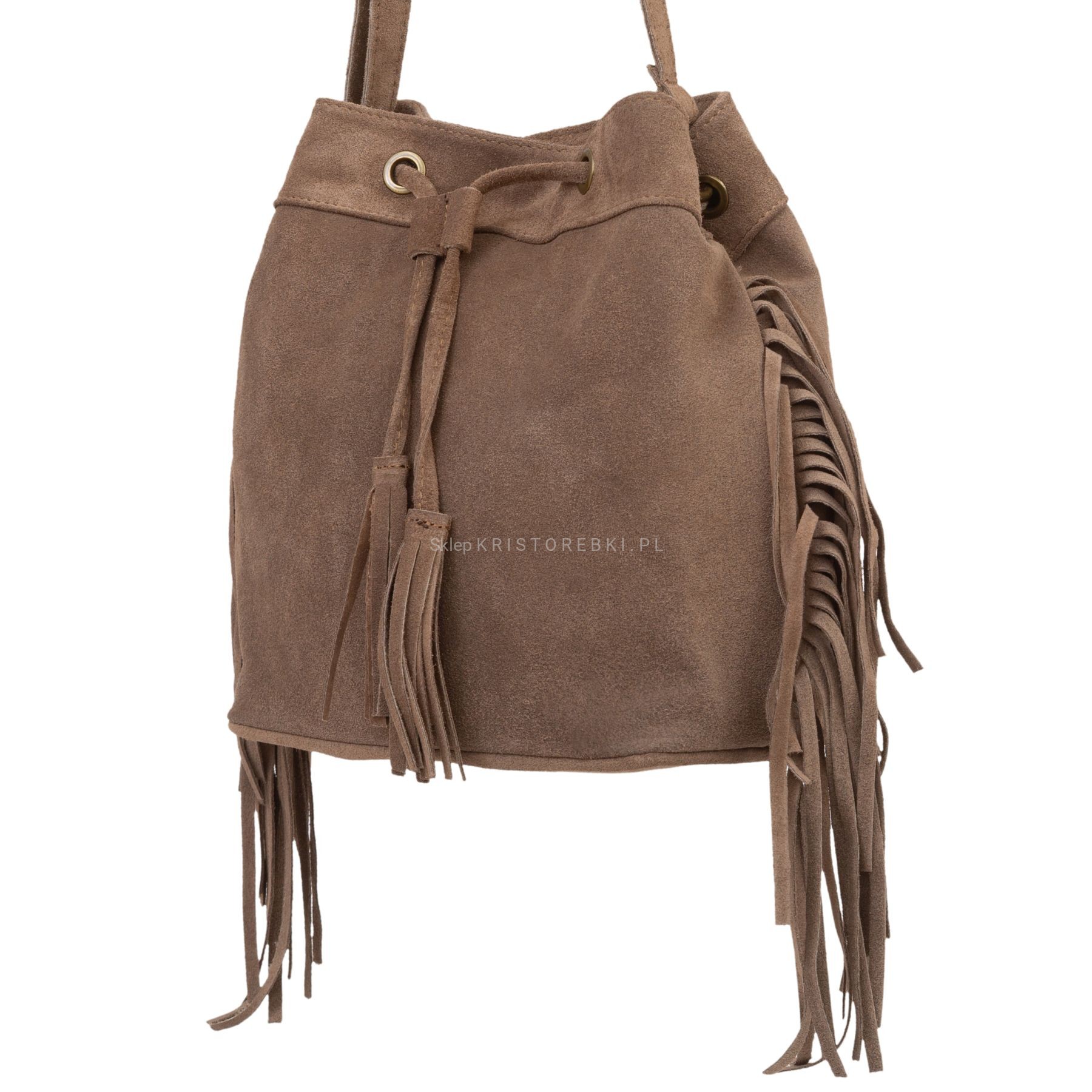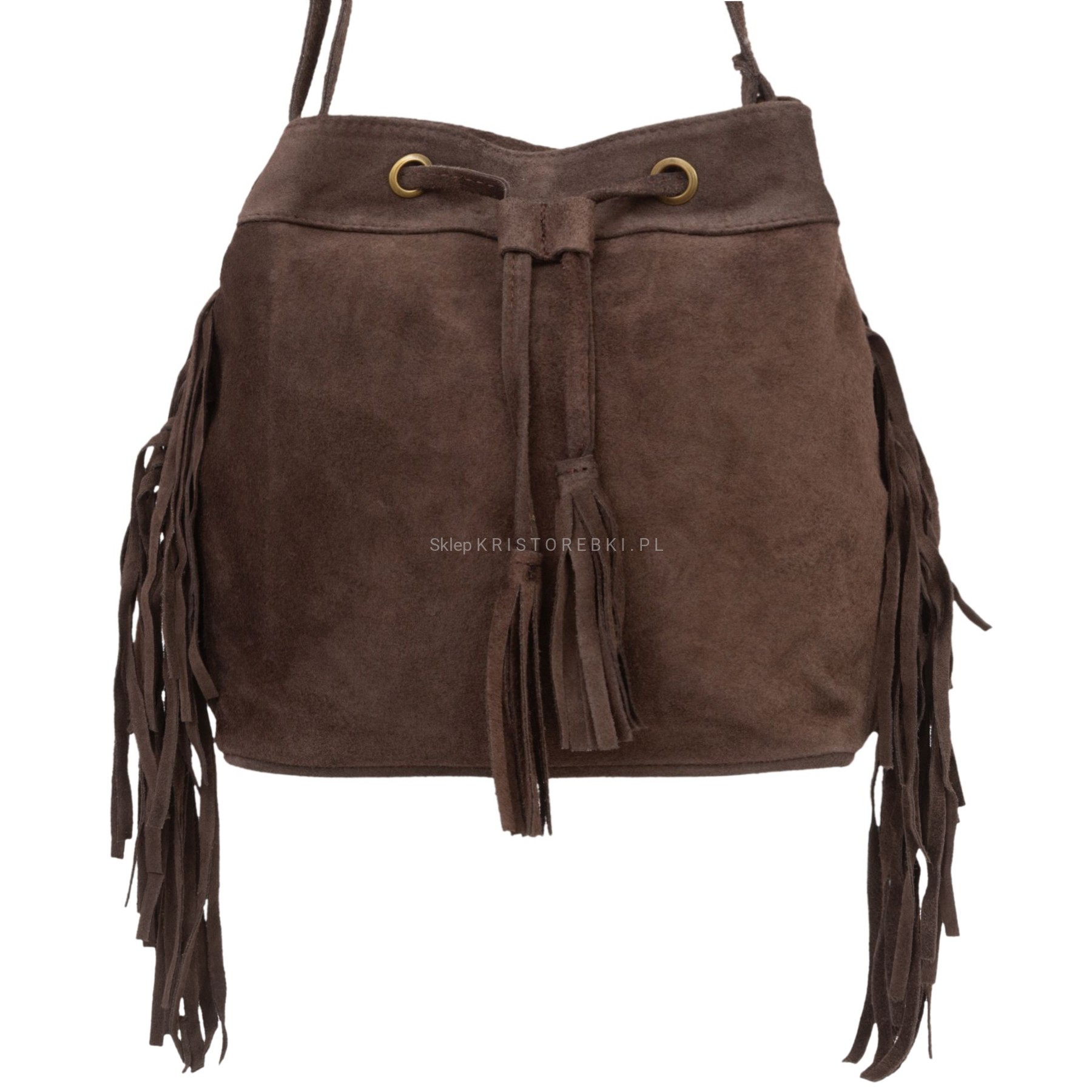 VERA PELLE torebka damska zamszowa listonoszka worek z frędzlami boho na ramię V477 ciemna brązowa