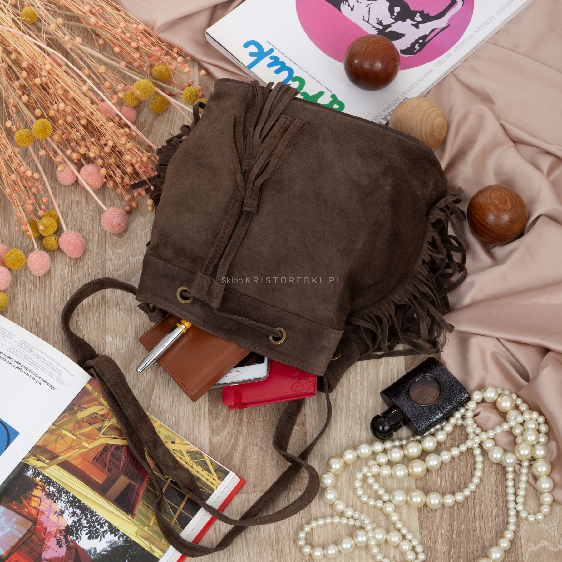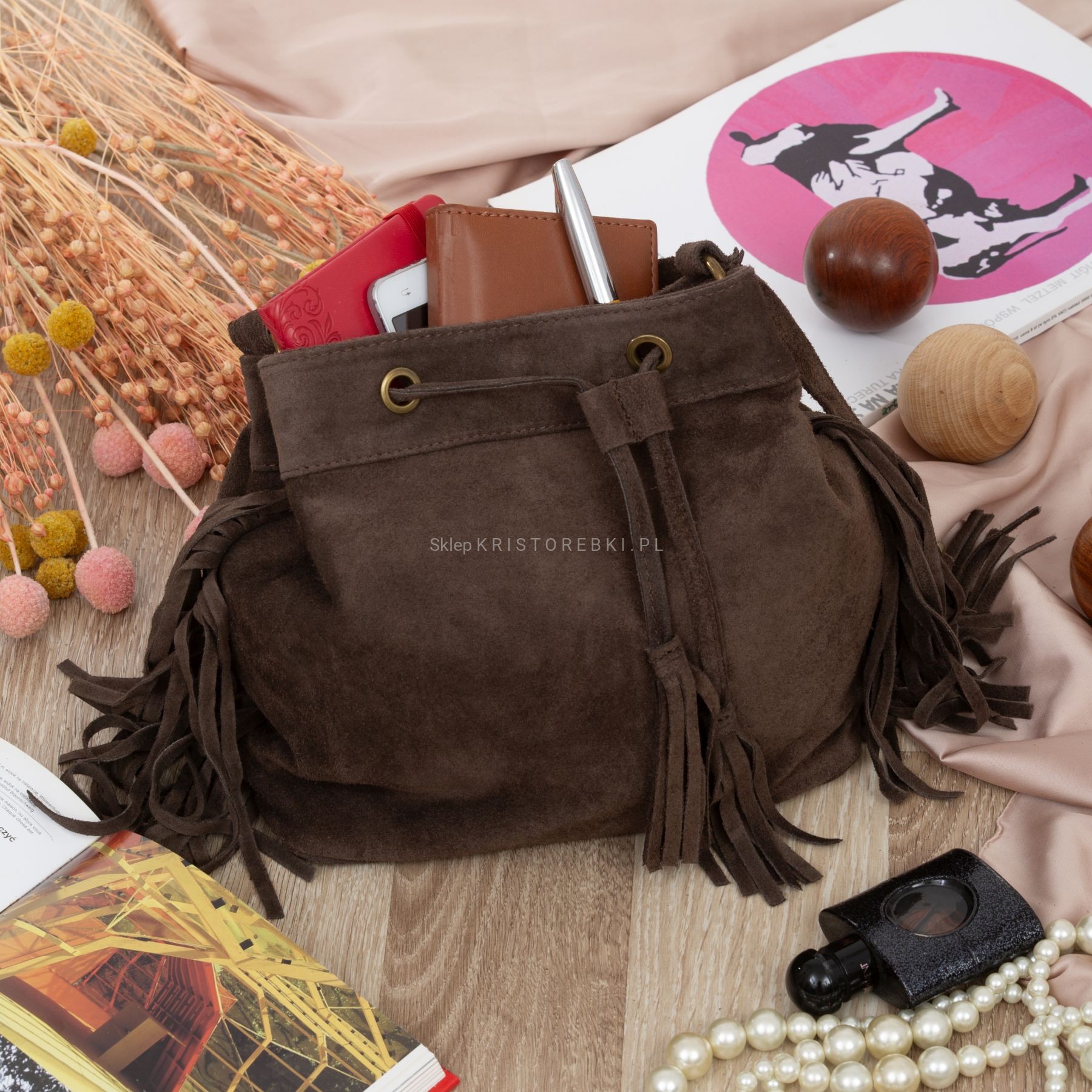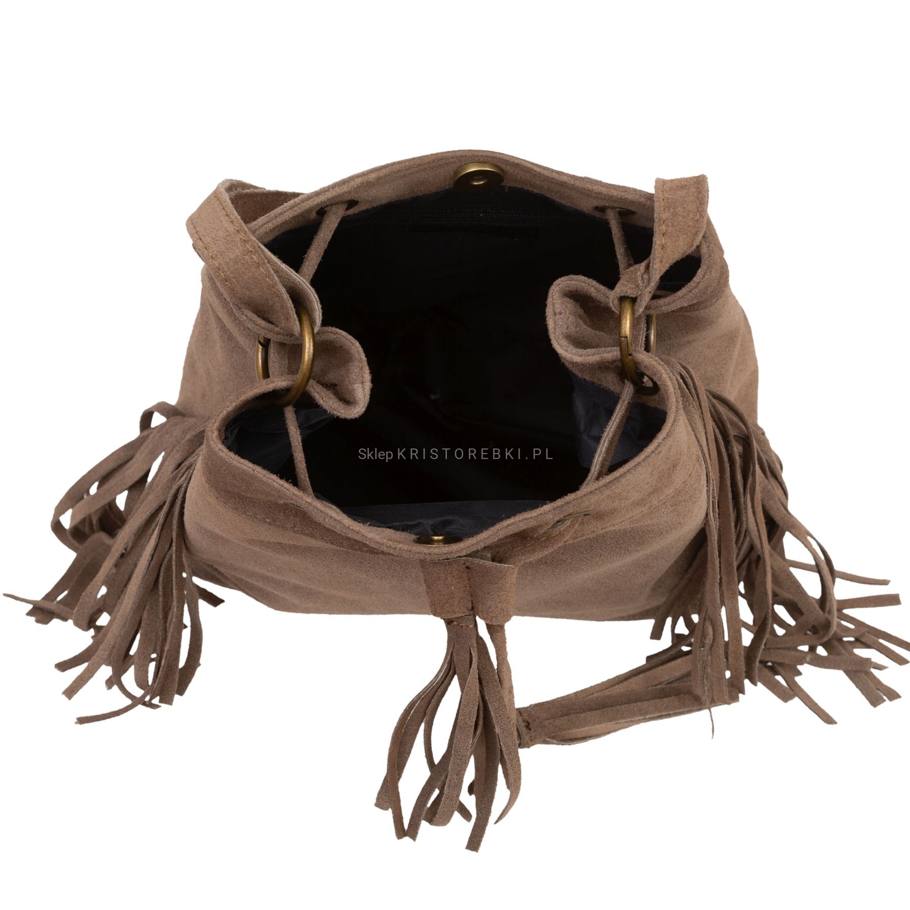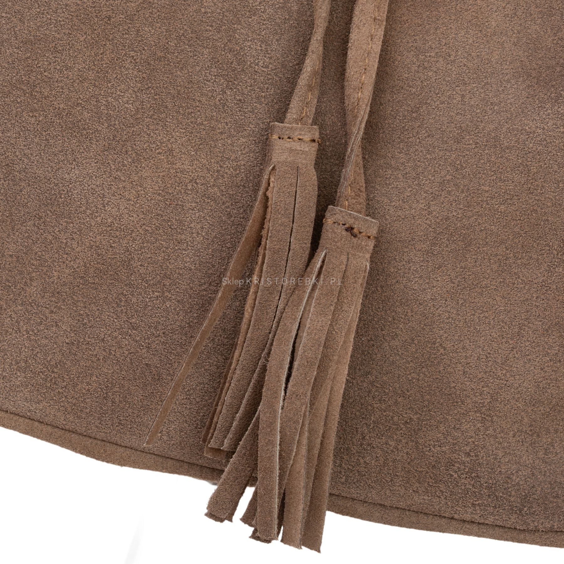 VERA PELLE torebka damska zamszowa listonoszka worek z frędzlami boho na ramię V477 ciemna brązowa