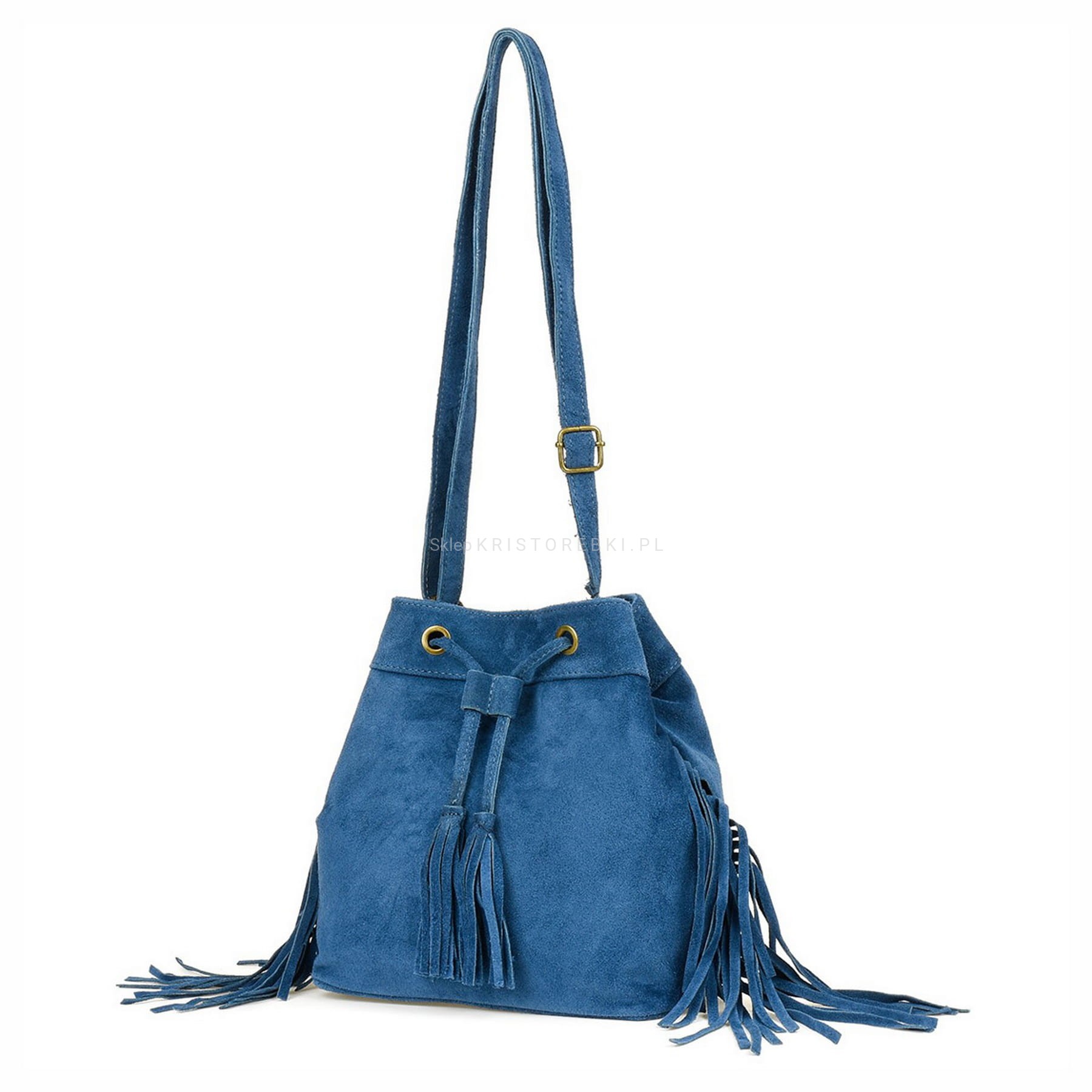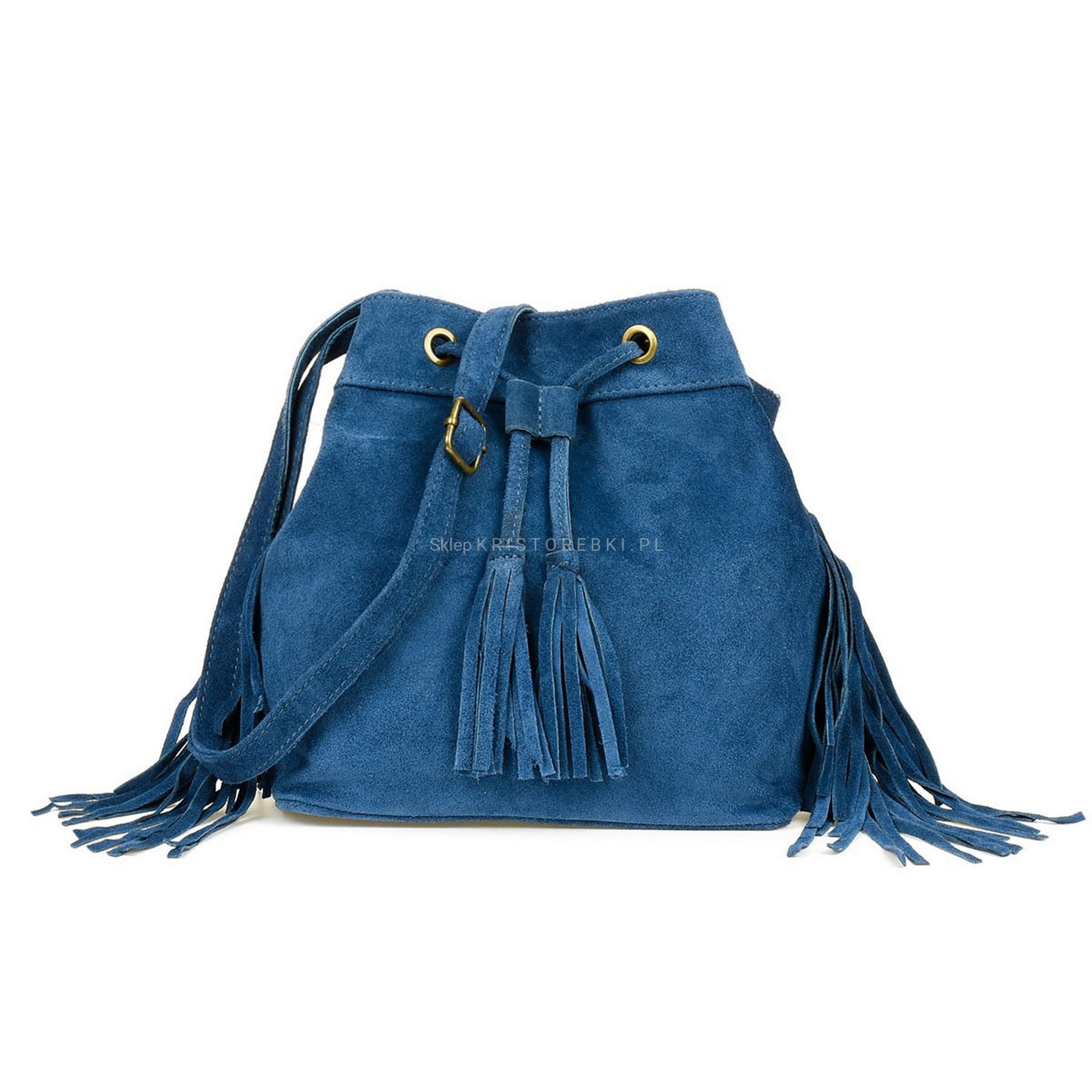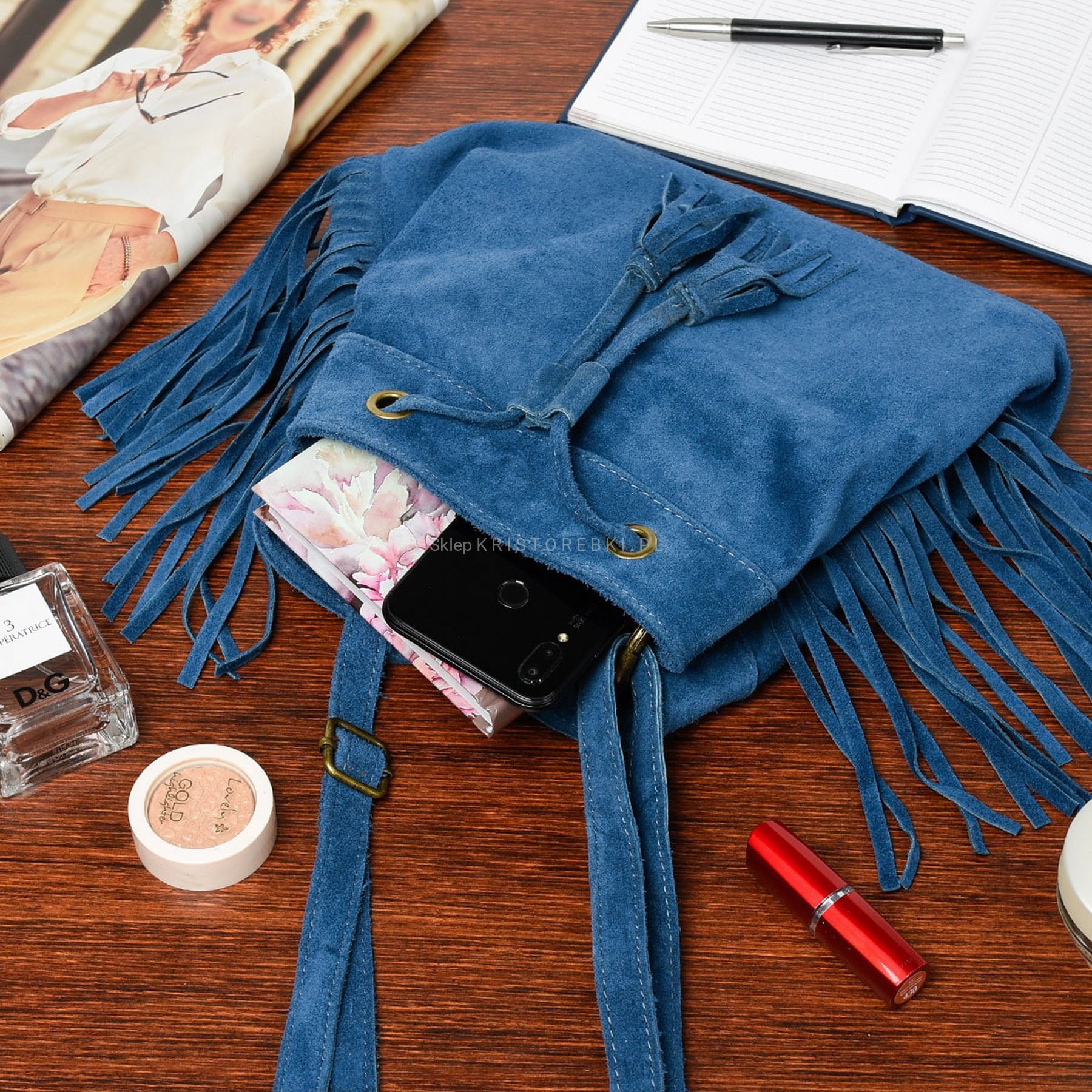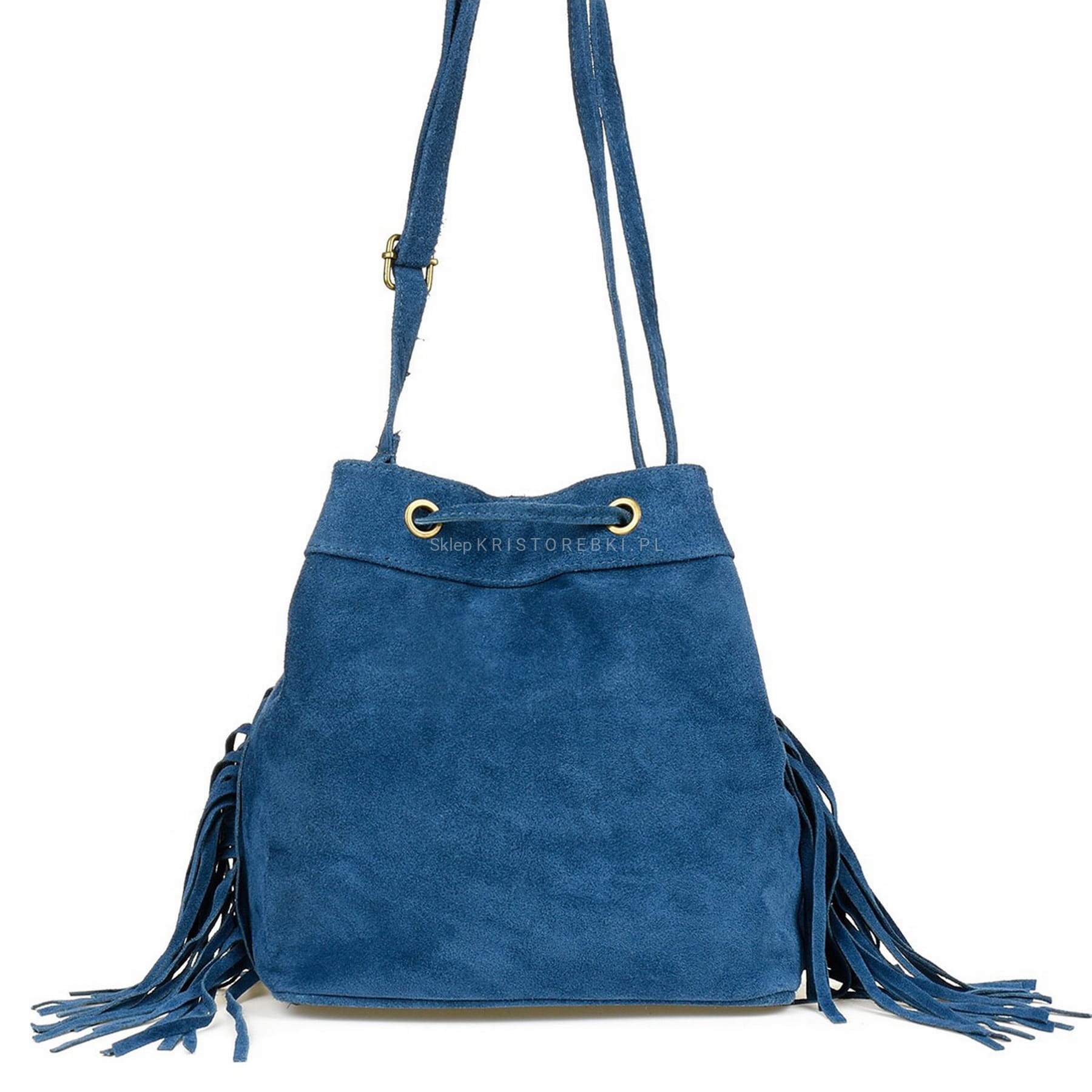 VERA PELLE torebka damska zamszowa listonoszka worek z frędzlami boho na ramię V477 ciemna jeansowa