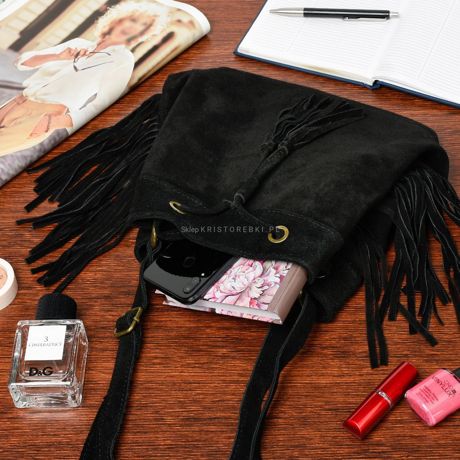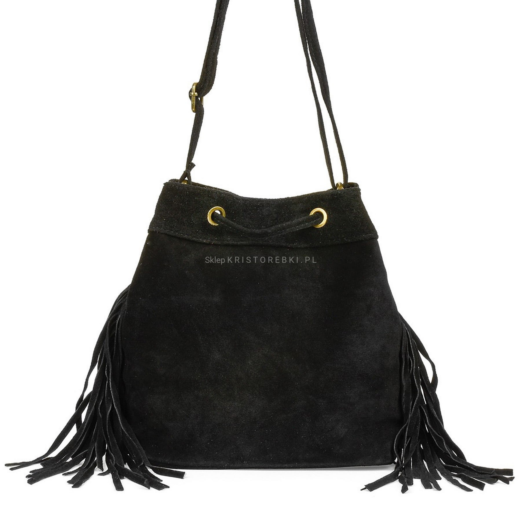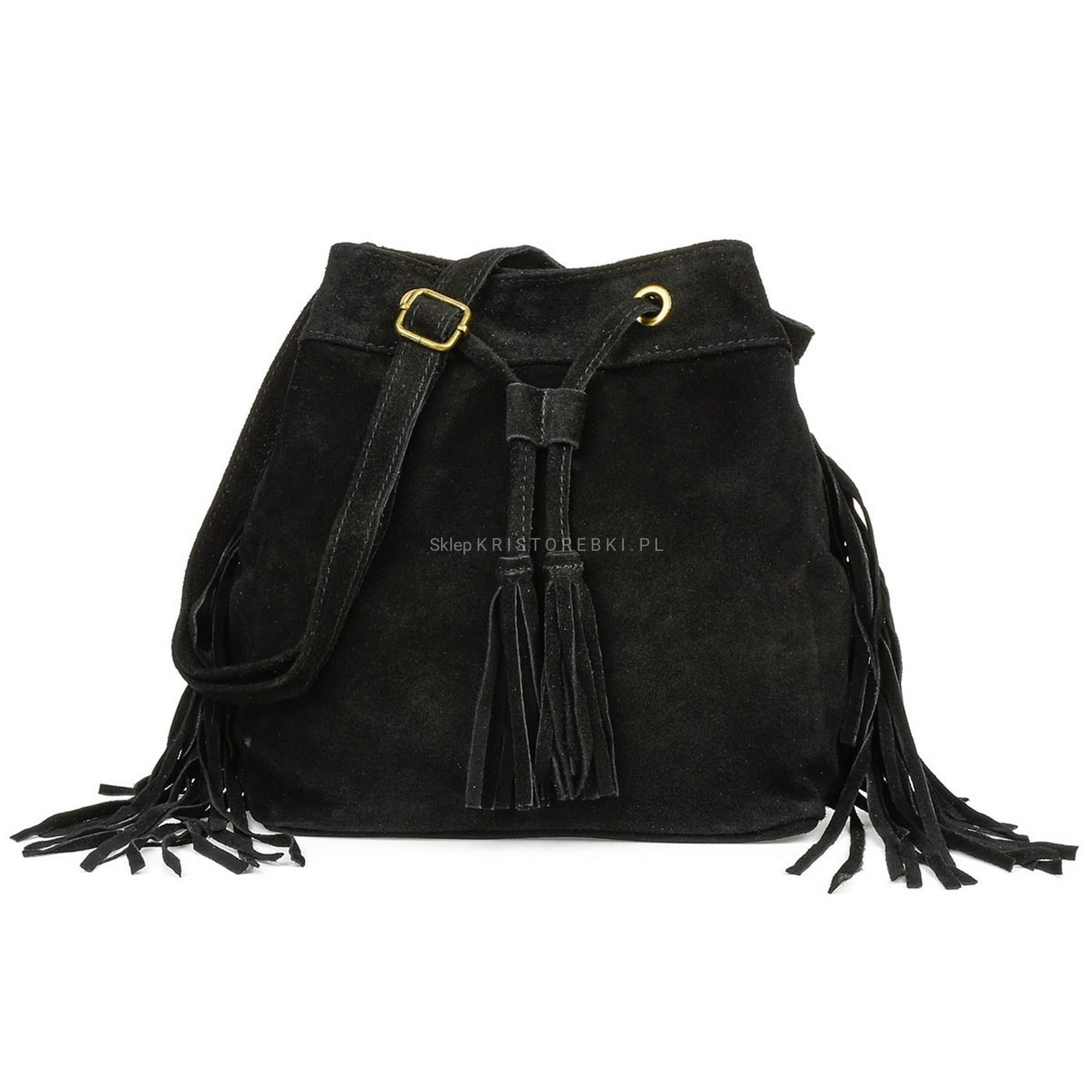 VERA PELLE torebka damska zamszowa listonoszka worek z frędzlami boho na ramię V477 czarna