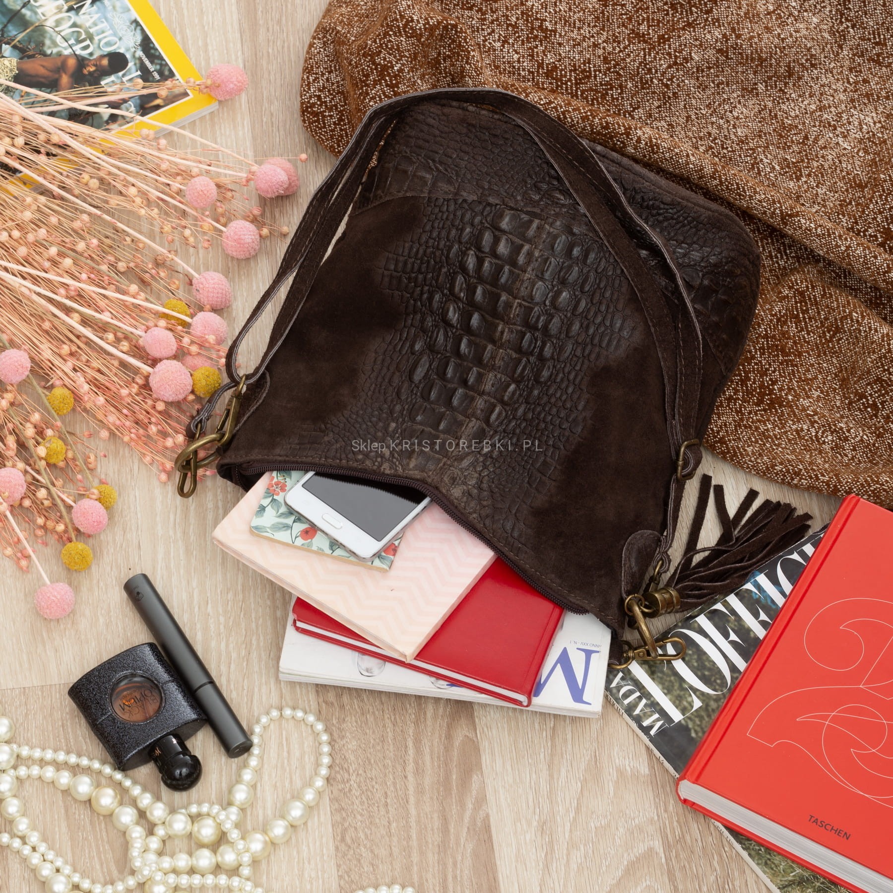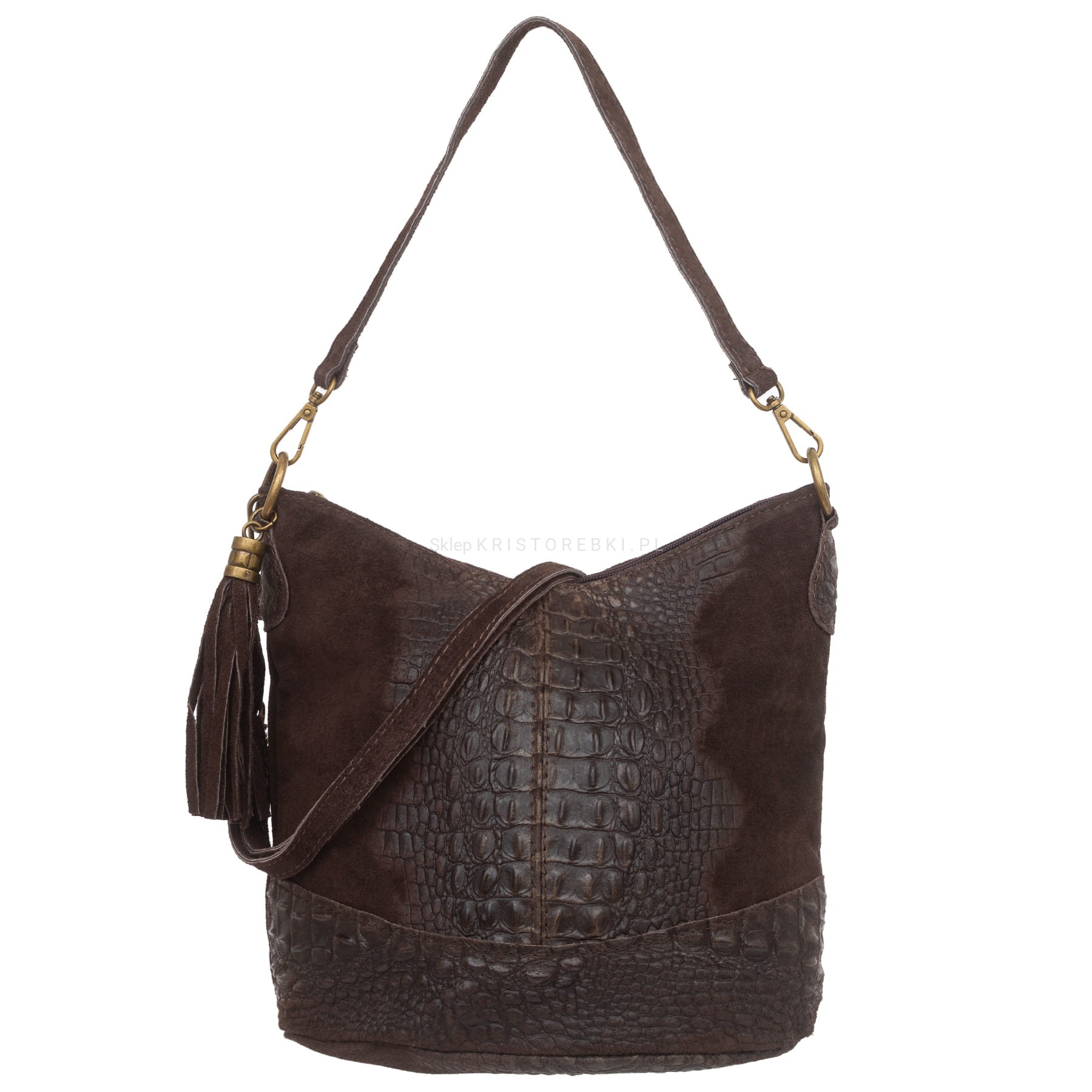 Włoska skórzana torebka damska typu worek znanej i cenionej marki VERA PELLE ITALY w kolorze CIEMNEGO CZEKOLADOWEGO BRĄZU. Wykonana została bardzo starannie z wysokiej jakości zamszowej skóry naturalnej. Wygląda niezwykle oryginalnie dzięki ciekawemu połączeniu zamszu z fakturą imitującą skórę krokodyla. Torebka posiada wygodny krótki pasek do noszenia torebki w ręku a dodatkowy długi, odpinany i regulowany pasek pozwala ją nosić również wygodnie na ramieniu. Torebka posiada okucia w kolorze mosiężnym. Z tyłu torebki znajduje się duża i funkcjonalna kieszeń zamykana na suwak a po boku torebki przyczepiony jest ozdobny frędzelek. Środek zamykany jest na suwak oraz wykończony wysokiej jakości podszewką. Torebka posiada jedną, zamykaną na suwak komorę, wewnątrz której znajduje się mała, boczna, zasuwana kieszonka. Dodatkowo w środku znajduje się funkcjonalna osobna kieszonka na telefon lub dokumenty. Torebka jest bardzo wygodna w codziennym użytkowaniu a jej wygląda sprawia, że będzie pasowała do większości codziennych stylizacji. Jest lekka, a jej kształt i materiał sprawiają, że jest bardzo wygodna w użytkowaniu.