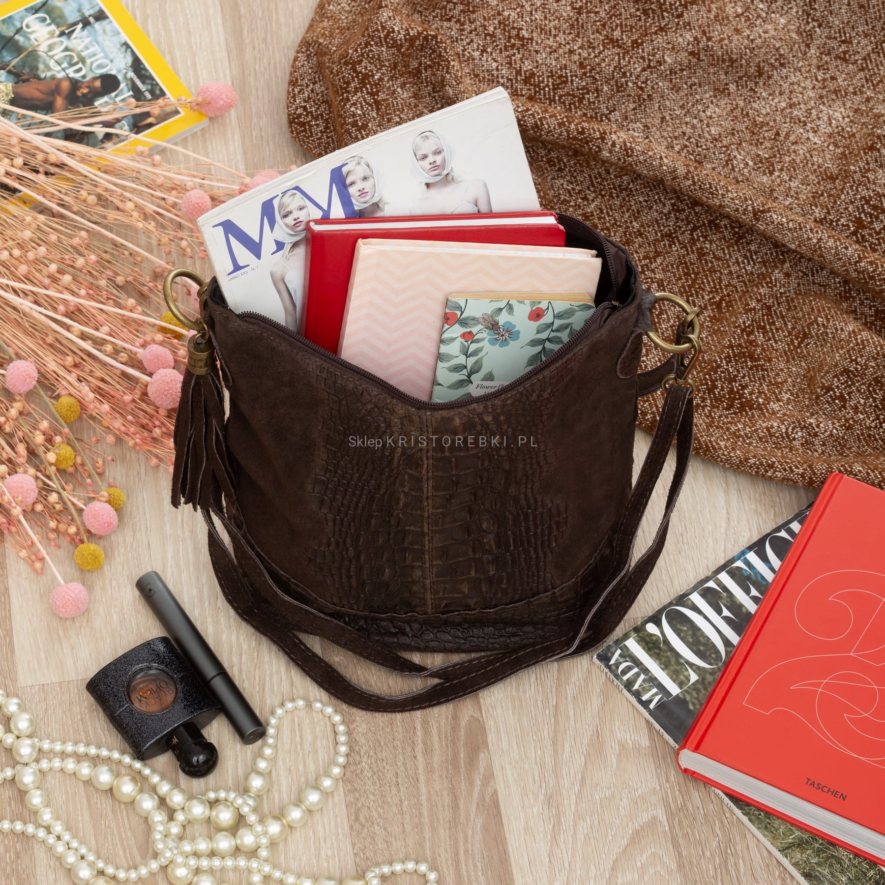| Dodatkowe informacje | z tyłu kieszeń zamykana na suwak + z boku ozdobny frędzelek |