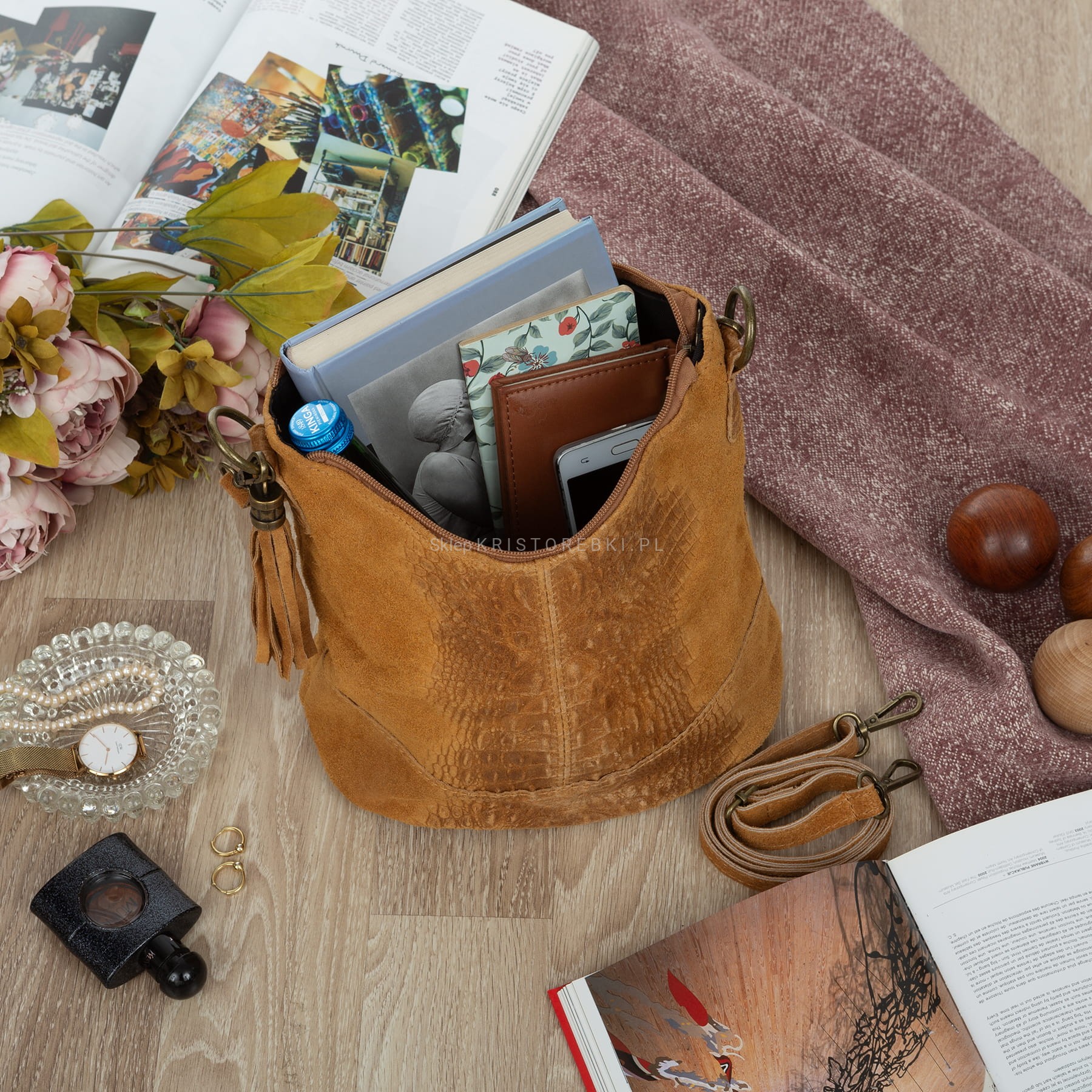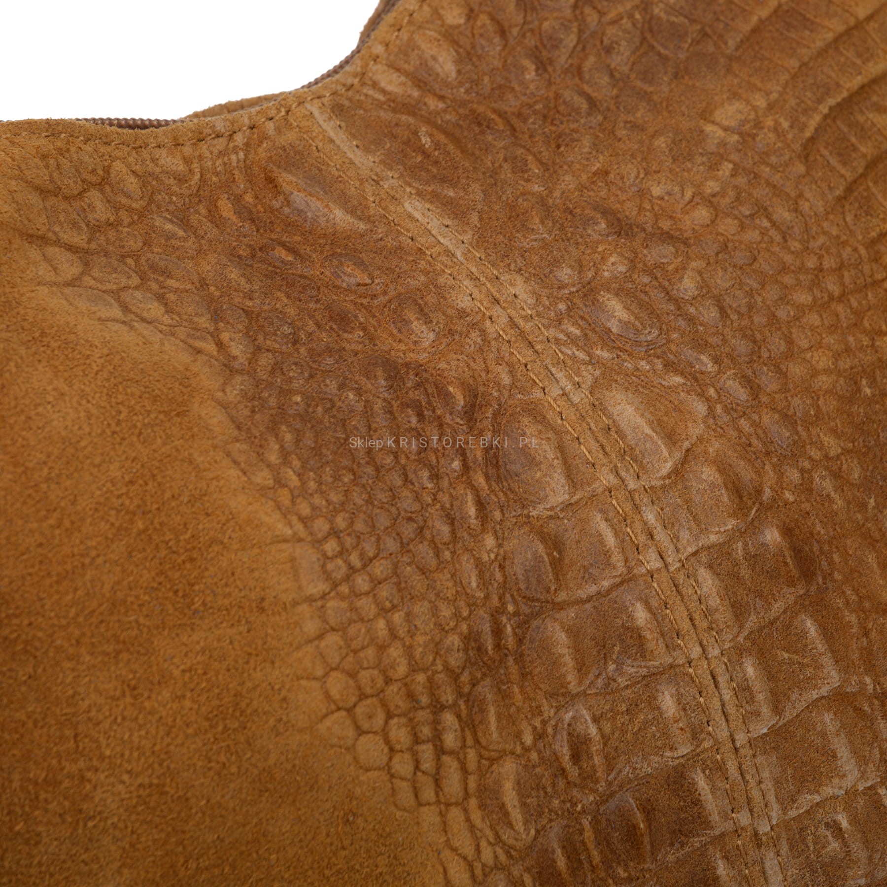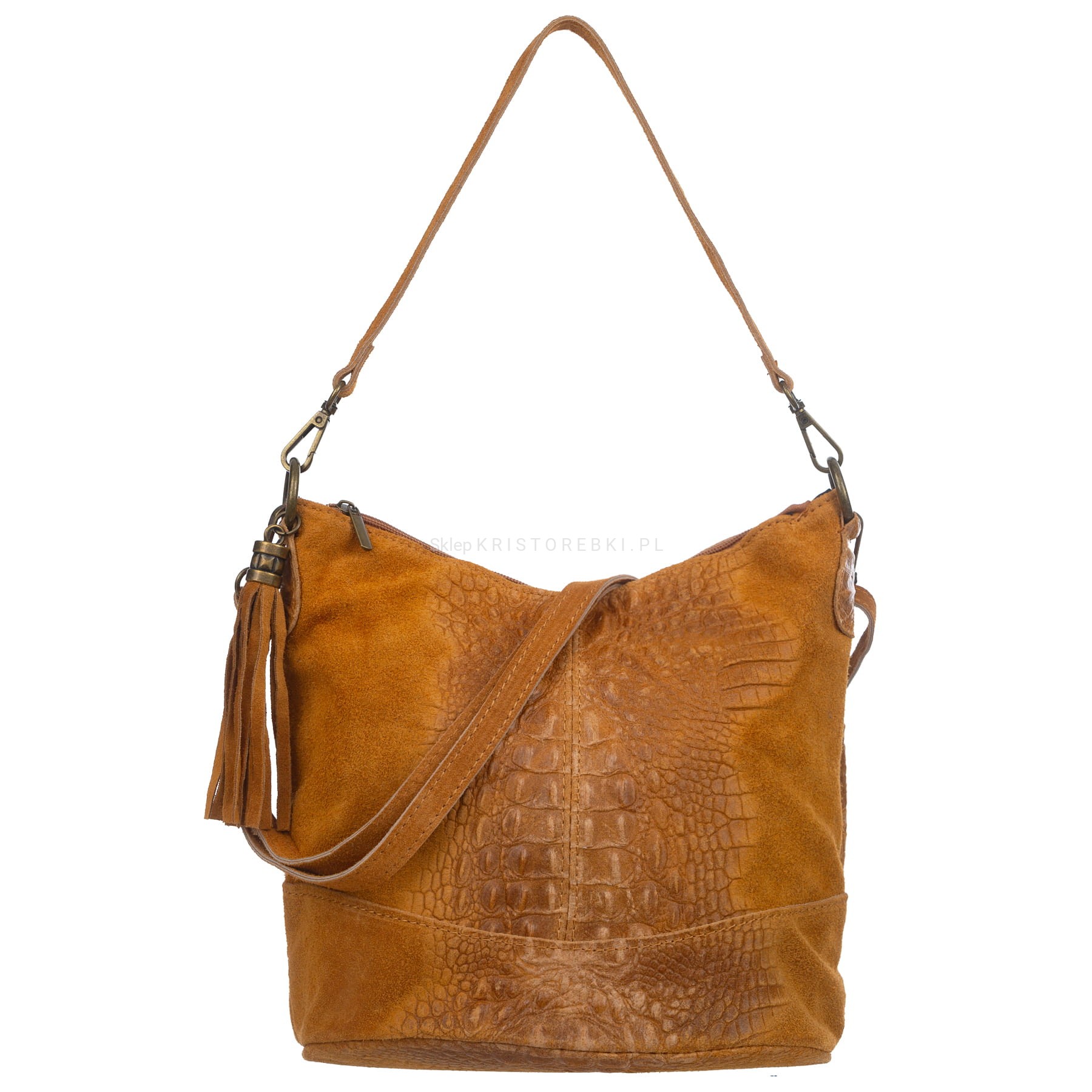 Włoska skórzana torebka damska typu worek znanej i cenionej marki VERA PELLE ITALY w kolorze CAMEL. Wykonana została bardzo starannie z wysokiej jakości zamszowej skóry naturalnej. Wygląda niezwykle oryginalnie dzięki ciekawemu połączeniu zamszu z fakturą imitującą skórę krokodyla. Torebka posiada wygodny krótki pasek do noszenia torebki w ręku a dodatkowy długi, odpinany i regulowany pasek pozwala ją nosić również wygodnie na ramieniu. Torebka posiada okucia w kolorze mosiężnym. Z tyłu torebki znajduje się duża i funkcjonalna kieszeń zamykana na suwak a po boku torebki przyczepiony jest ozdobny frędzelek. Środek zamykany jest na suwak oraz wykończony wysokiej jakości podszewką. Torebka posiada jedną, zamykaną na suwak komorę, wewnątrz której znajduje się mała, boczna, zasuwana kieszonka. Dodatkowo w środku znajduje się funkcjonalna osobna kieszonka na telefon lub dokumenty. Torebka jest bardzo wygodna w codziennym użytkowaniu a jej wygląda sprawia, że będzie pasowała do większości codziennych stylizacji. Jest lekka, a jej kształt i materiał sprawiają, że jest bardzo wygodna w użytkowaniu.