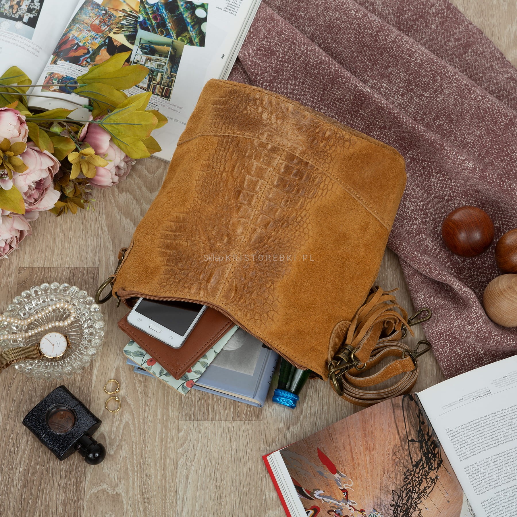VERA PELLE torebka damska zamszowa listonoszka z paskiem i frędzelkiem kroko V479 camel