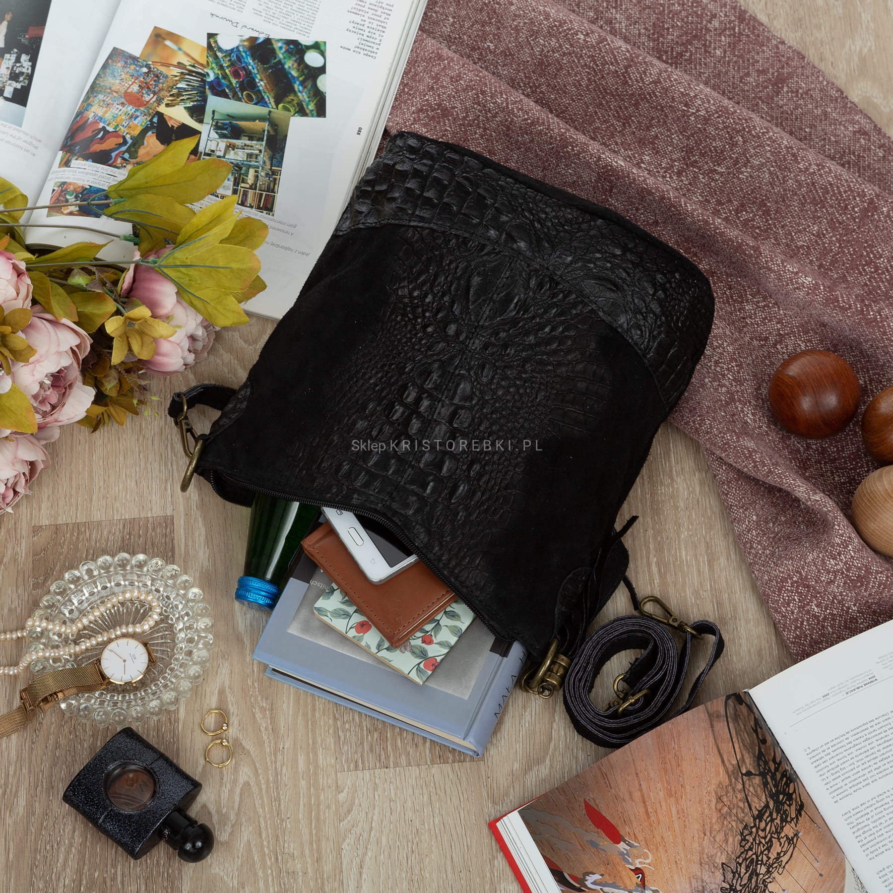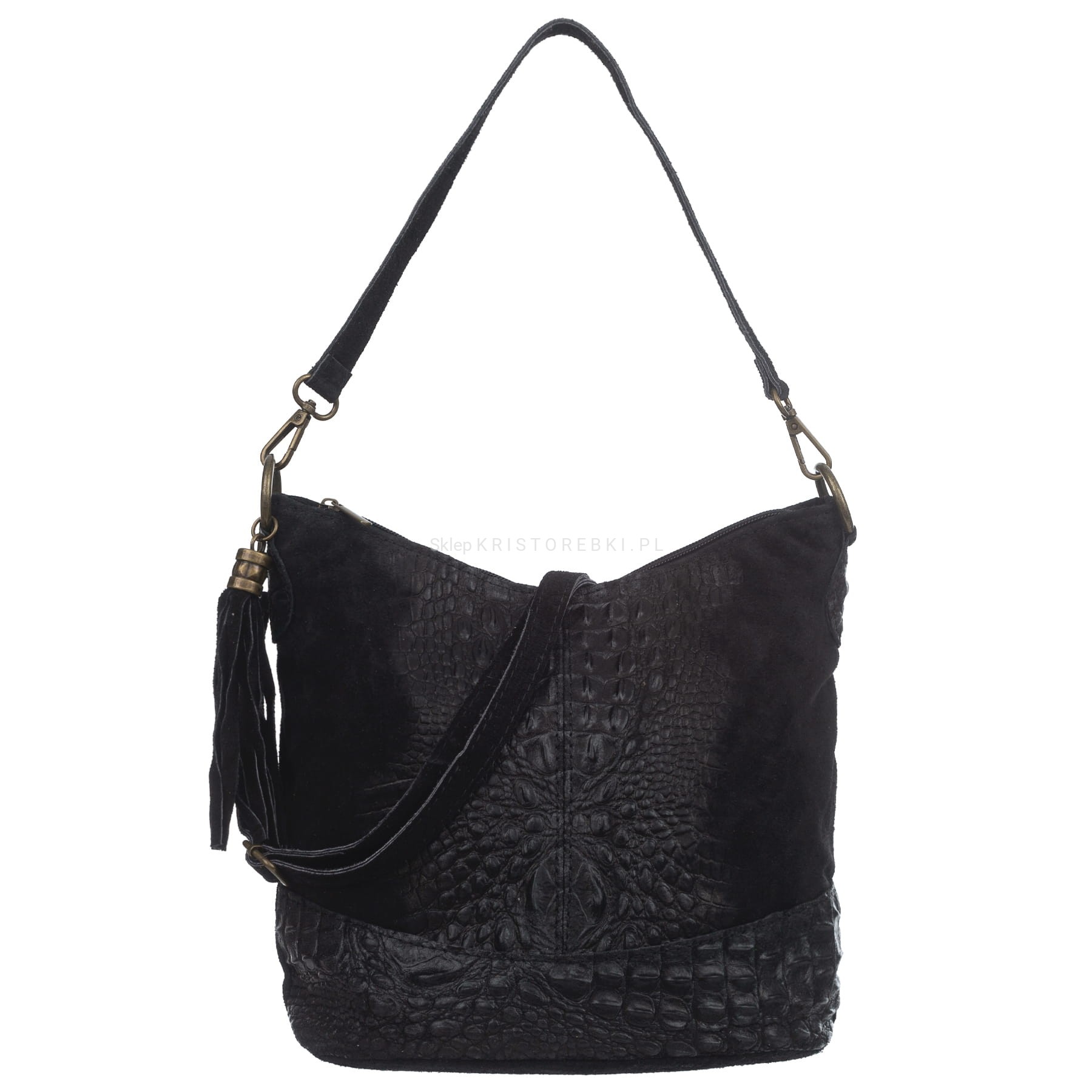 Włoska skórzana torebka damska typu worek znanej i cenionej marki VERA PELLE ITALY w kolorze CZARNYM. Wykonana została bardzo starannie z wysokiej jakości zamszowej skóry naturalnej. Wygląda niezwykle oryginalnie dzięki ciekawemu połączeniu zamszu z fakturą imitującą skórę krokodyla. Torebka posiada wygodny krótki pasek do noszenia torebki w ręku a dodatkowy długi, odpinany i regulowany pasek pozwala ją nosić również wygodnie na ramieniu. Torebka posiada okucia w kolorze mosiężnym. Z tyłu torebki znajduje się duża i funkcjonalna kieszeń zamykana na suwak a po boku torebki przyczepiony jest ozdobny frędzelek. Środek zamykany jest na suwak oraz wykończony wysokiej jakości podszewką. Torebka posiada jedną, zamykaną na suwak komorę, wewnątrz której znajduje się mała, boczna, zasuwana kieszonka. Dodatkowo w środku znajduje się funkcjonalna osobna kieszonka na telefon lub dokumenty. Torebka jest bardzo wygodna w codziennym użytkowaniu a jej wygląda sprawia, że będzie pasowała do większości codziennych stylizacji. Jest lekka, a jej kształt i materiał sprawiają, że jest bardzo wygodna w użytkowaniu.
