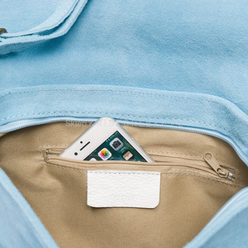 Włoska skórzana torebka listonoszka marki VERA PELLE ITALY w kolorze NIEBIESKIM. Wyprodukowana została z najwyższej jakości, pięknie pachnącej i miłej w dotyku skóry naturalnej zamszowej z dbałością o najmniejsze szczegóły. Zamykana jest na klapę z magnesikiem. Środek zamykany jest na suwak i wykończony podszewką. Dzięki regulowanemu paskowi idealnie dopasujesz ją do swoich preferencji. Z tyłu torebki znajduje się dodatkowa kieszonka zamykana na suwak.