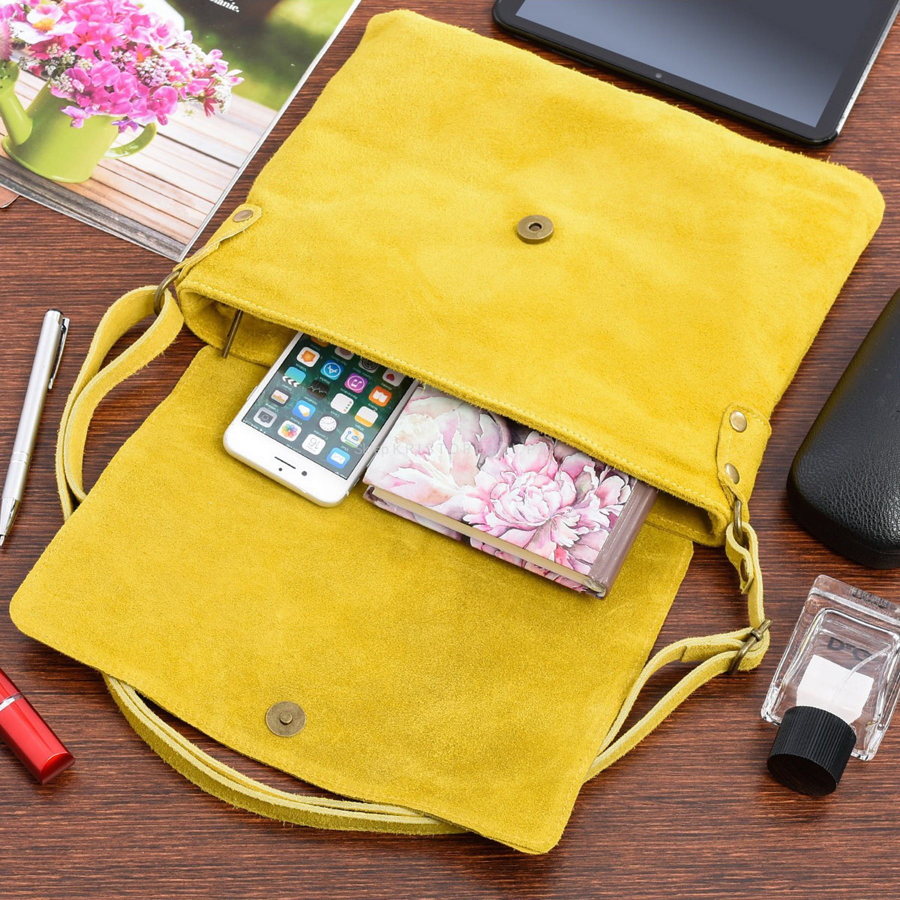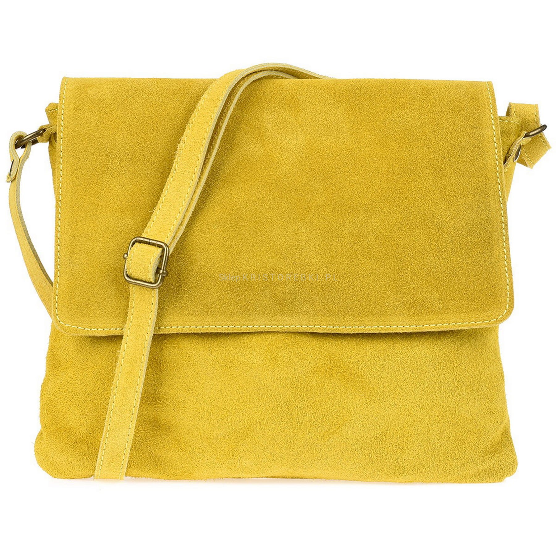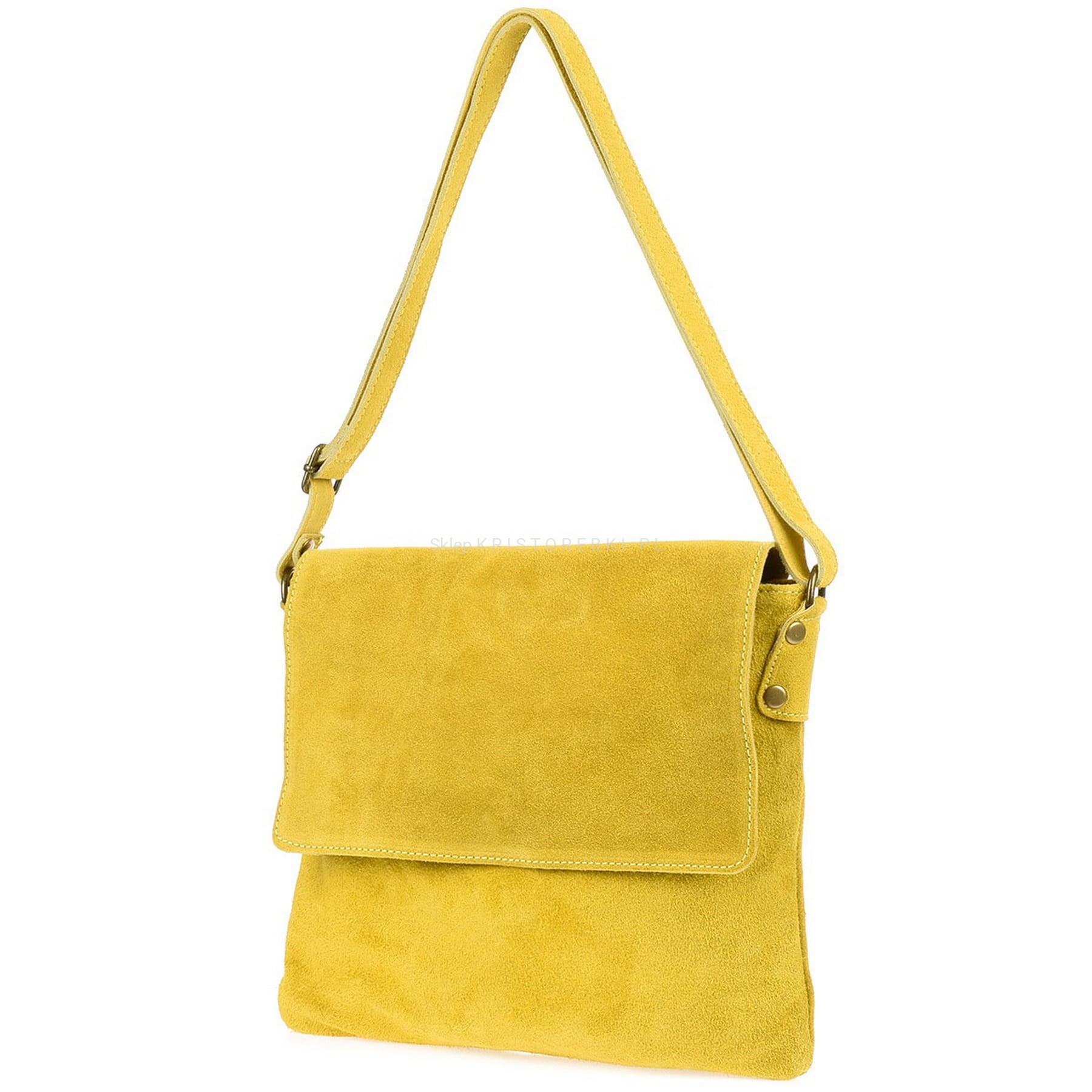 VERA PELLE torebka damska zamszowa listonoszka z klapą i paskiem V480 żółta