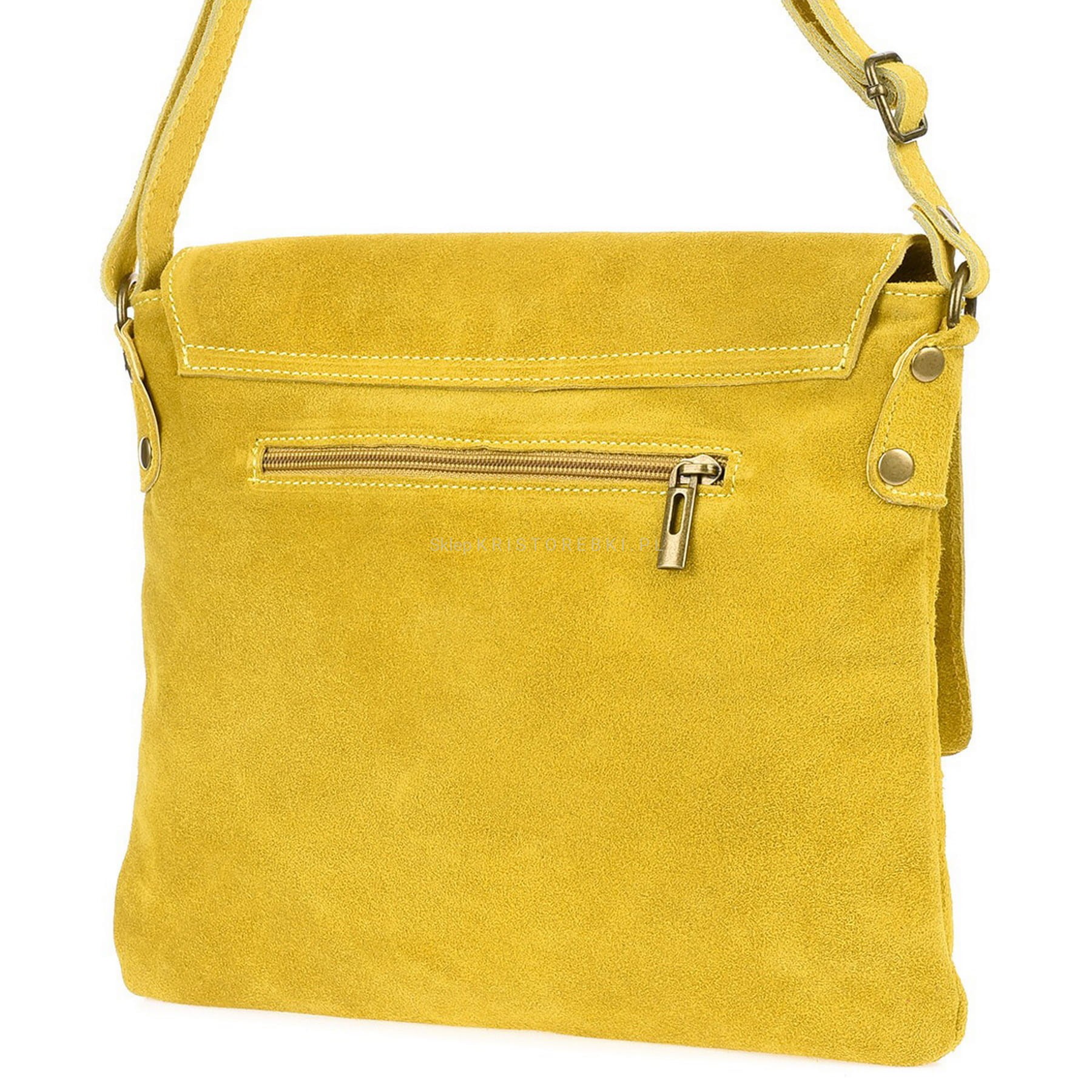 Włoska skórzana torebka listonoszka marki VERA PELLE ITALY w kolorze ŻÓŁTYM. Wyprodukowana została z najwyższej jakości, pięknie pachnącej i miłej w dotyku skóry naturalnej zamszowej z dbałością o najmniejsze szczegóły. Zamykana jest na klapę z magnesikiem. Środek zamykany jest na suwak i wykończony podszewką. Dzięki regulowanemu paskowi idealnie dopasujesz ją do swoich preferencji. Z tyłu torebki znajduje się dodatkowa kieszonka zamykana na suwak.