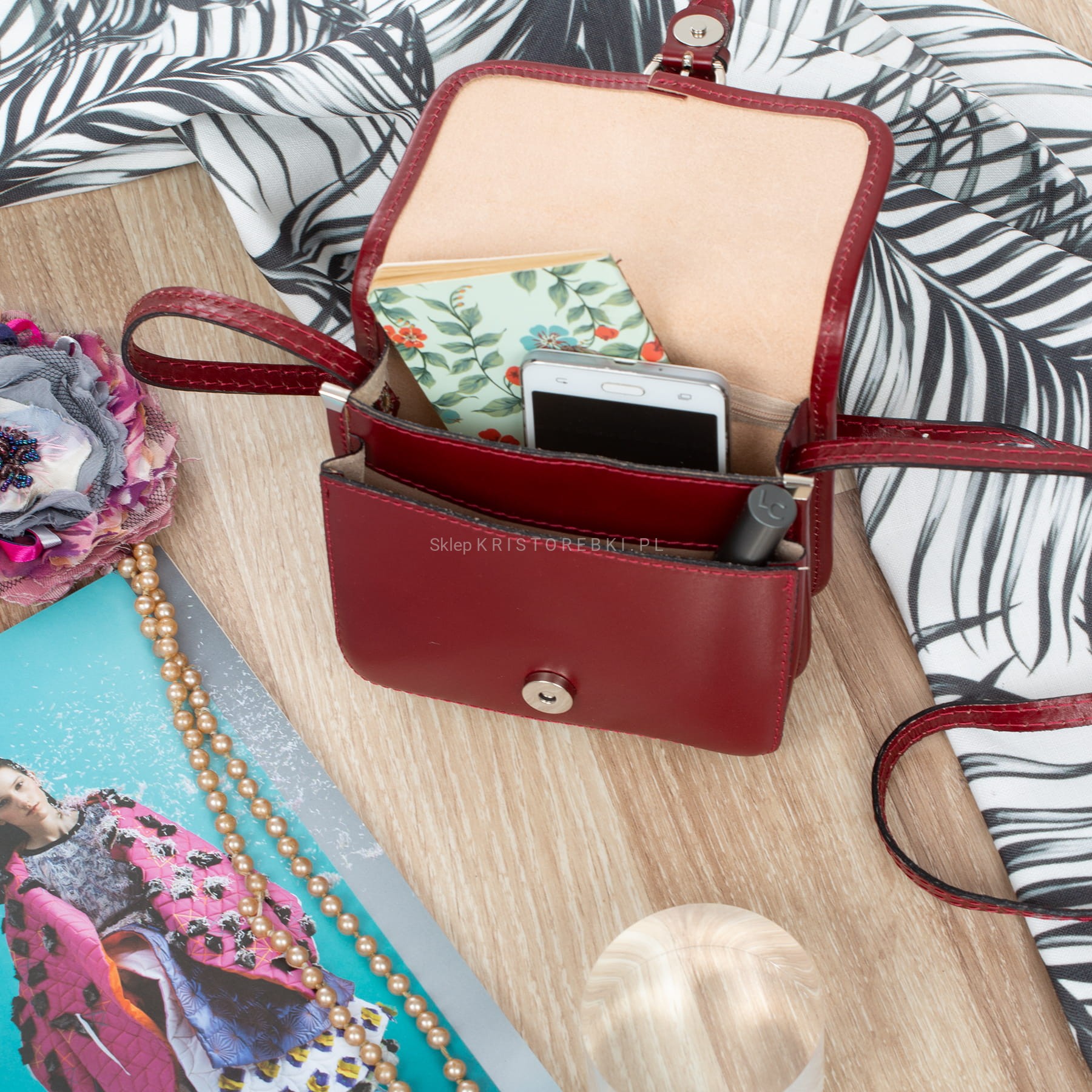 Torebka damska, listonoszka znanej i cenionej marki VERA PELLE ITALY w kolorze BORDOWYM. Torebka wykonana jest z najwyższej jakości skóry naturalnej licowej produkcji włoskiej. Zaletą torebki jest jej nietuzinkowy wygląd oraz ciekawa przednia klapa. Zamykana jest na magnesik i usztywniona, dzięki czemu nawet bez wypełnienia pięknie trzyma swój kształt. Jest mała (nie mieści formatu A4) i zgrabna, dzięki czemu będzie praktyczna w użytkowaniu i sprawdzi się na wszystkie eleganckie jak i mniej formalne wyjścia. Mimo niedużego rozmiaru bez trudu pomieści wszystkie najpotrzebniejsze rzeczy damskie. Posiada długi i regulowany pasek, dzięki czemu bez trudu dopasujesz ja do swoich preferencji.