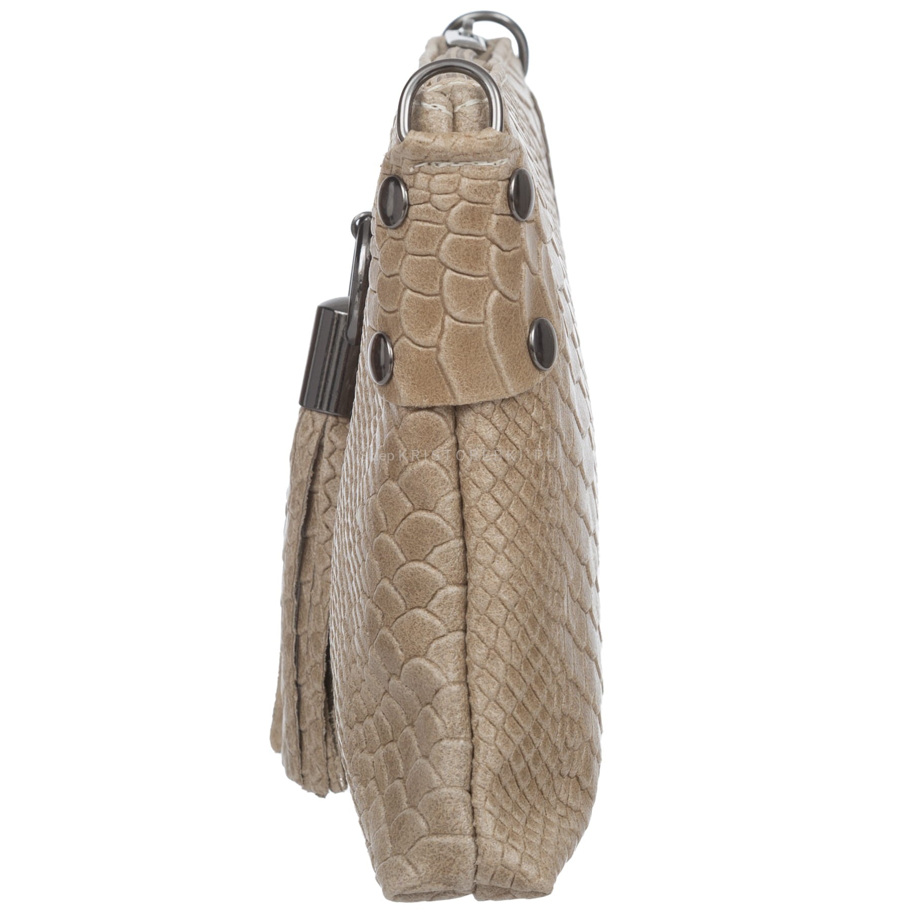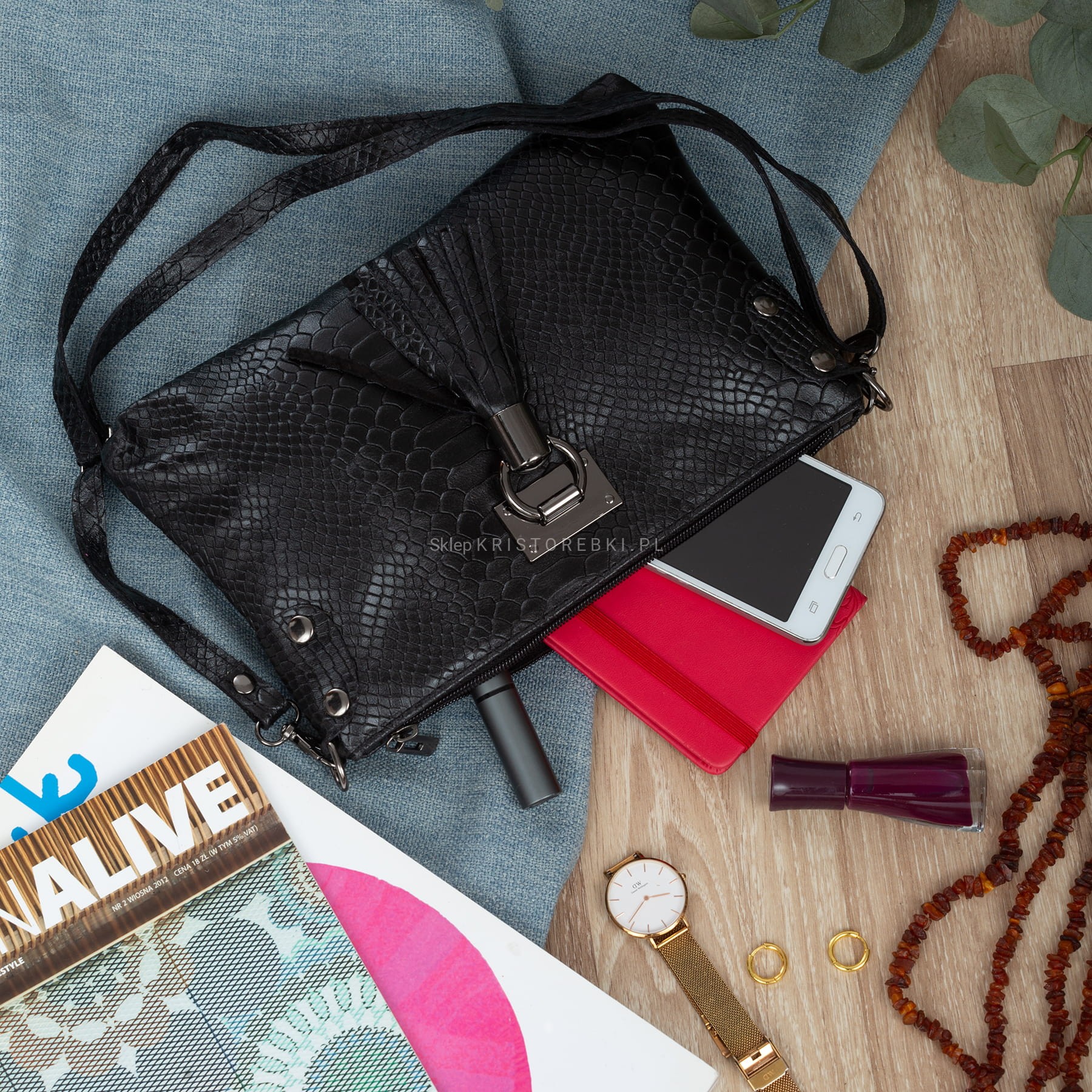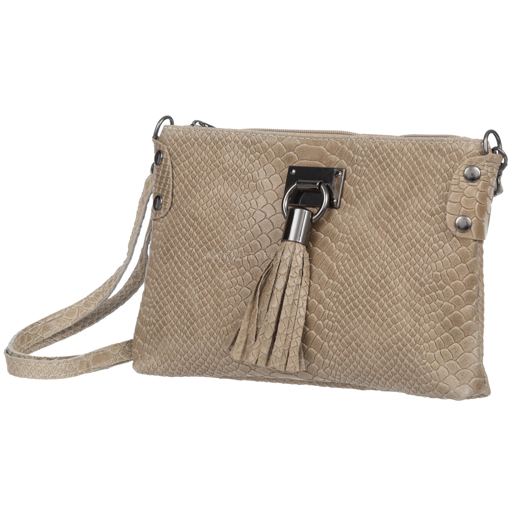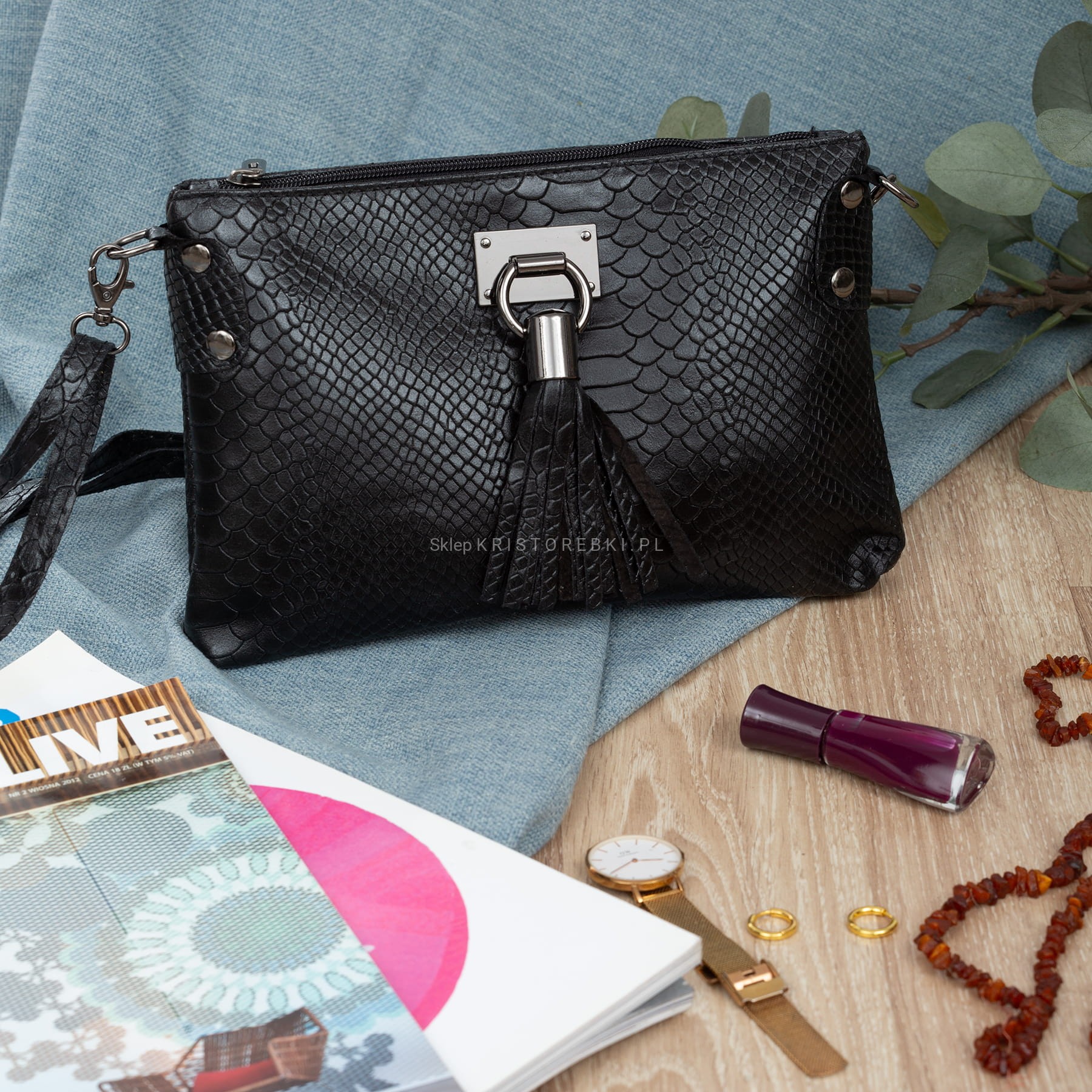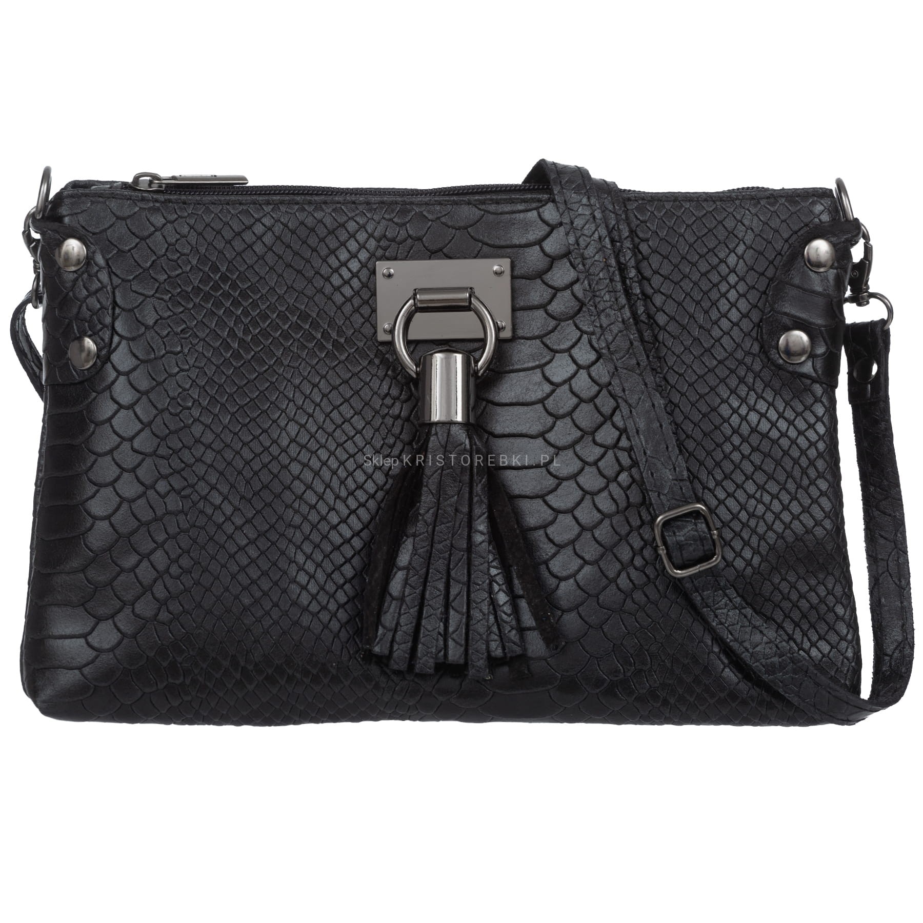 VERA PELLE torebka damska skórzana listonoszka kroko z paskiem i frędzelkiem V487 czarna