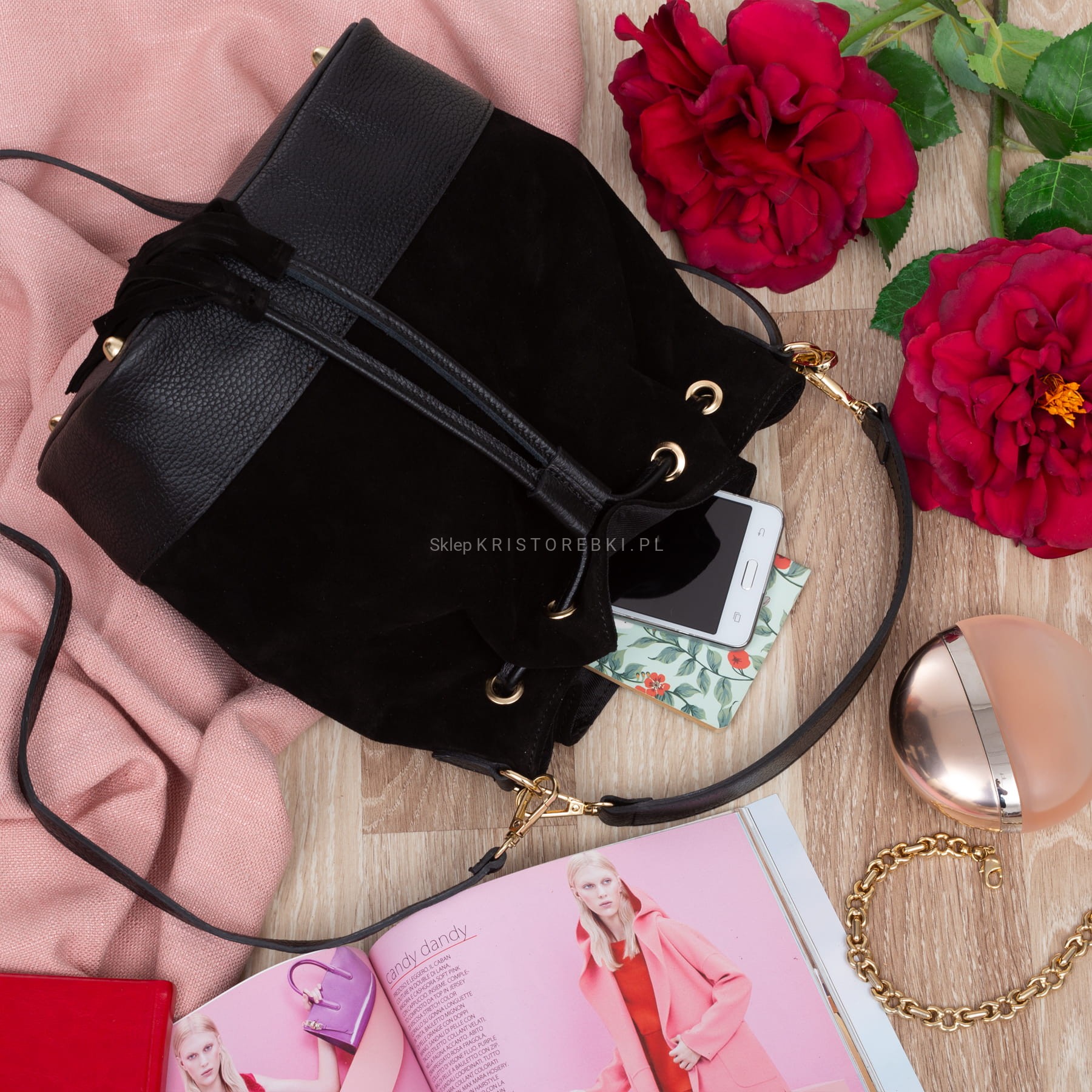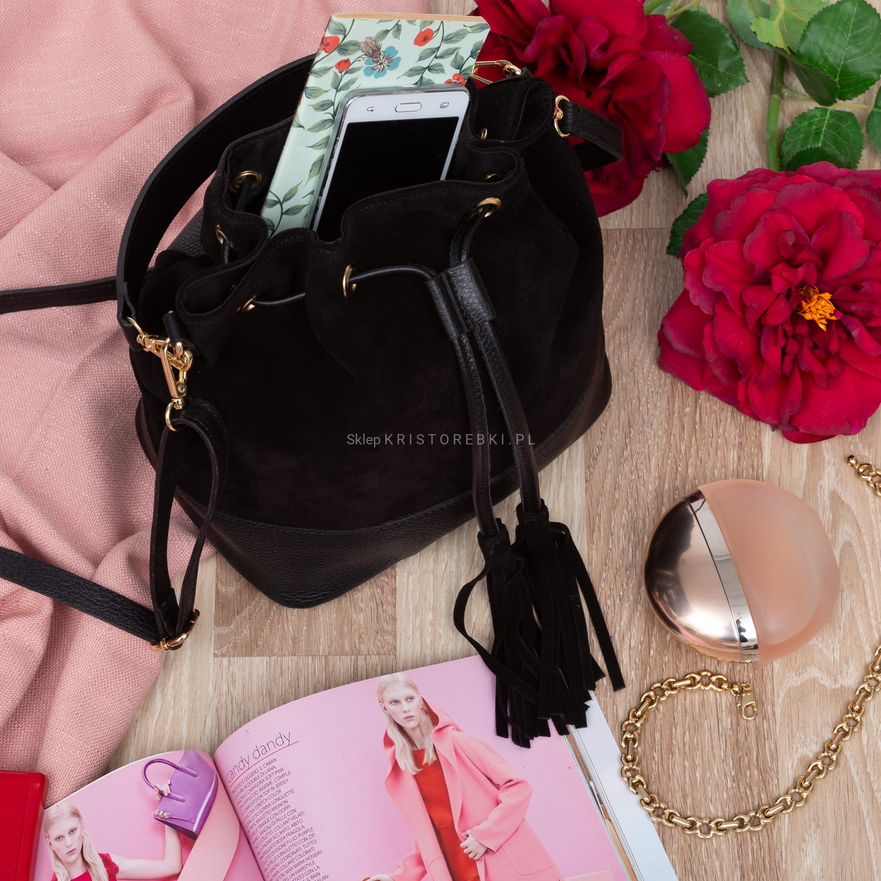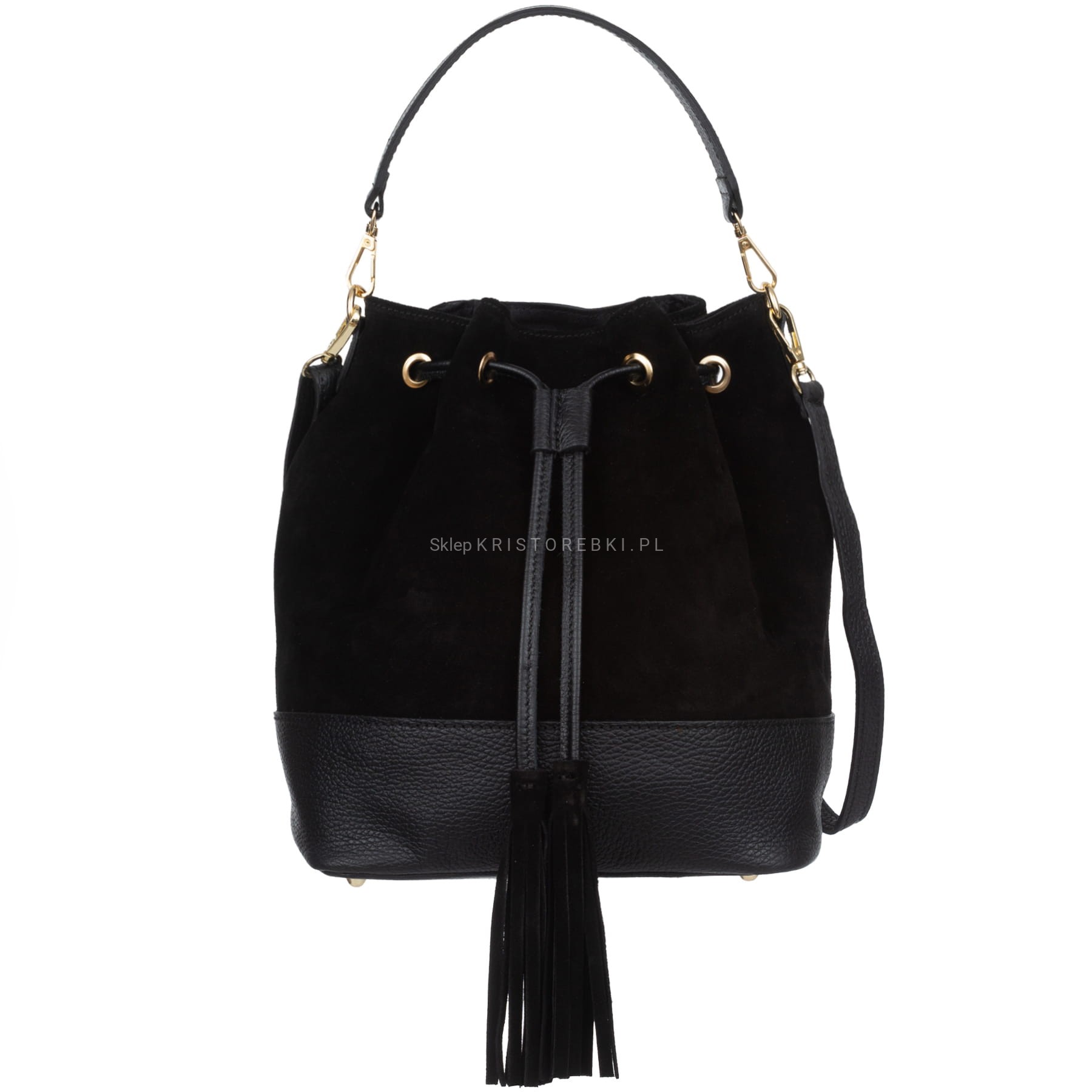 Torebka damska typu kuferek znanej i cenionej na rynku europejskim marki VERA PELLE ITALY w kolorze CZARNYM. Torebka została uszyta z wysokogatunkowej skóry naturalnej zamszowej. Spód, dół i tył torebki wykończony jest tradycyjną skórą naturalną. Torebka posiada okucia w kolorze złotym oraz zapinana jest na ściągany troczek zakończony ozdobnymi frędzelkami. Środek torebki wykończony jest praktyczną podszewką. Dodatkowo w środku znajdziesz praktyczną kieszonkę na telefon lub dokumenty. Do torebki dołączona jest odpinana krótka rączka, dzięki czemu możesz ją wygodnie nosić w ręku a w razie potrzeby ją odpiąć i schować do środka. Dodatkowo do torebki dołączony jest regulowany i odpinany, długi pasek, dzięki czemu można ją nosić również na ramieniu i dostosować do własnych preferencji. Spód torebki chronią praktyczne nóżki ochronne. Torebka ma ciekawy i elegancki wygląd i będzie świetnym dopełnieniem codziennych i wizytowych stylizacji.