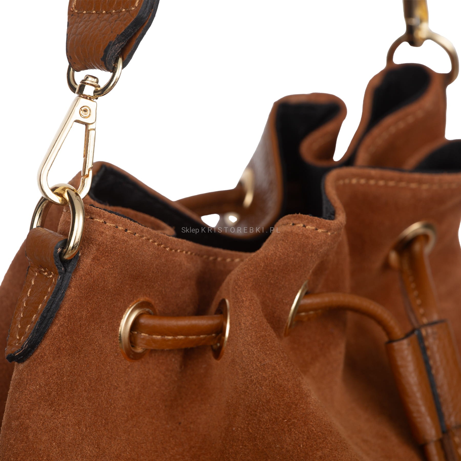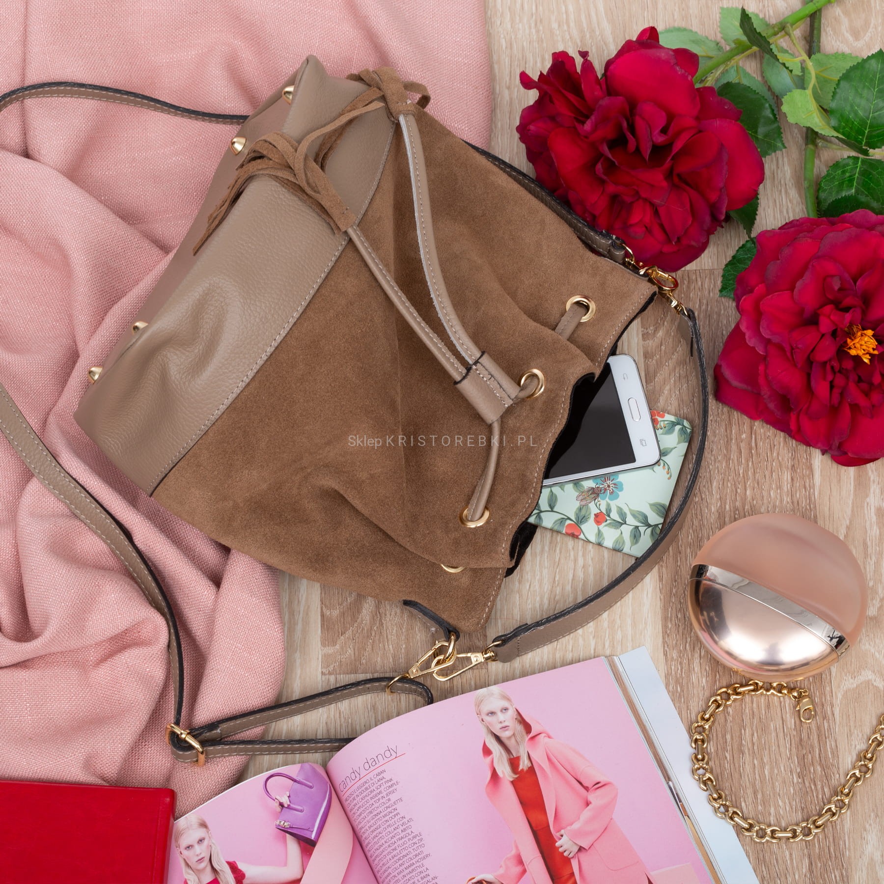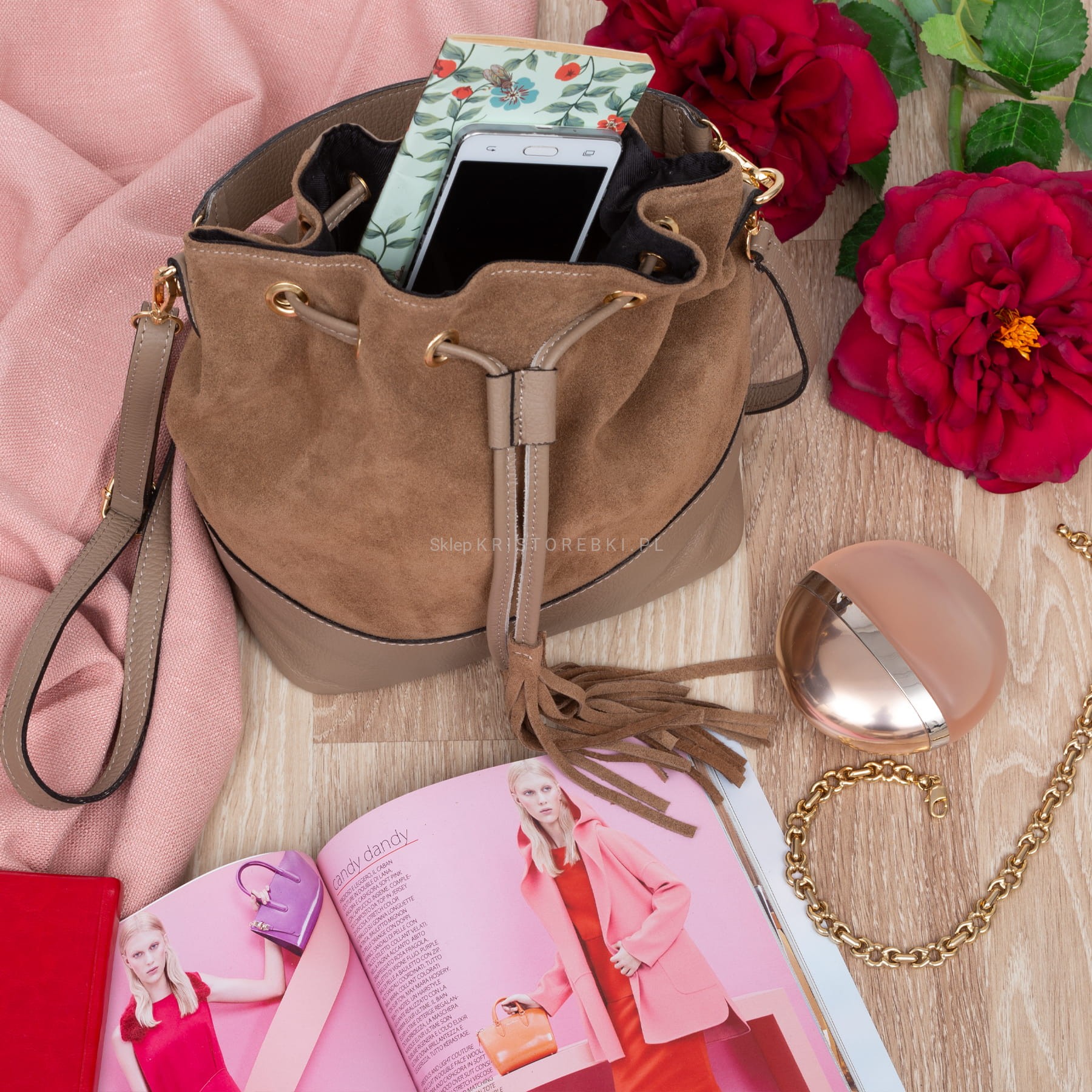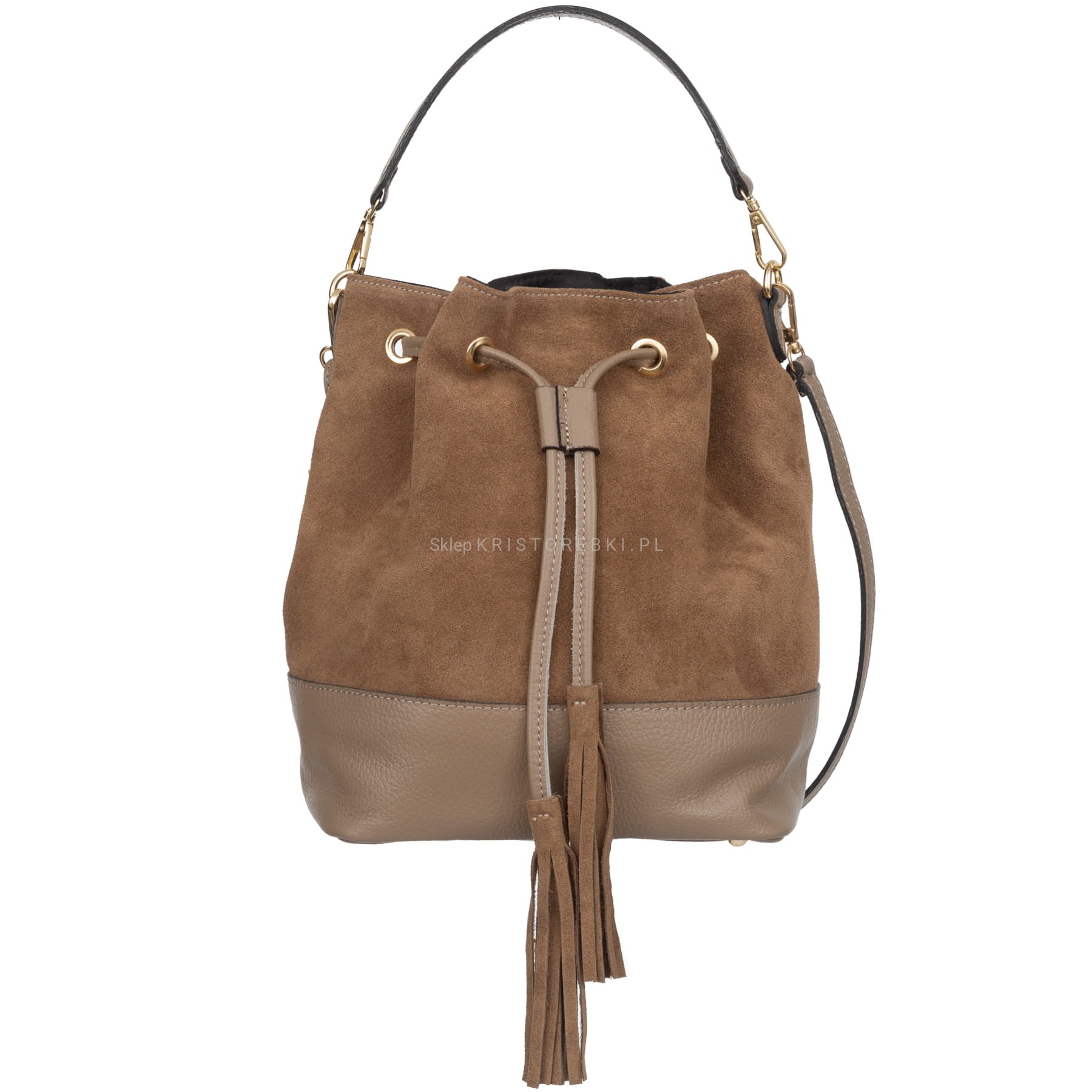Torebka damska typu kuferek znanej i cenionej na rynku europejskim marki VERA PELLE ITALY w kolorze TAUPE. Torebka została uszyta z wysokogatunkowej skóry naturalnej zamszowej. Spód, dół i tył torebki wykończony jest tradycyjną skórą naturalną. Torebka posiada okucia w kolorze złotym oraz zapinana jest na ściągany troczek zakończony ozdobnymi frędzelkami. Środek torebki wykończony jest praktyczną podszewką. Dodatkowo w środku znajdziesz praktyczną kieszonkę na telefon lub dokumenty. Do torebki dołączona jest odpinana krótka rączka, dzięki czemu możesz ją wygodnie nosić w ręku a w razie potrzeby ją odpiąć i schować do środka. Dodatkowo do torebki dołączony jest regulowany i odpinany, długi pasek, dzięki czemu można ją nosić również na ramieniu i dostosować do własnych preferencji. Spód torebki chronią praktyczne nóżki ochronne. Torebka ma ciekawy i elegancki wygląd i będzie świetnym dopełnieniem codziennych i wizytowych stylizacji.