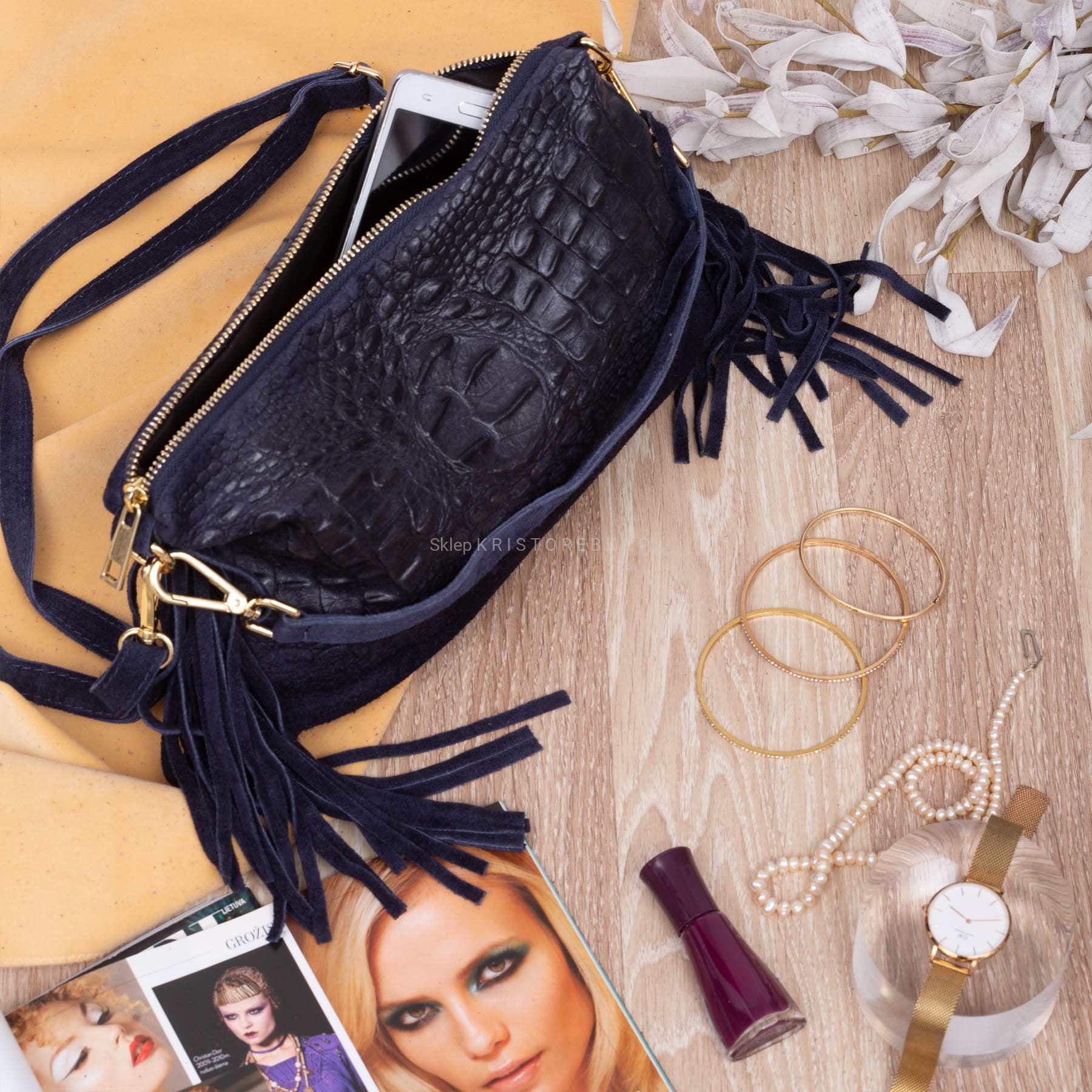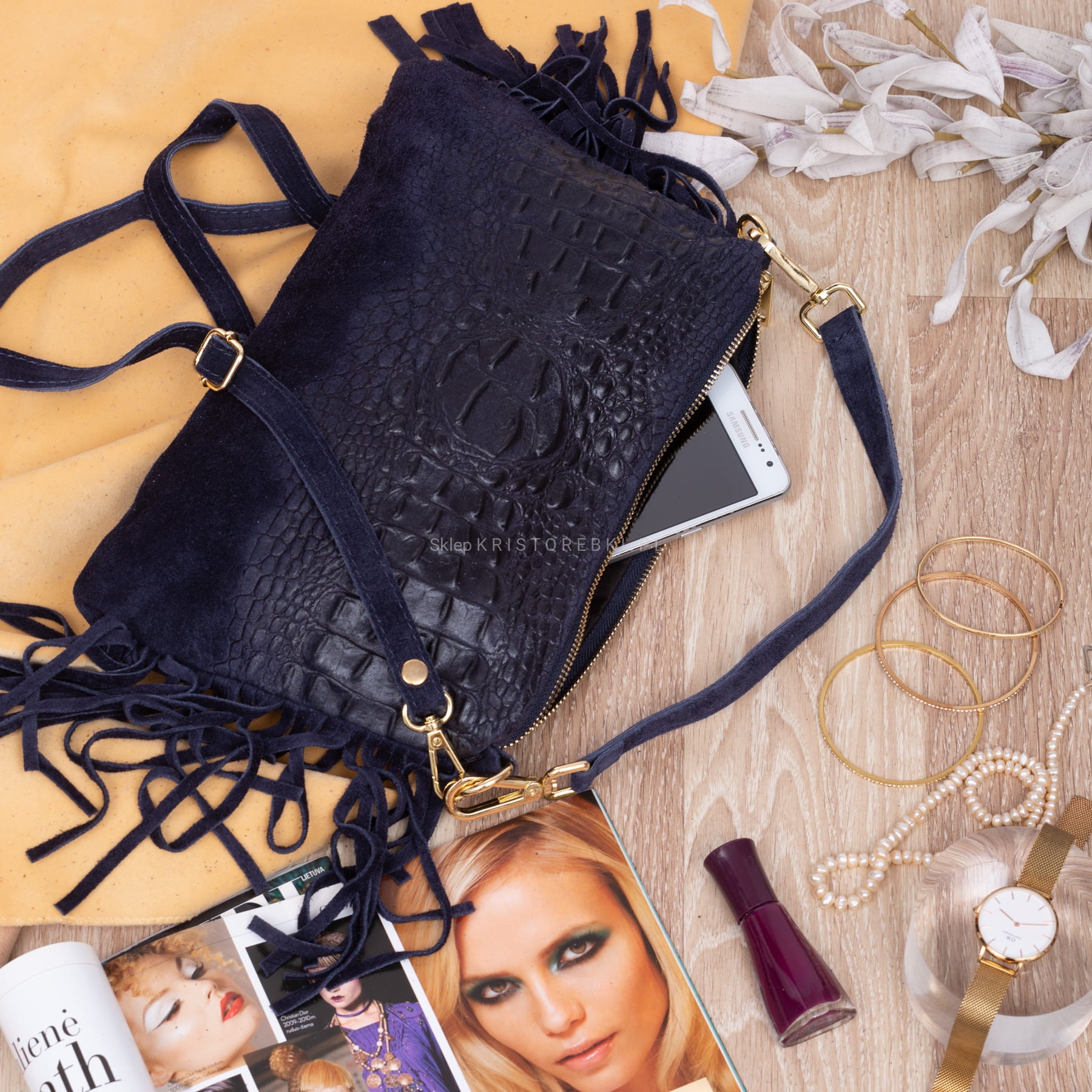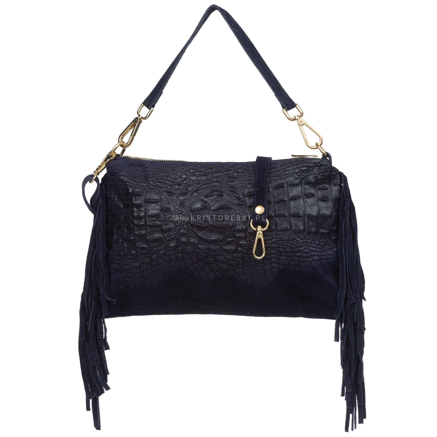 VERA PELLE torebka damska zamszowa listonoszka kroko z frędzlami i paskiem V492 granatowa