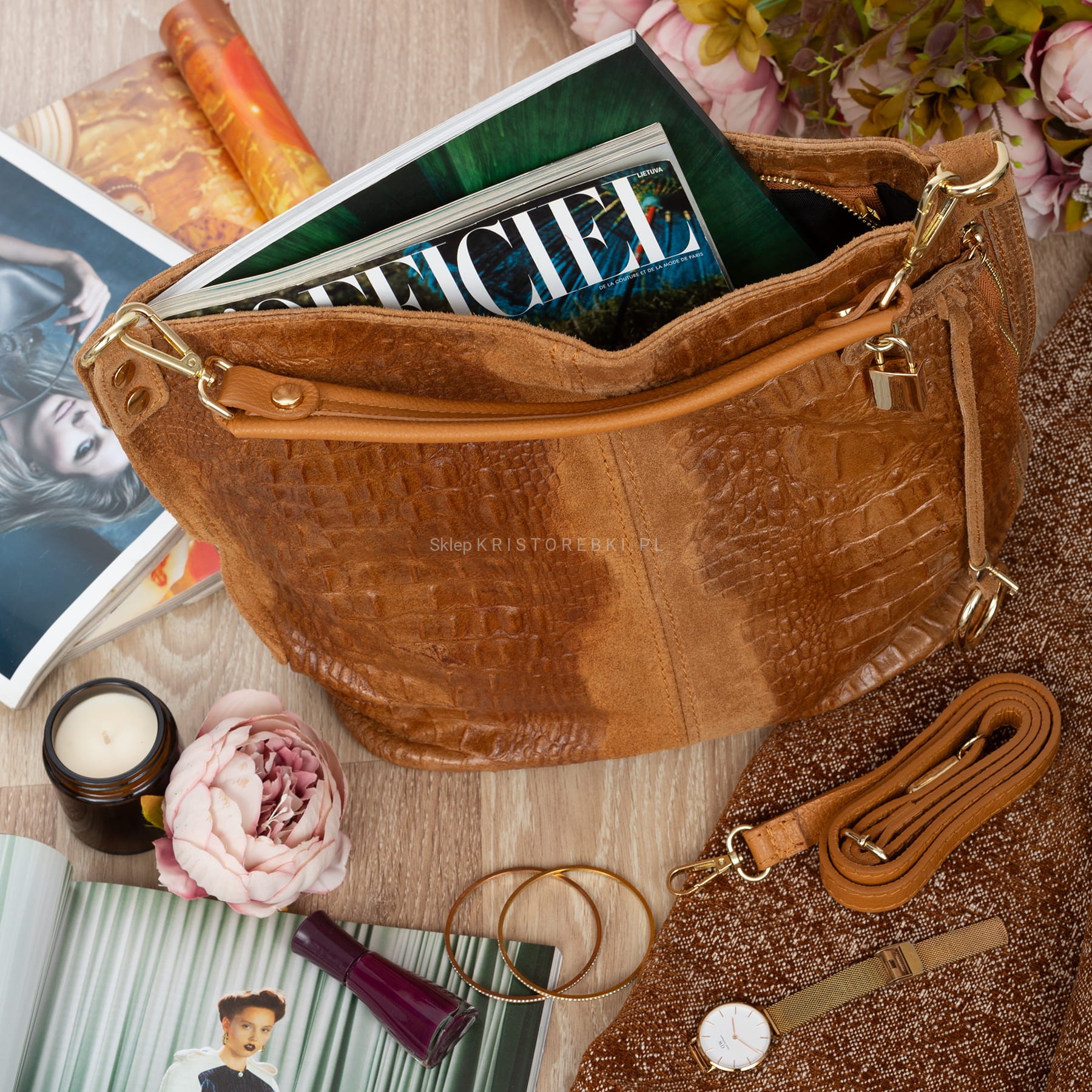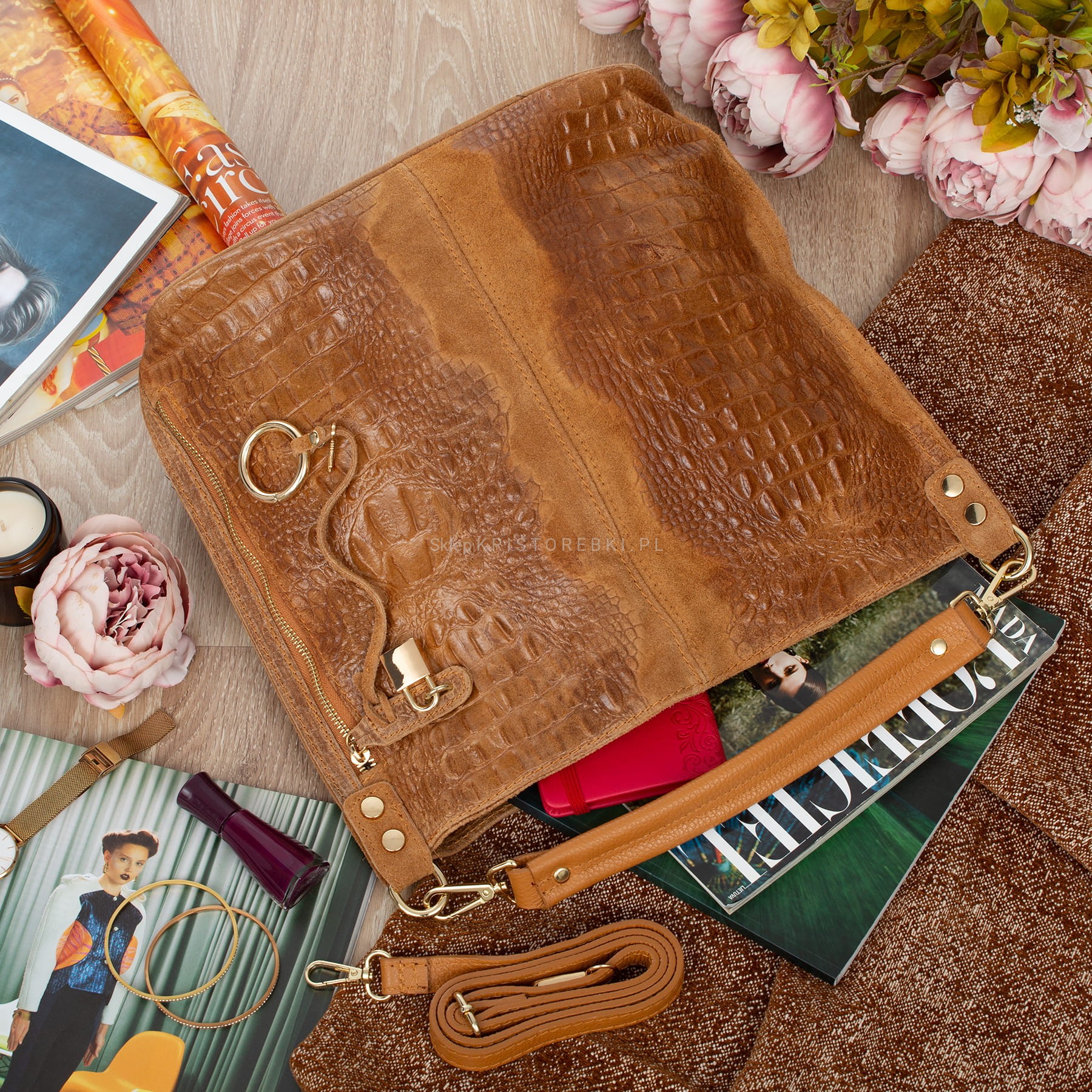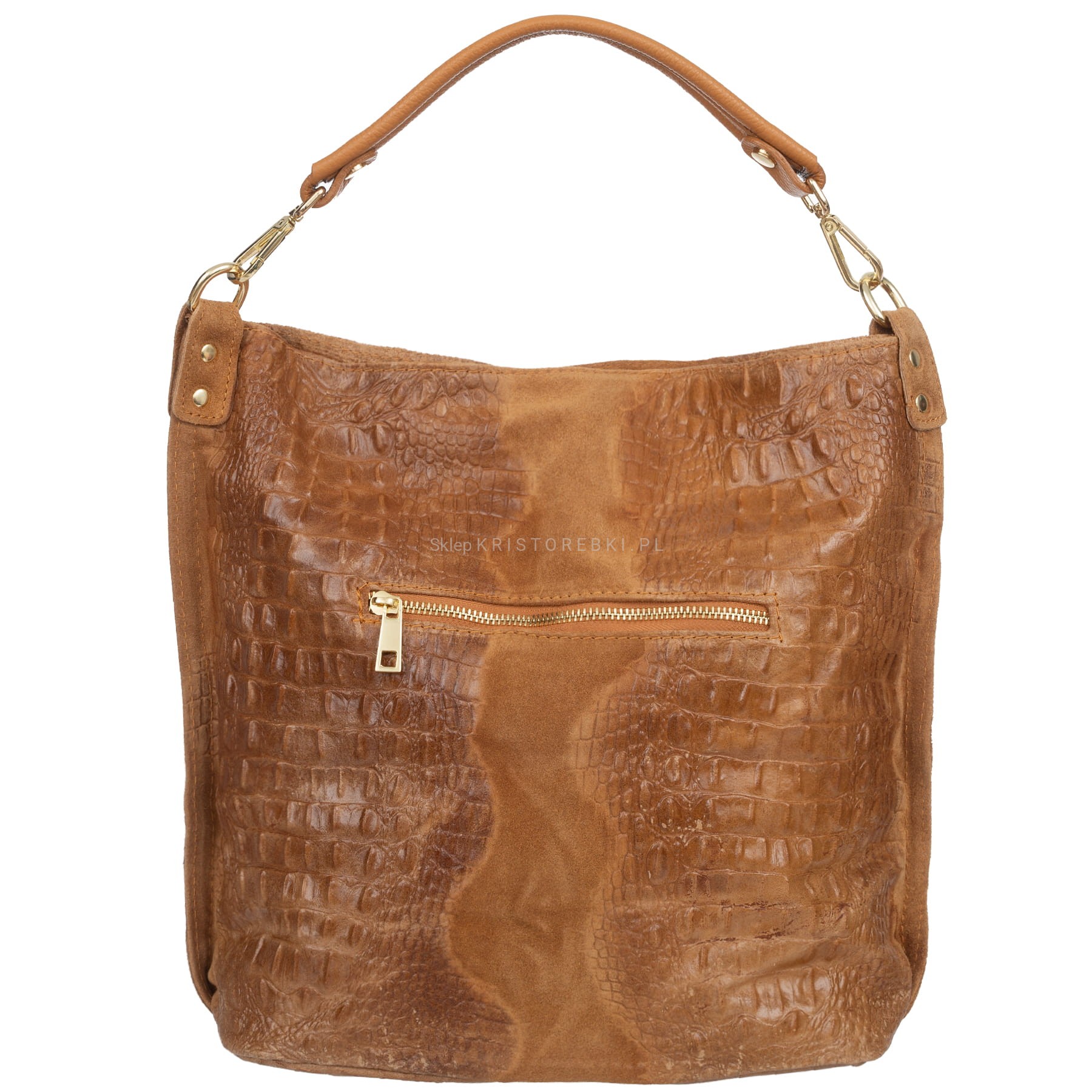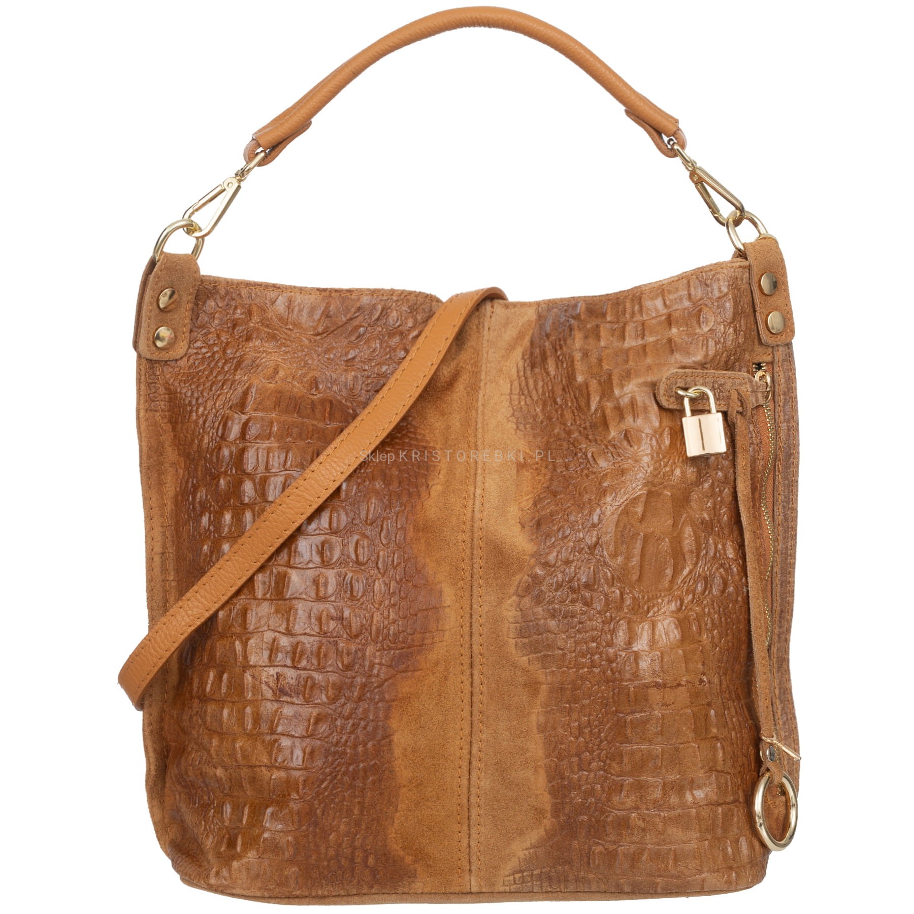 Włoska skórzana torebka damska typu worek shopper znanej i cenionej marki VERA PELLE ITALY w kolorze CAMEL. Wykonana została bardzo starannie z wysokiej jakości zamszowej skóry naturalnej z ozdobnymi tłoczeniami. Torebka posiada wygodną rączkę do noszenia w ręku a dodatkowy długi, odpinany i regulowany pasek pozwala ją nosić również wygodnie na ramieniu. Torebka posiada okucia w kolorze złotym. Jest duża i pojemna, dzięki czemu bez trudu pomieści format A4. Po prawej stronie torebki znajduje się duża i funkcjonalna kieszeń zamykana na suwak zabezpieczona kłódeczką. Środek zamykany jest na suwak oraz wykończony wysokiej jakości podszewką. W środku posiada jedną dużą komorę na boku której znajduje się dodatkowo duża przegroda zamykana na suwak. Na bocznej dodatkowo z jednej strony znajduje się praktyczna kieszeń zamykana na suwak a z drugiej strony znajdują się dwie otwarte kieszenie na telefon, dokumenty lub inne drobiazgi. Z tyłu torebki znajdziesz kolejną praktyczną, zamykaną na suwak dużą kieszeń. Torebka jest bardzo wygodna w codziennym użytkowaniu a jej wygląda sprawia, że będzie pasowała do większości codziennych stylizacji.