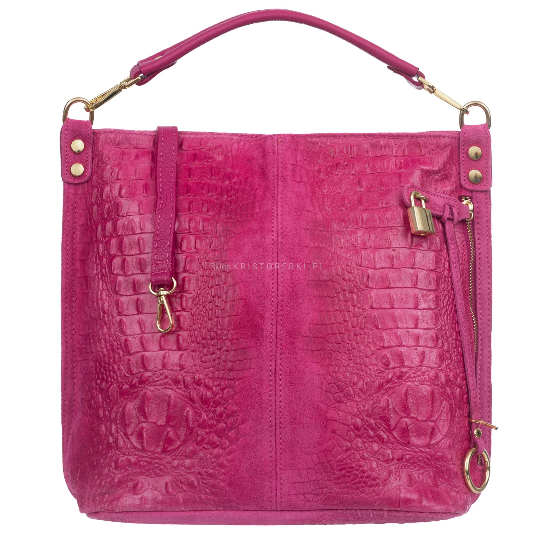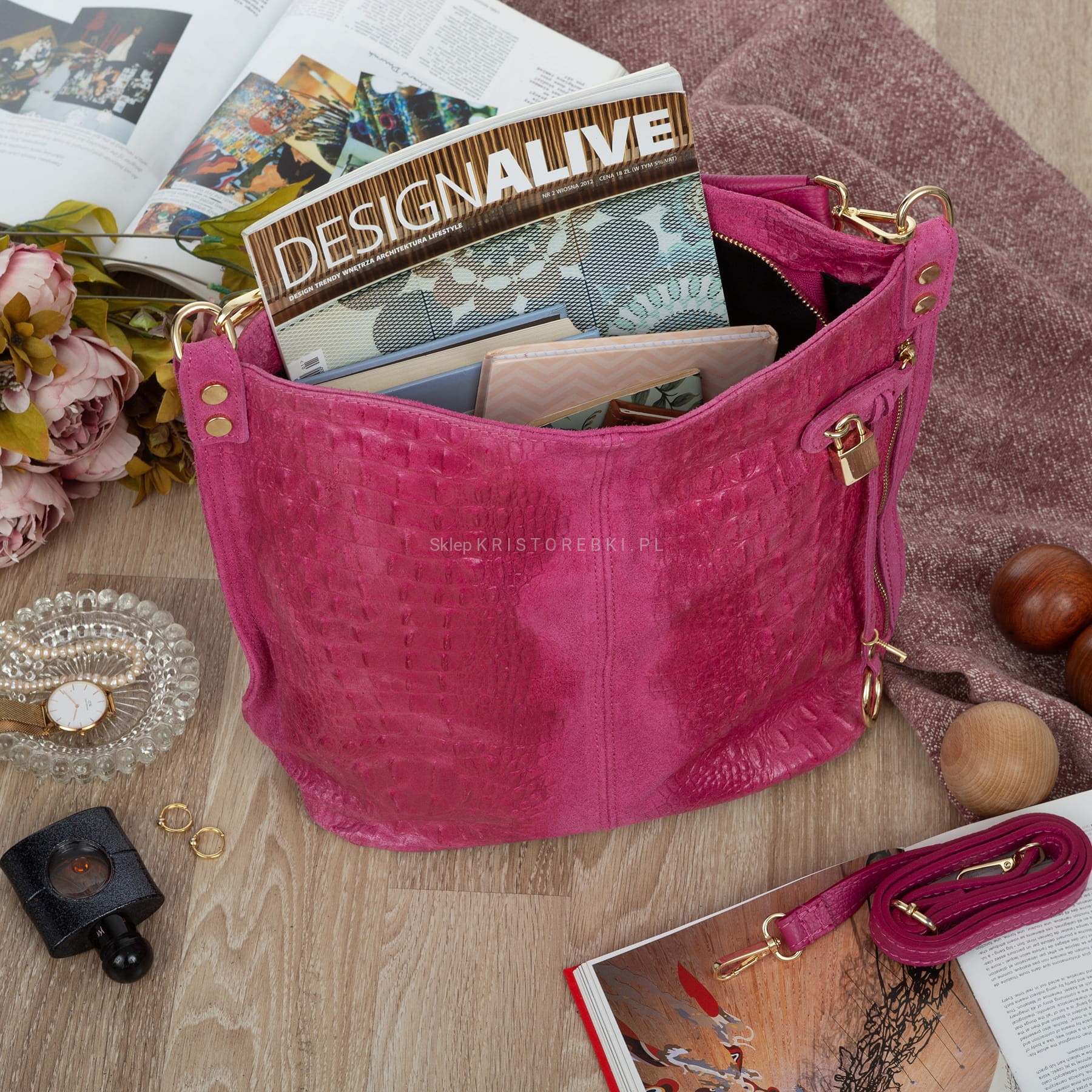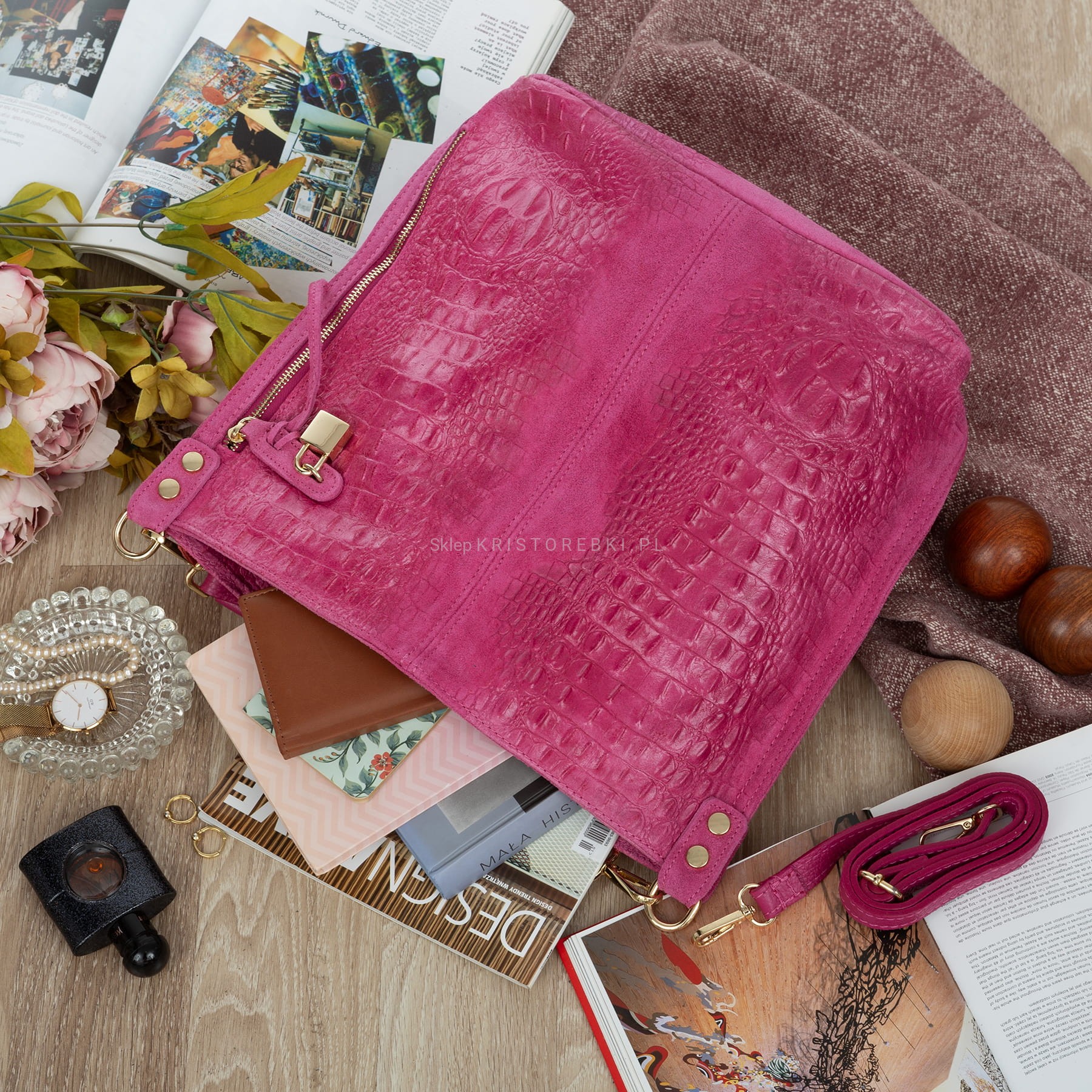 Włoska skórzana torebka damska typu worek shopper znanej i cenionej marki VERA PELLE ITALY w kolorze FUKSJI. Wykonana została bardzo starannie z wysokiej jakości zamszowej skóry naturalnej z ozdobnymi tłoczeniami. Torebka posiada wygodną rączkę do noszenia w ręku a dodatkowy długi, odpinany i regulowany pasek pozwala ją nosić również wygodnie na ramieniu. Torebka posiada okucia w kolorze złotym. Jest duża i pojemna, dzięki czemu bez trudu pomieści format A4. Po prawej stronie torebki znajduje się duża i funkcjonalna kieszeń zamykana na suwak zabezpieczona kłódeczką. Środek zamykany jest na suwak oraz wykończony wysokiej jakości podszewką. W środku posiada jedną dużą komorę na boku której znajduje się dodatkowo duża przegroda zamykana na suwak. Na bocznej dodatkowo z jednej strony znajduje się praktyczna kieszeń zamykana na suwak a z drugiej strony znajdują się dwie otwarte kieszenie na telefon, dokumenty lub inne drobiazgi. Z tyłu torebki znajdziesz kolejną praktyczną, zamykaną na suwak dużą kieszeń. Torebka jest bardzo wygodna w codziennym użytkowaniu a jej wygląda sprawia, że będzie pasowała do większości codziennych stylizacji.
