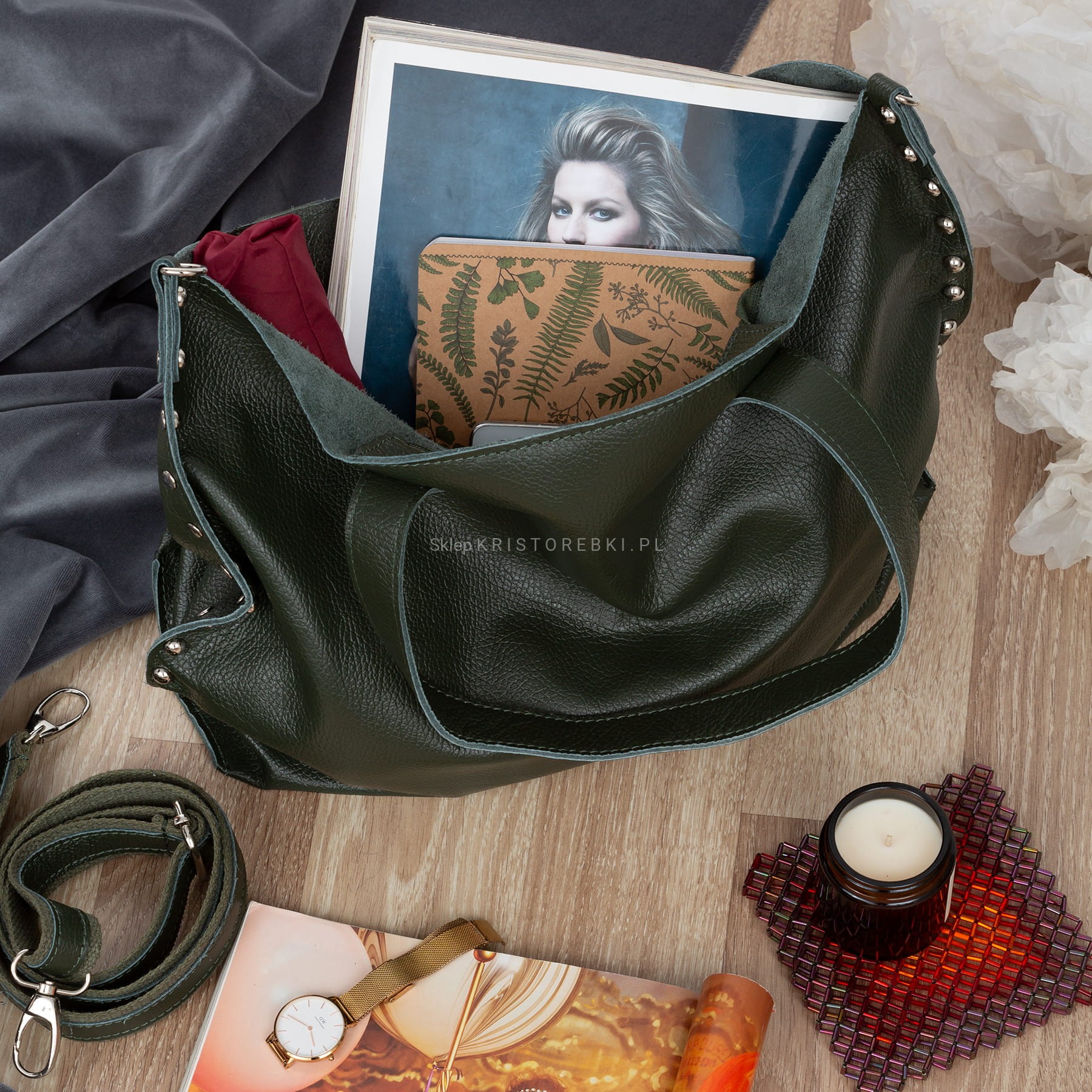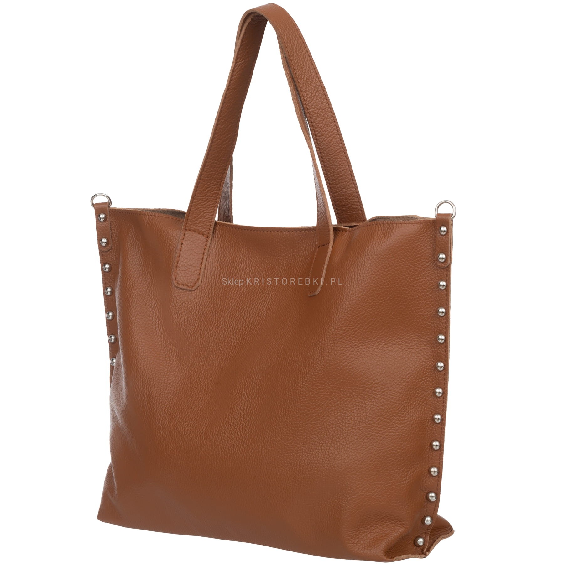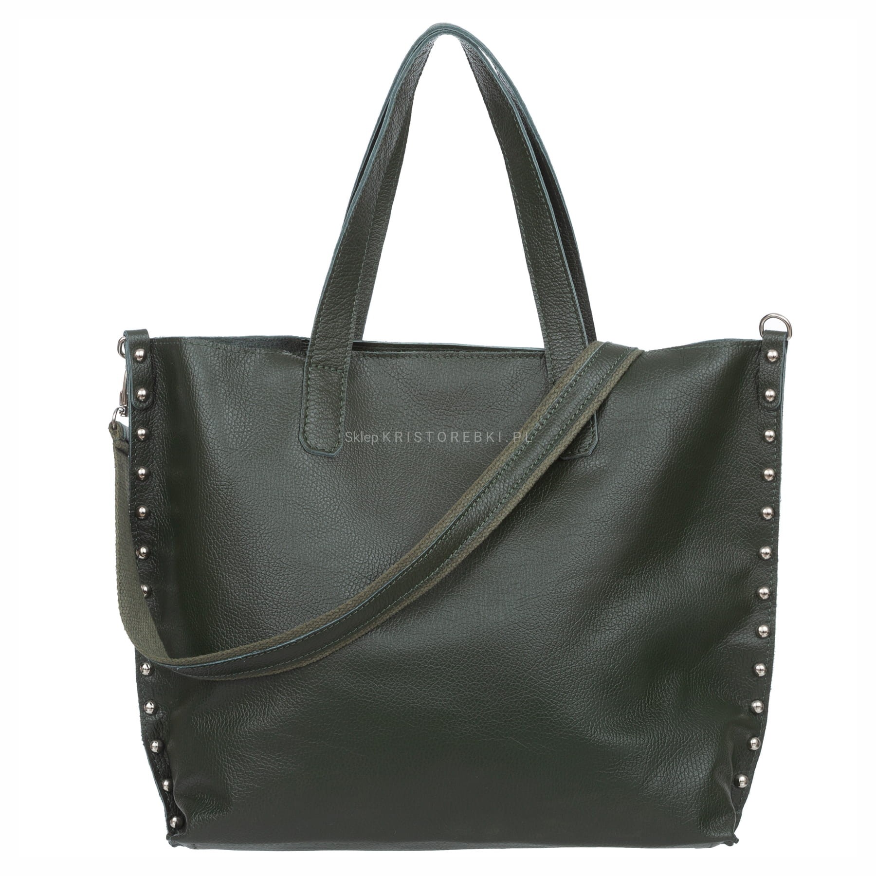 VERA PELLE torebka damska skórzana shopper z ćwiekami i paskiem na ramię V494 ciemna zielona