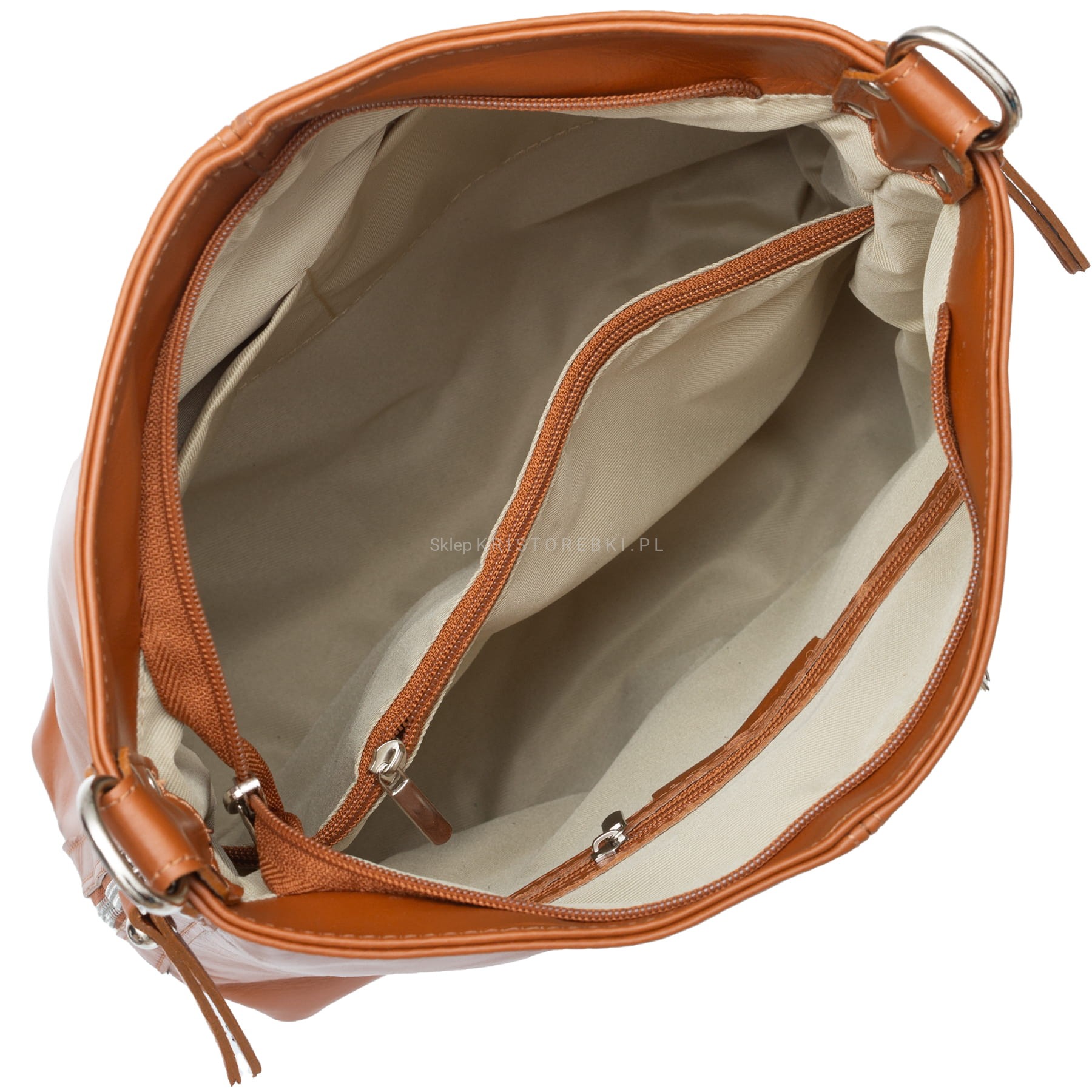 | Cechy wnętrza | w środku podszewka + przegroda zamykana na suwak + kieszonka na suwak + dwie otwarte kieszonki na telefon i dokumenty |