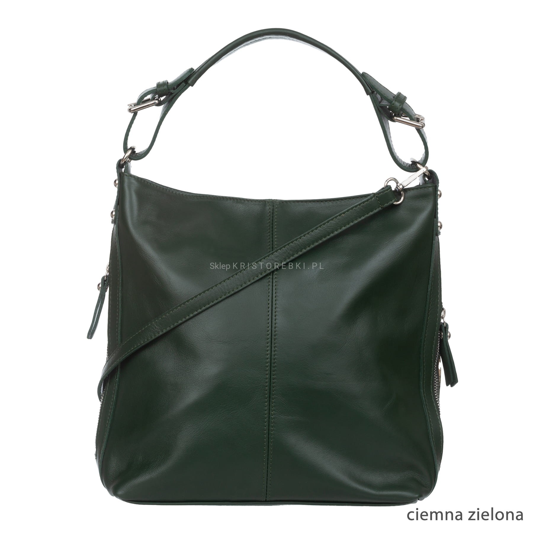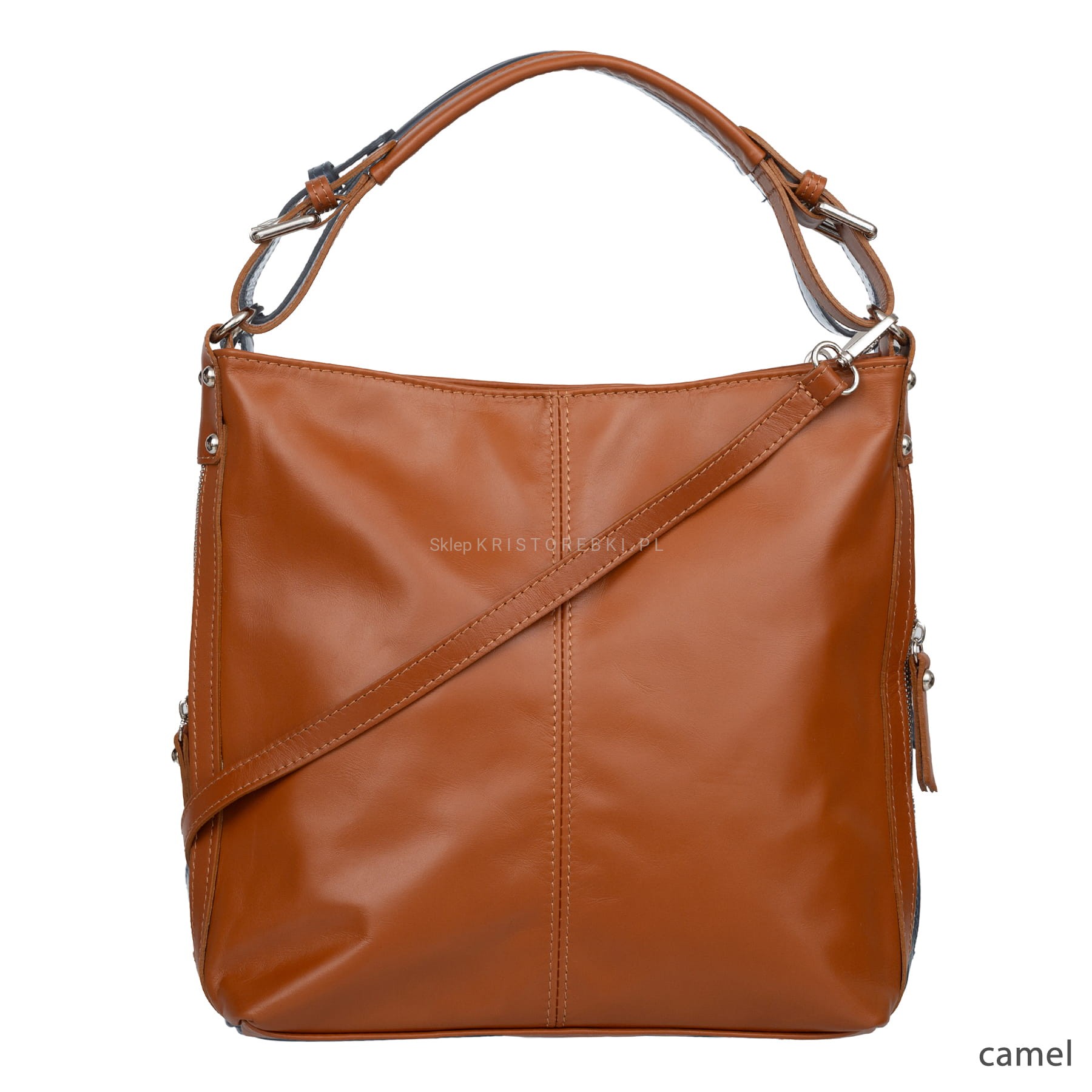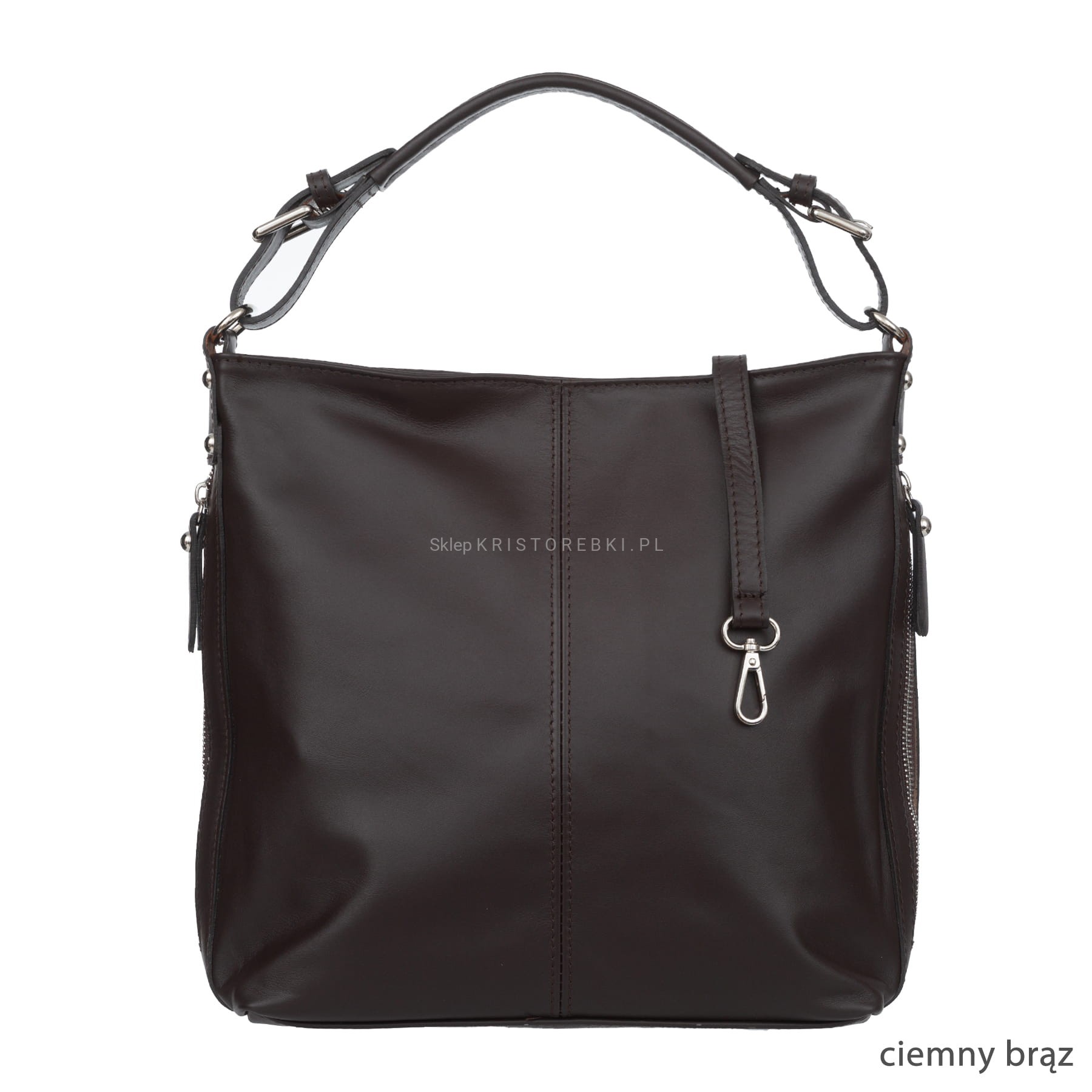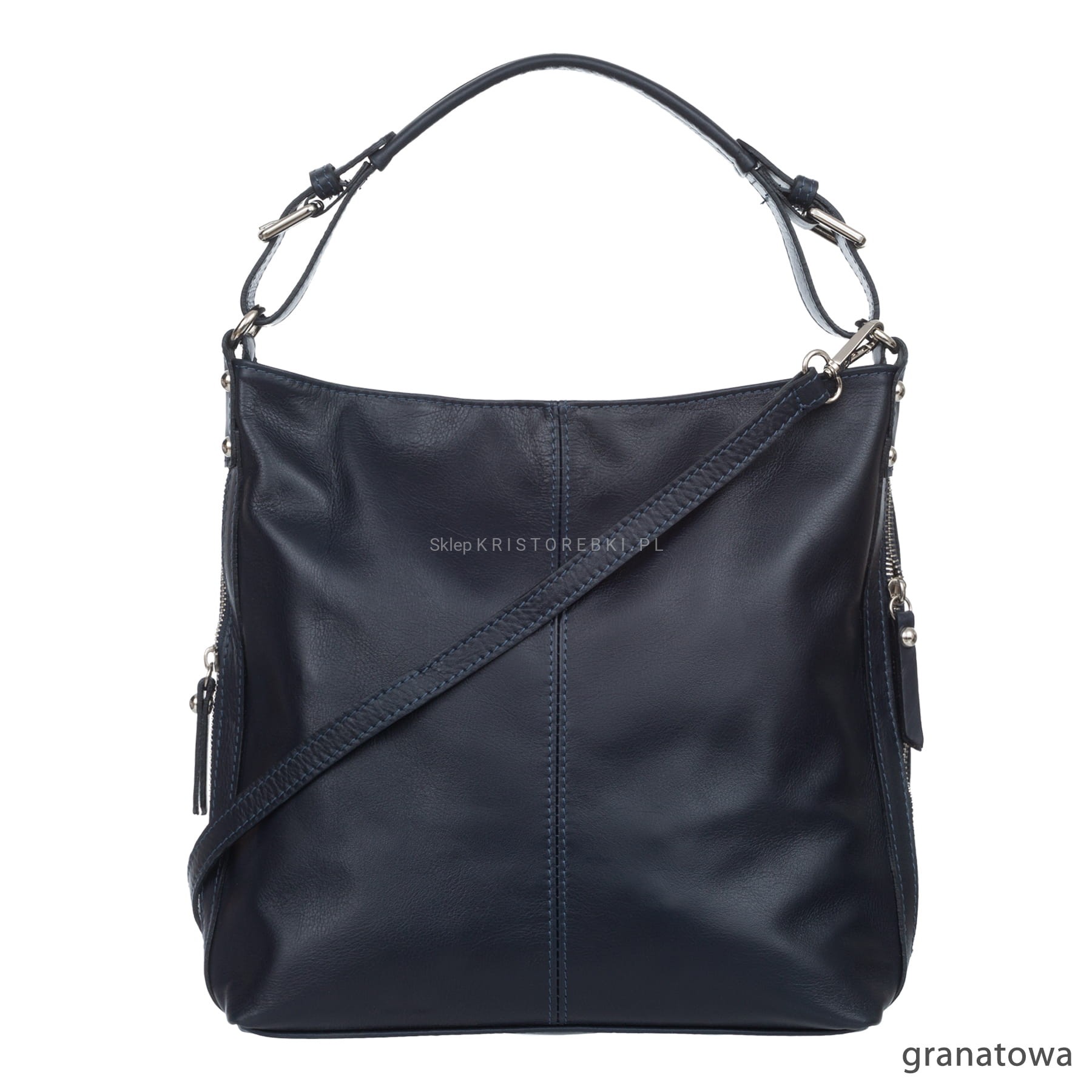 Torebka damska typu worek znanej i cenionej na rynku europejskim marki VERA PELLE ITALY. Wyprodukowana została z najwyższej jakości skóry naturalnej licowej z dbałością o najdrobniejsze szczegóły. Torebka mieści format A4, ma okucia w kolorze srebrnym a główna komora zamykana jest na solidny suwak. Torebka posiada długą rączkę, dzięki czemu można ją wygodnie nosić w ręku i na ramieniu. Dodatkowo do torebki dołączony został długi, odpinany i regulowany pasek o długości maksymalnej 128 cm, dzięki czemu można ją idealnie dopasować do własnych preferencji. Po bokach torebki są dwie funkcjonale duże kieszenie zamykane na suwak. Środek wykończony jest podszewką i przedzielony zamykaną na suwak przegrodą. Na jednej z bocznych ścianek środka znajduje się praktyczna kieszonka na telefon lub klucze. Z drugiej strony znajdują się dwie otwarte kieszonki np. na kosmetyki lub inne drobiazgi. Z tyłu torebki znajduje się dodatkowa kieszonka zamykana na suwak. Torebka jest bardzo praktyczna, elegancka i funkcjonalna. Będzie pasowała do większości codziennych stylizacji.