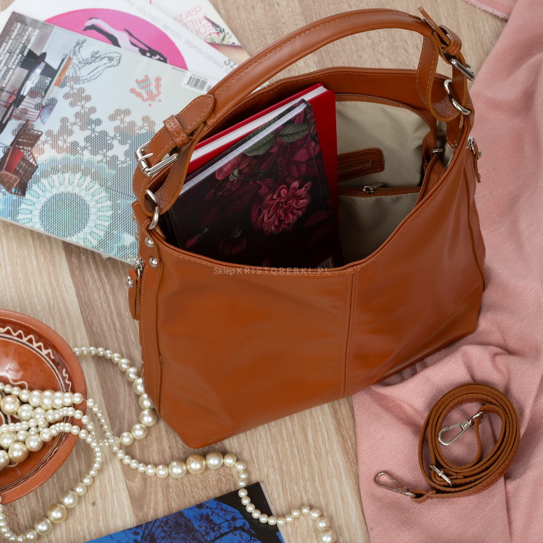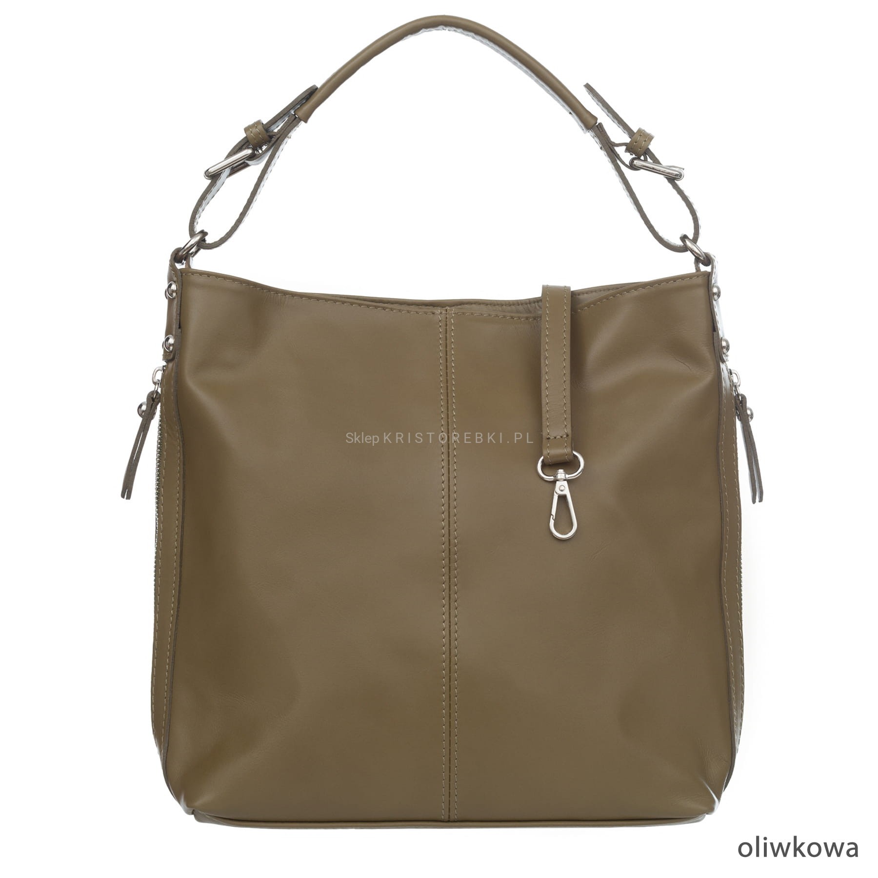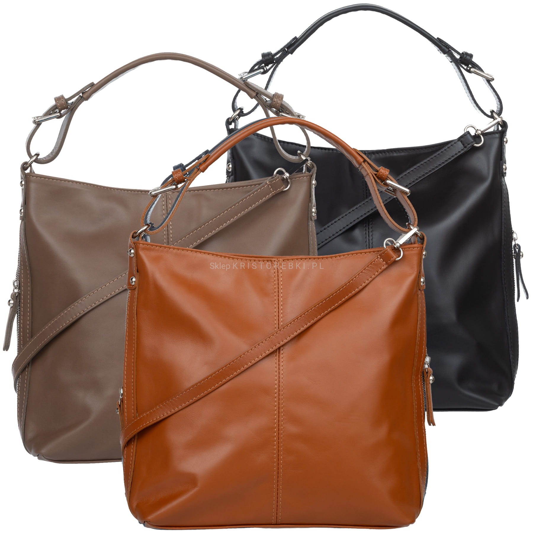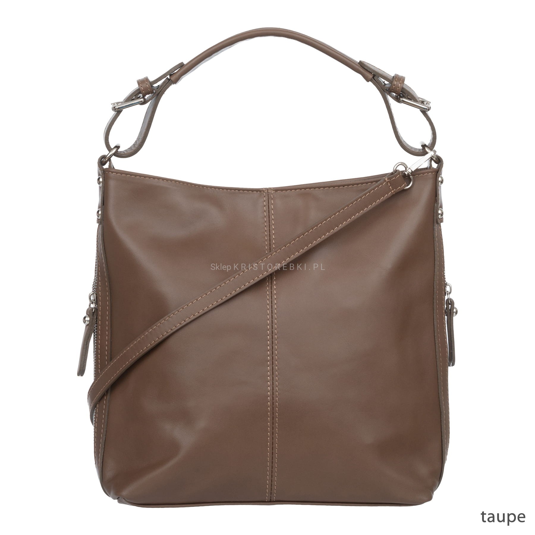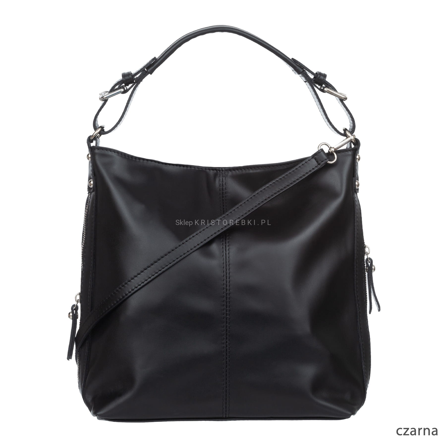 Torebka damska typu worek znanej i cenionej na rynku europejskim marki VERA PELLE ITALY. Wyprodukowana została z najwyższej jakości skóry naturalnej licowej z dbałością o najdrobniejsze szczegóły. Torebka mieści format A4, ma okucia w kolorze srebrnym a główna komora zamykana jest na solidny suwak. Torebka posiada długą rączkę, dzięki czemu można ją wygodnie nosić w ręku i na ramieniu. Dodatkowo do torebki dołączony został długi, odpinany i regulowany pasek o długości maksymalnej 128 cm, dzięki czemu można ją idealnie dopasować do własnych preferencji. Po bokach torebki są dwie funkcjonale duże kieszenie zamykane na suwak. Środek wykończony jest podszewką i przedzielony zamykaną na suwak przegrodą. Na jednej z bocznych ścianek środka znajduje się praktyczna kieszonka na telefon lub klucze. Z drugiej strony znajdują się dwie otwarte kieszonki np. na kosmetyki lub inne drobiazgi. Z tyłu torebki znajduje się dodatkowa kieszonka zamykana na suwak. Torebka jest bardzo praktyczna, elegancka i funkcjonalna. Będzie pasowała do większości codziennych stylizacji.