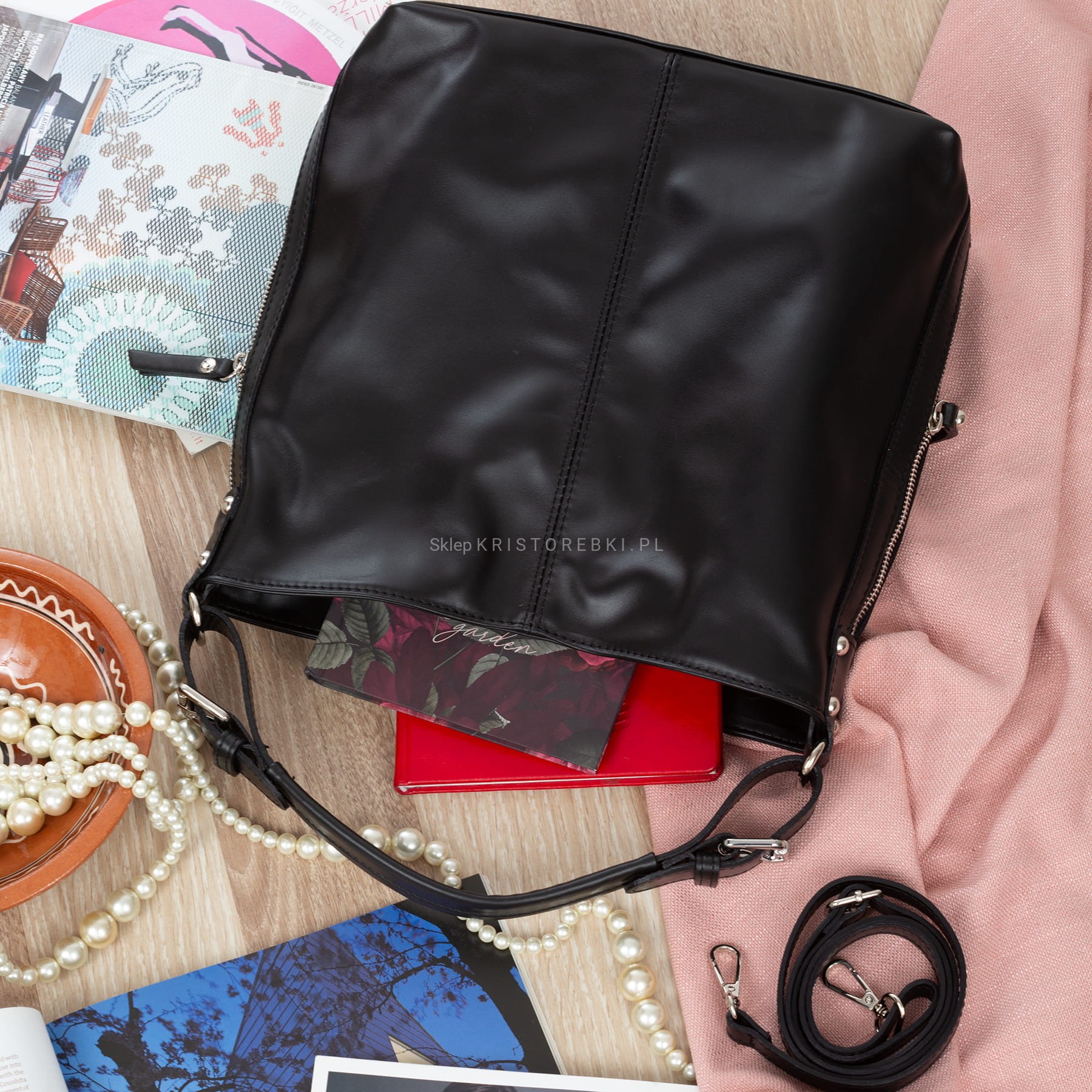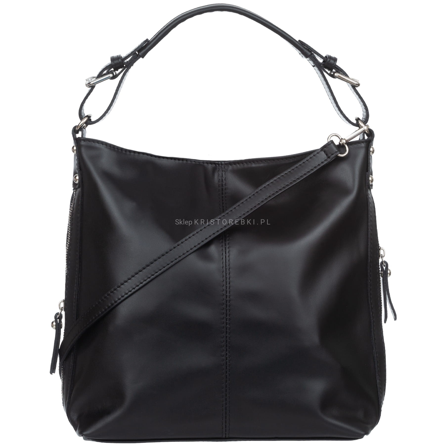 Torebka damska typu worek znanej i cenionej na rynku europejskim marki VERA PELLE ITALY w kolorze CZARNYM. Wyprodukowana została z najwyższej jakości skóry naturalnej licowej z dbałością o najdrobniejsze szczegóły. Torebka mieści format A4, ma okucia w kolorze srebrnym a główna komora zamykana jest na solidny suwak. Torebka posiada długą rączkę, dzięki czemu można ją wygodnie nosić w ręku i na ramieniu. Dodatkowo do torebki dołączony został długi, odpinany i regulowany pasek o długości maksymalnej 128 cm, dzięki czemu można ją idealnie dopasować do własnych preferencji. Po bokach torebki są dwie funkcjonale duże kieszenie zamykane na suwak. Środek wykończony jest podszewką i przedzielony zamykaną na suwak przegrodą. Na jednej z bocznych ścianek środka znajduje się praktyczna kieszonka na telefon lub klucze. Z drugiej strony znajdują się dwie otwarte kieszonki np. na kosmetyki lub inne drobiazgi. Z tyłu torebki znajduje się dodatkowa kieszonka zamykana na suwak. Torebka jest bardzo praktyczna, elegancka i funkcjonalna. Będzie pasowała do większości codziennych stylizacji.