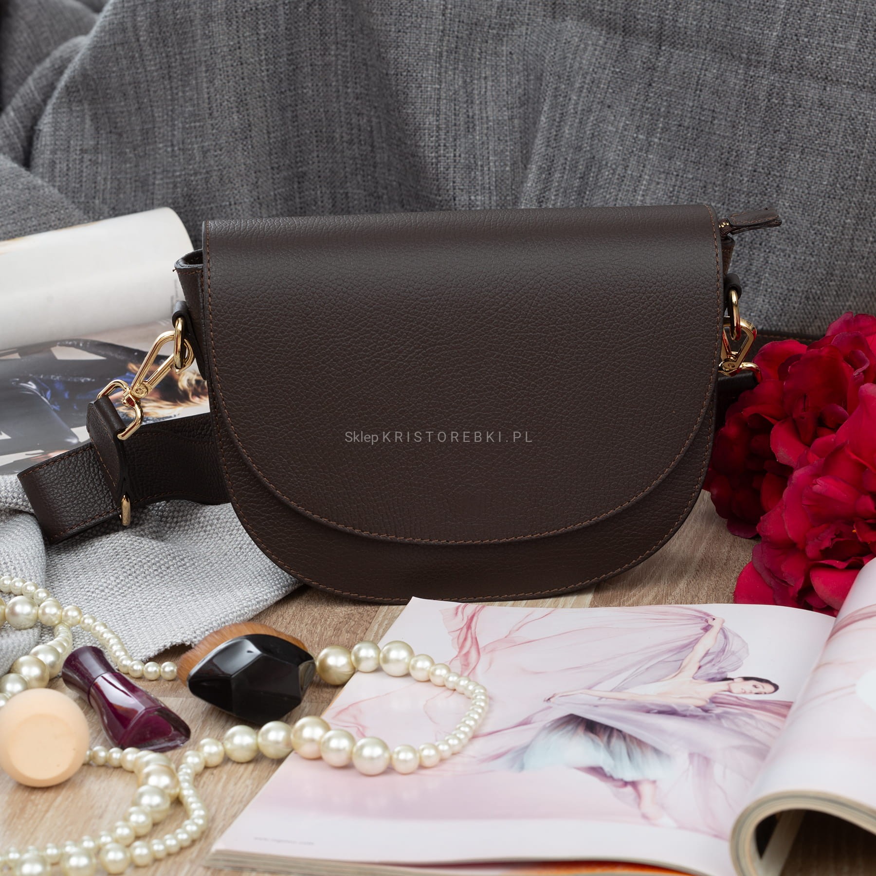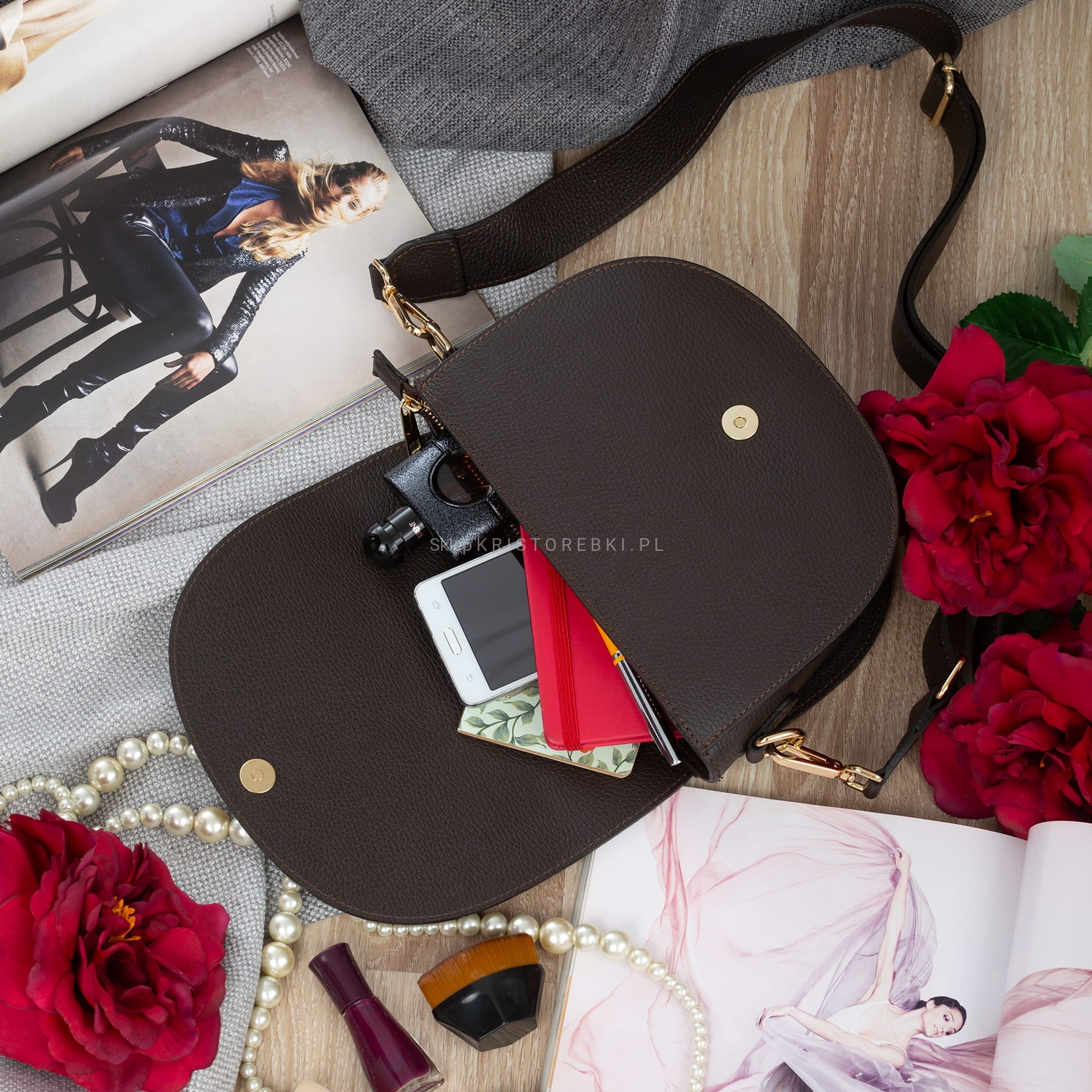 Torebka damska listonoszka znanej i cenionej na rynku europejskim marki VERA PELLE ITALY w kolorze CIEMNEGO CZEKOLADOWEGO BRĄZU. Uszyta została z najwyższej jakości, pachnącej włoskiej skóry naturalnej. Torebka posiada szeroki, odpinany i regulowany długi pasek, dzięki czemu można ją wygodnie nosić na ramieniu i idealnie dostosować do własnych preferencji. Główna klapa torebki zamykana jest na magnesik a środek zamykany jest na solidny suwak. Listonoszka posiada złote okucia a jednokomorowy środek wykończony jest podszewką. W środku dodatkowo znajduje się praktyczna kieszonka zamykana na suwak na telefon lub dokumenty. Torebka jest bardzo praktyczna i będzie świetnym dodatkiem do codziennych stylizacji.