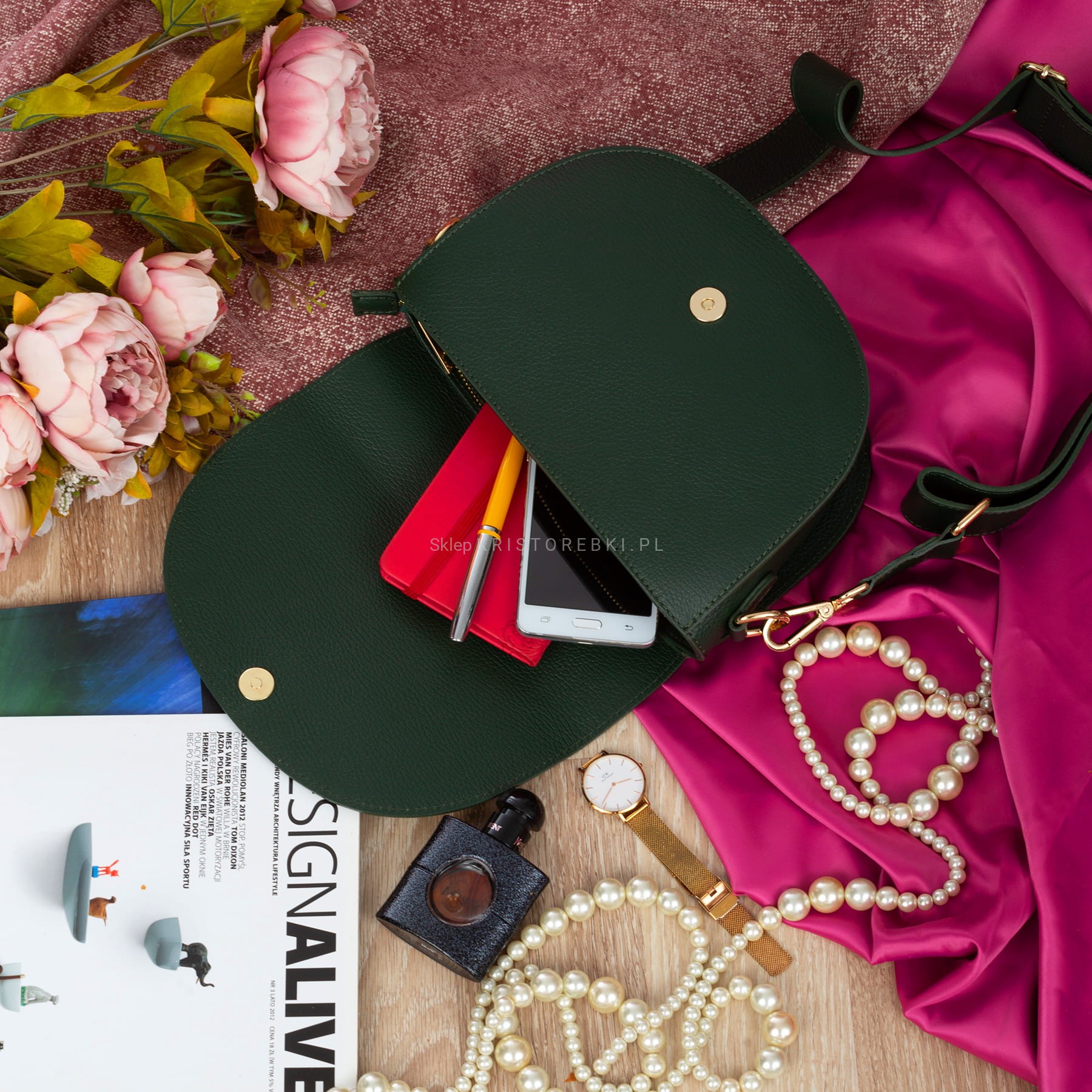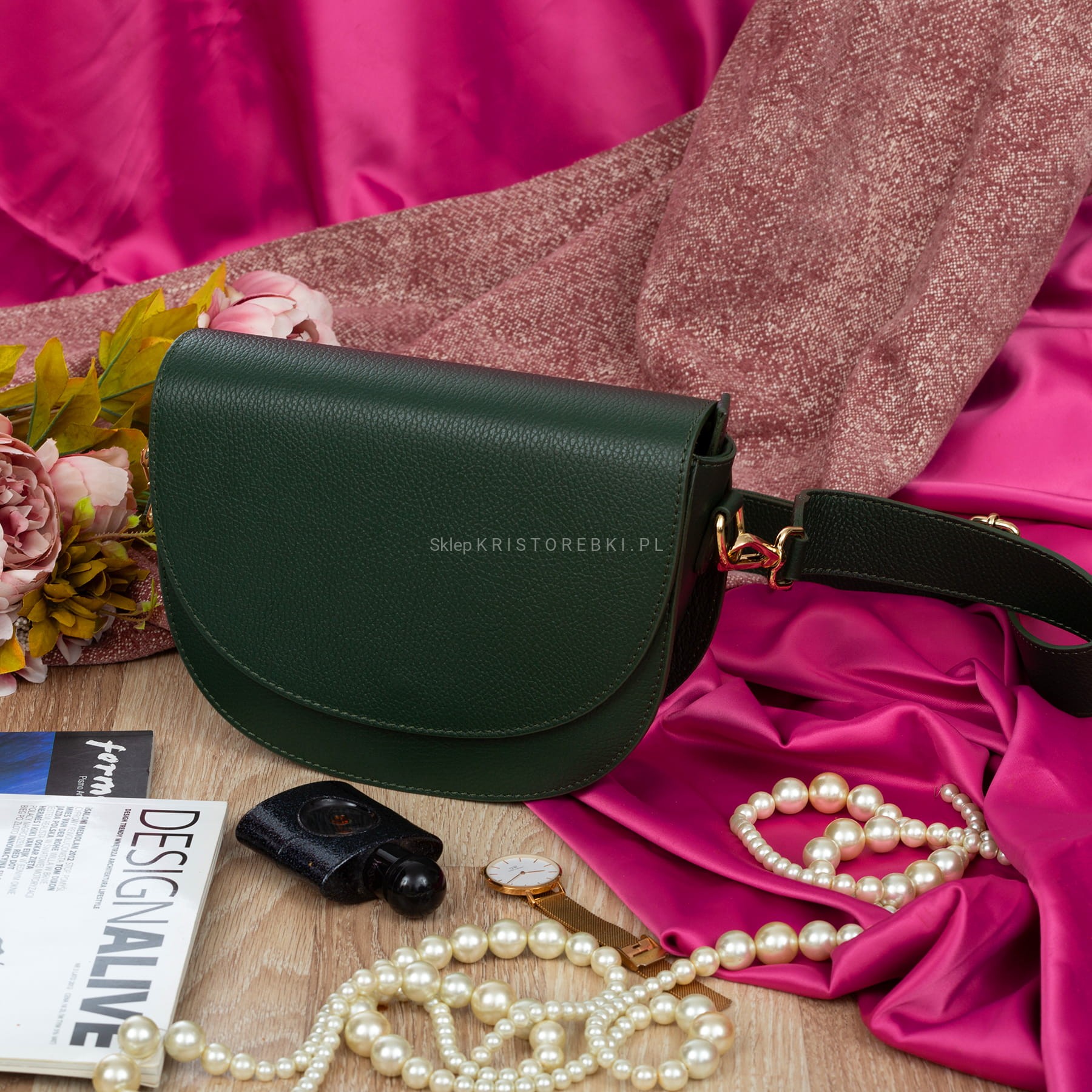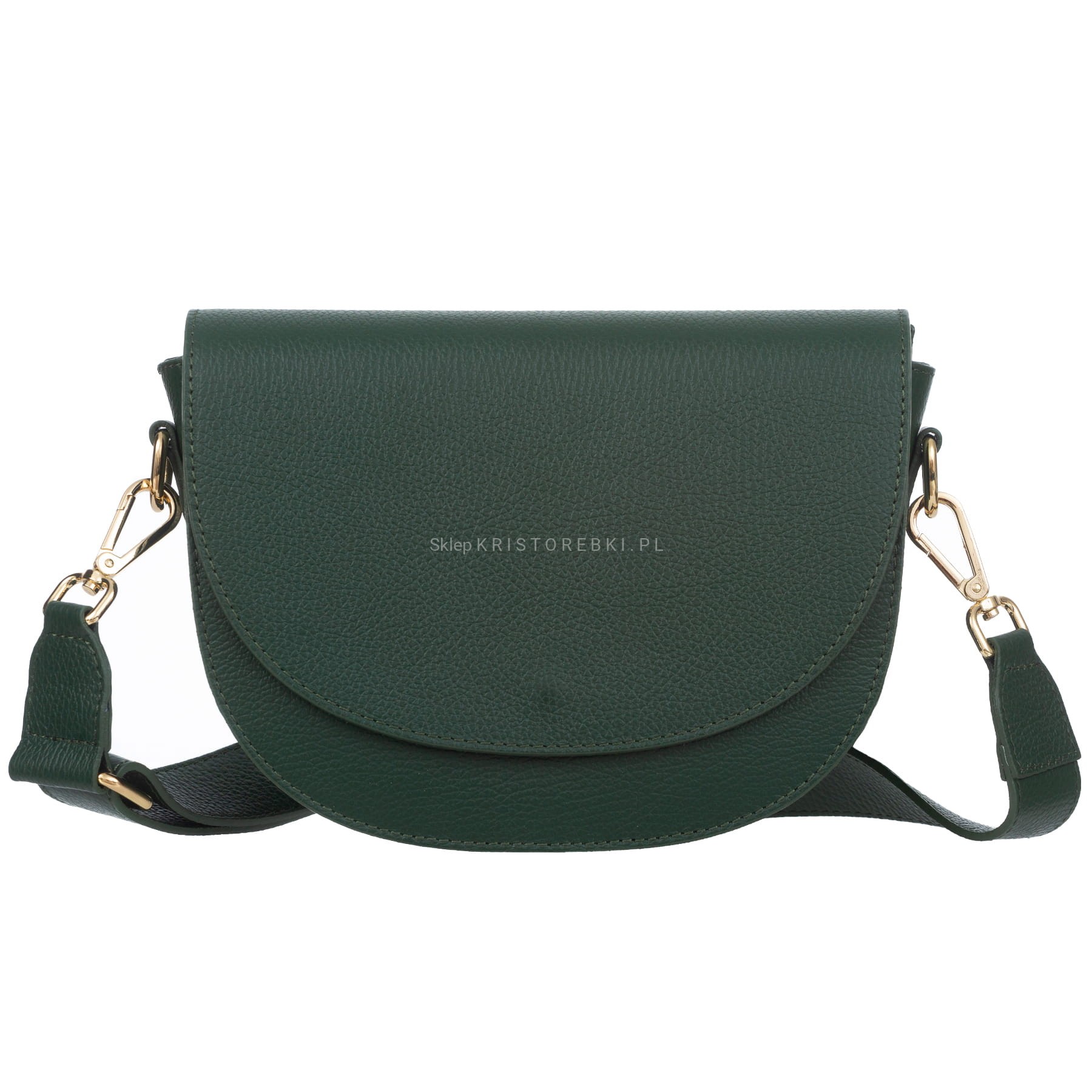 VERA PELLE torebka damska skórzana listonoszka z paskiem na ramię V504 ciemna zielona