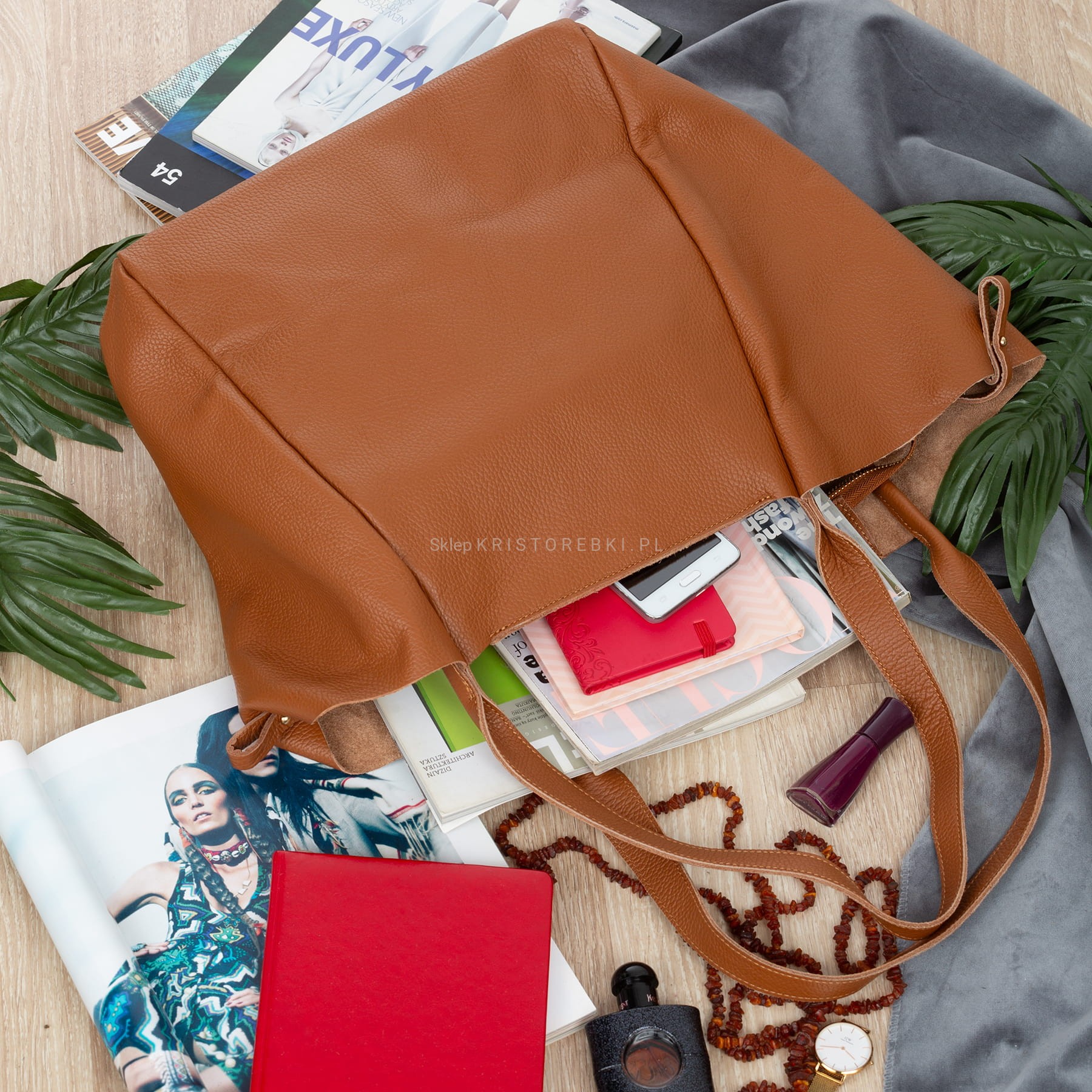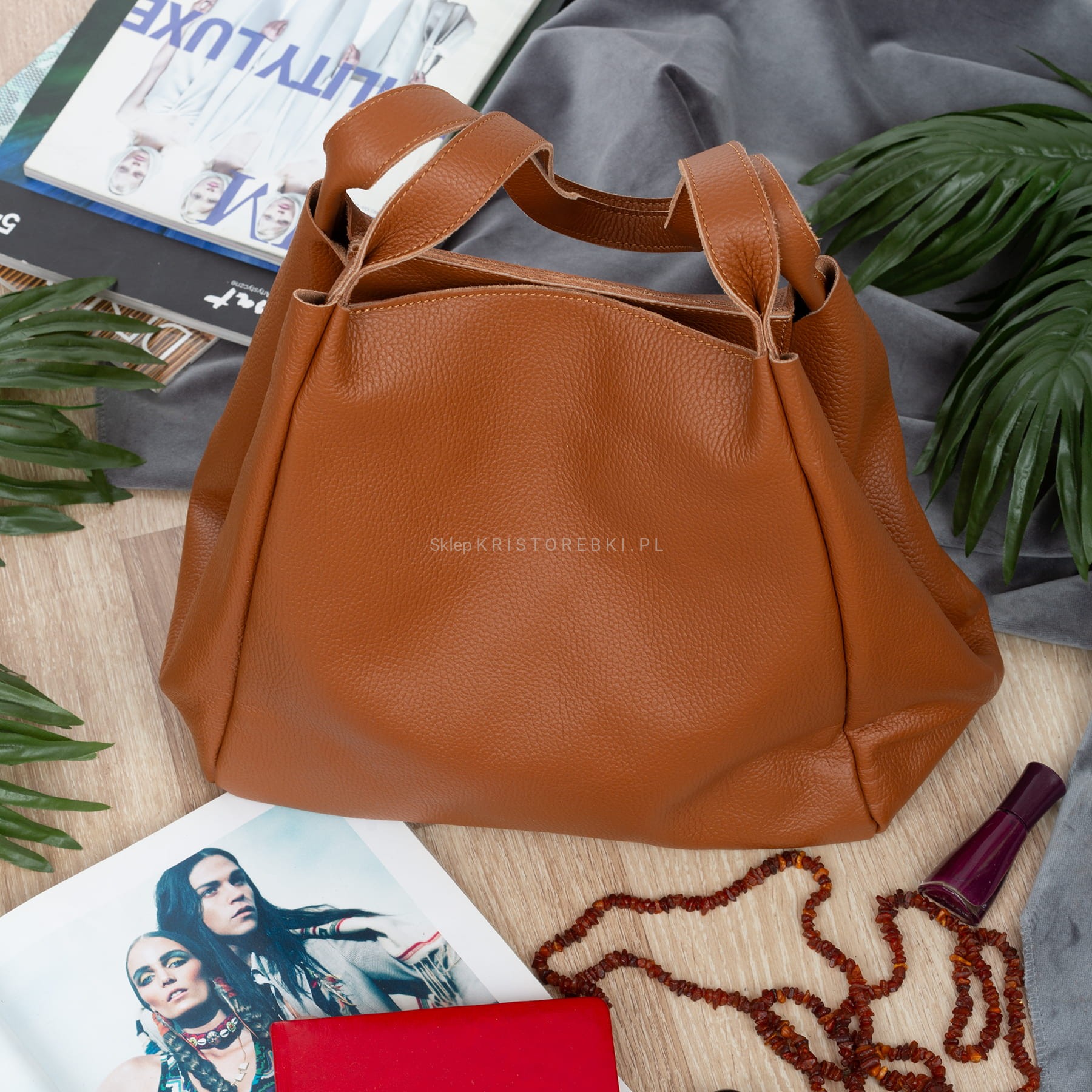VERA PELLE torebka damska skórzana shopper z saszetką V508 camel