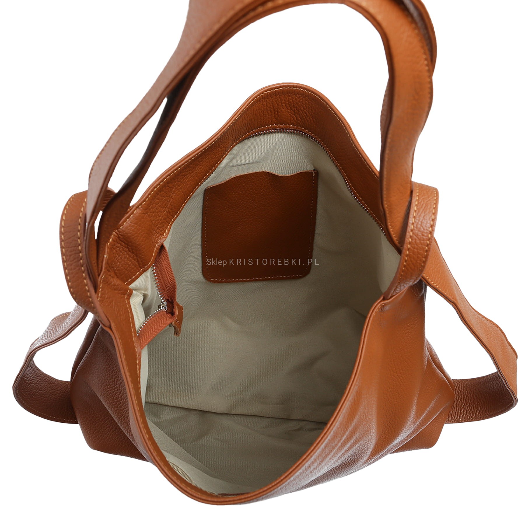Włoska skórzana torebka typu worek marki VERA PELLE ITALY dostępna w wielu modnych KOLORACH. Wykonana z wysoko gatunkowej, przyjemnie pachnącej skóry naturalnej. Torba posiada długie uchwyty, dzięki czemu można ją wygodnie nosić zarówno w ręku jak i na ramieniu. Dodatkowo można rączki ściągnąć, dzięki czemu w kilka chwil zmienimy ją w wygodny plecak do noszenia na plecach. Zamykana jest na suwak i posiada srebrne okucia, dzięki czemu będzie pasować do niemal każdej stylizacji. W środku wykończona jest podszewką oraz posiada zamykaną kieszonkę na suwak oraz dodatkową otwartą kieszonkę na telefon lub dokumenty. Jest bardzo pojemna i bardzo wygodna w codziennym użytkowaniu. Będzie pasowała do niemal każdej codziennej stylizacji jak również świetnie sprawdzi się na wszelkich wycieczkach lub weekendowych podróżach.