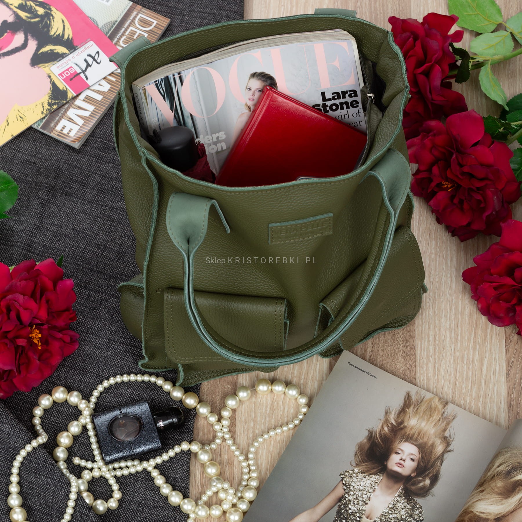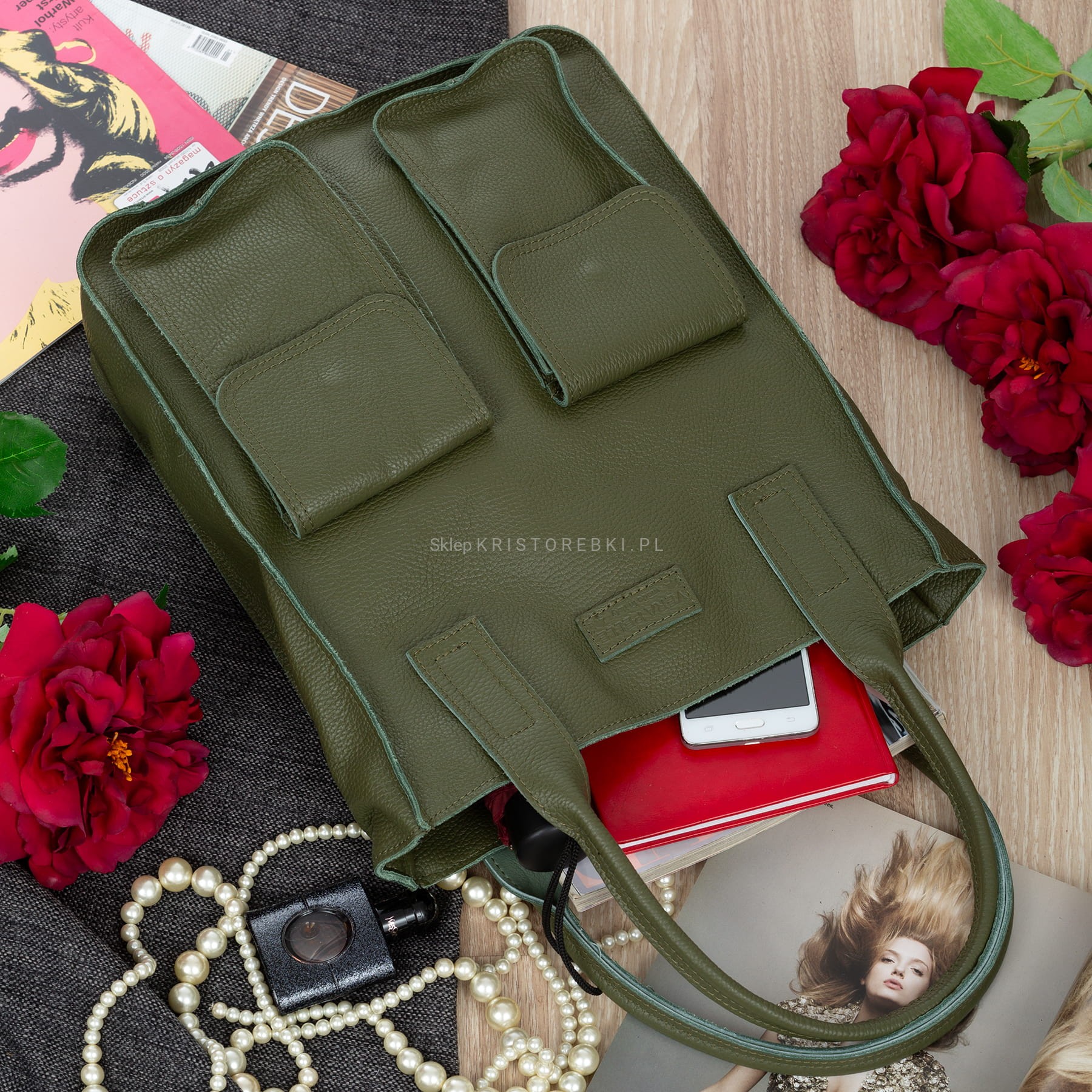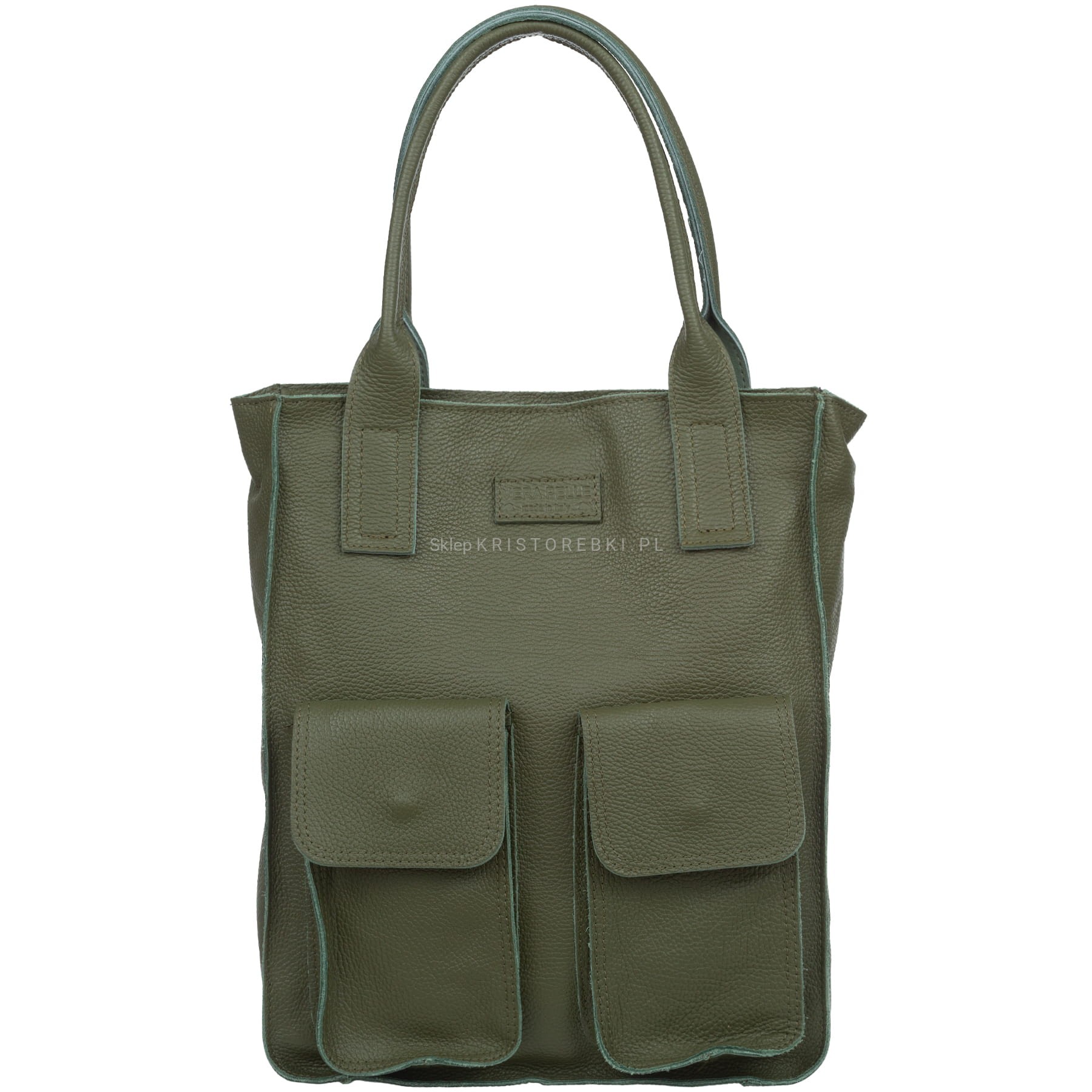 VERA PELLE torebka damska skórzana shopper na ramię z kieszeniami V516 oliwkowa