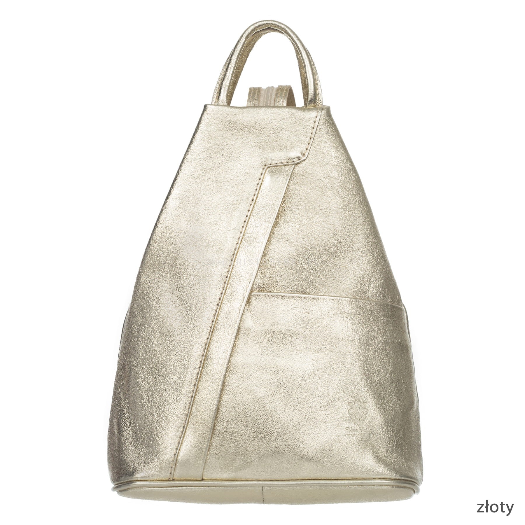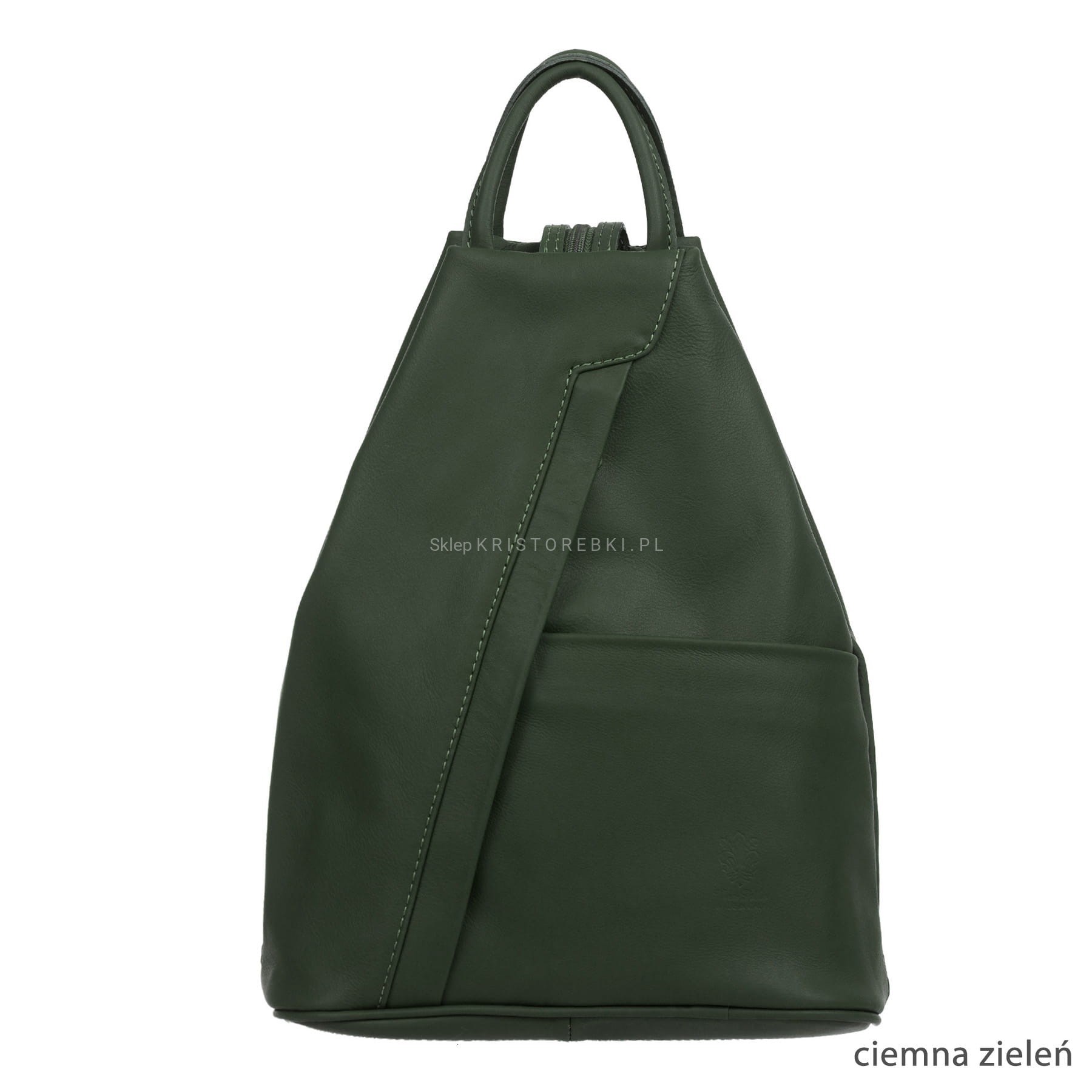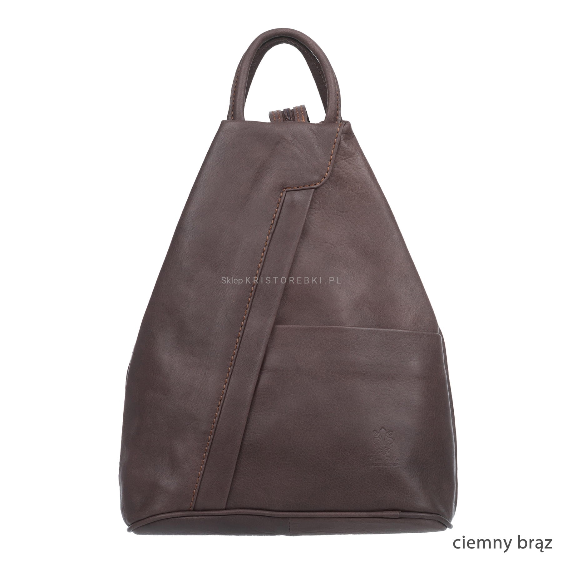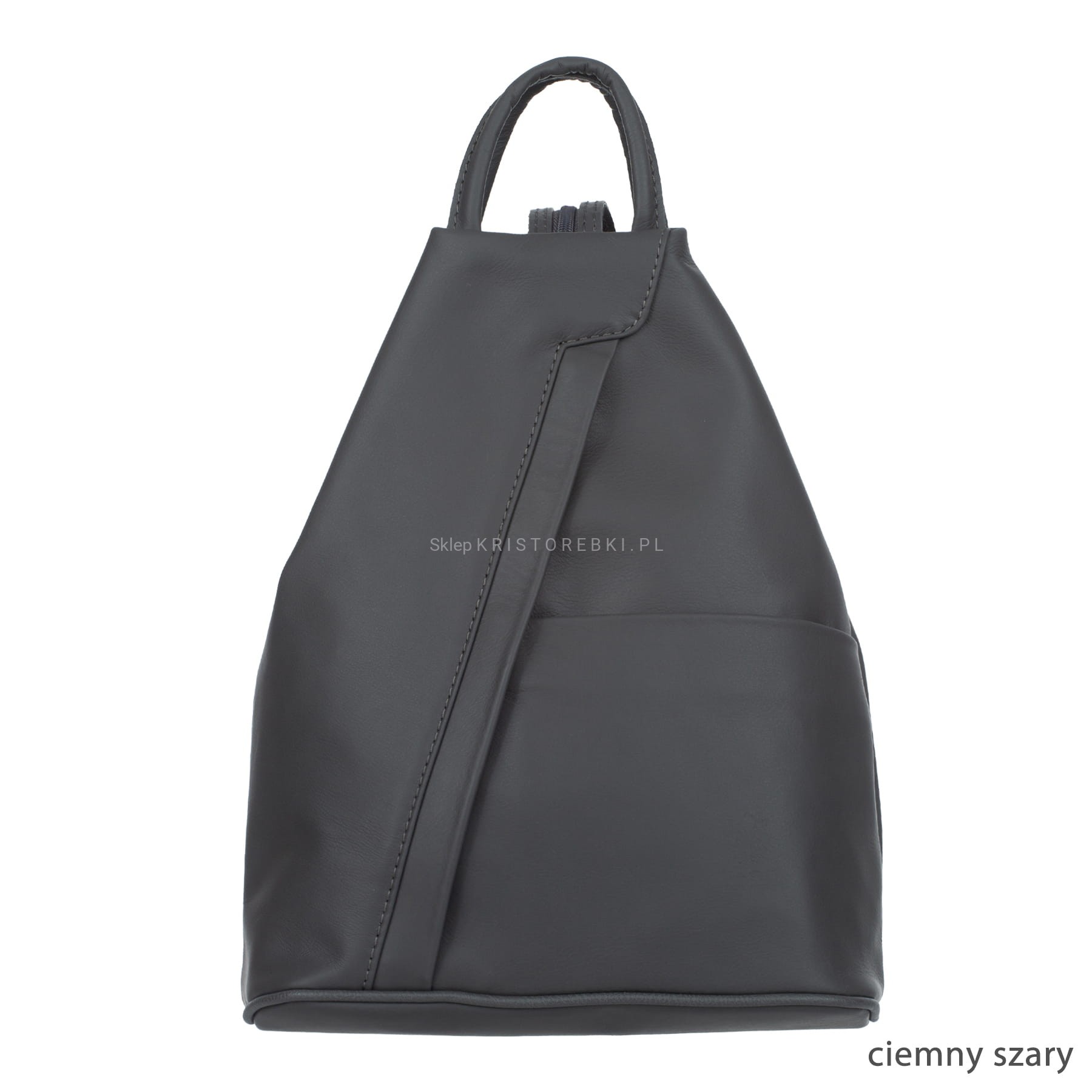 Elegancki trójkątny skórzany plecak damski znanej i cenionej na rynku europejskim marki VERA PELLE ITALY dostępny w wielu modnych KOLORACH. Uszyty został z należną starannością z najwyższej jakości włoskiej skóry naturalnej licowej. Plecak posiada z tyłu dwie szelki do wygodnego noszenia go na plecach. Szelki są dodatkowo regulowane, dzięki czemu idealnie dopasujesz go do własnych preferencji. Można je spiąć razem zamontowanym suwaczkiem, dzięki czemu utworzy się jedna szelka do noszenia go wygodnie na ramieniu. Plecak posiada dodatkowo na górze wygodny uchwyt do noszenia go również w ręku. Okucia plecaka są w kolorze srebrnym a jego główna komora zapinana jest na solidny suwak. Środek wykończony jest podszewką. W środku dodatkowo znajduje się praktyczna kieszonka zamykana na suwak oraz otwarta kieszonka na telefon i dokumenty. Z przodu znajduje się duża kieszeń zamykana na suwak oraz dodatkowa nieduża otwarta kieszeń na drobiazgi. Dodatkowo z tyłu znajduje się kolejna duża kieszeń zamykana na suwak. Plecak jest bardzo elegancki, wygodny i jednocześnie praktyczny. Będzie świetnym dodatkiem do codziennych stylizacji.