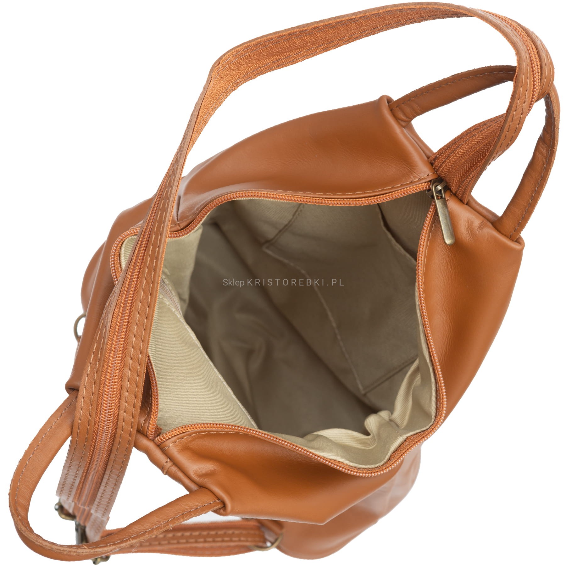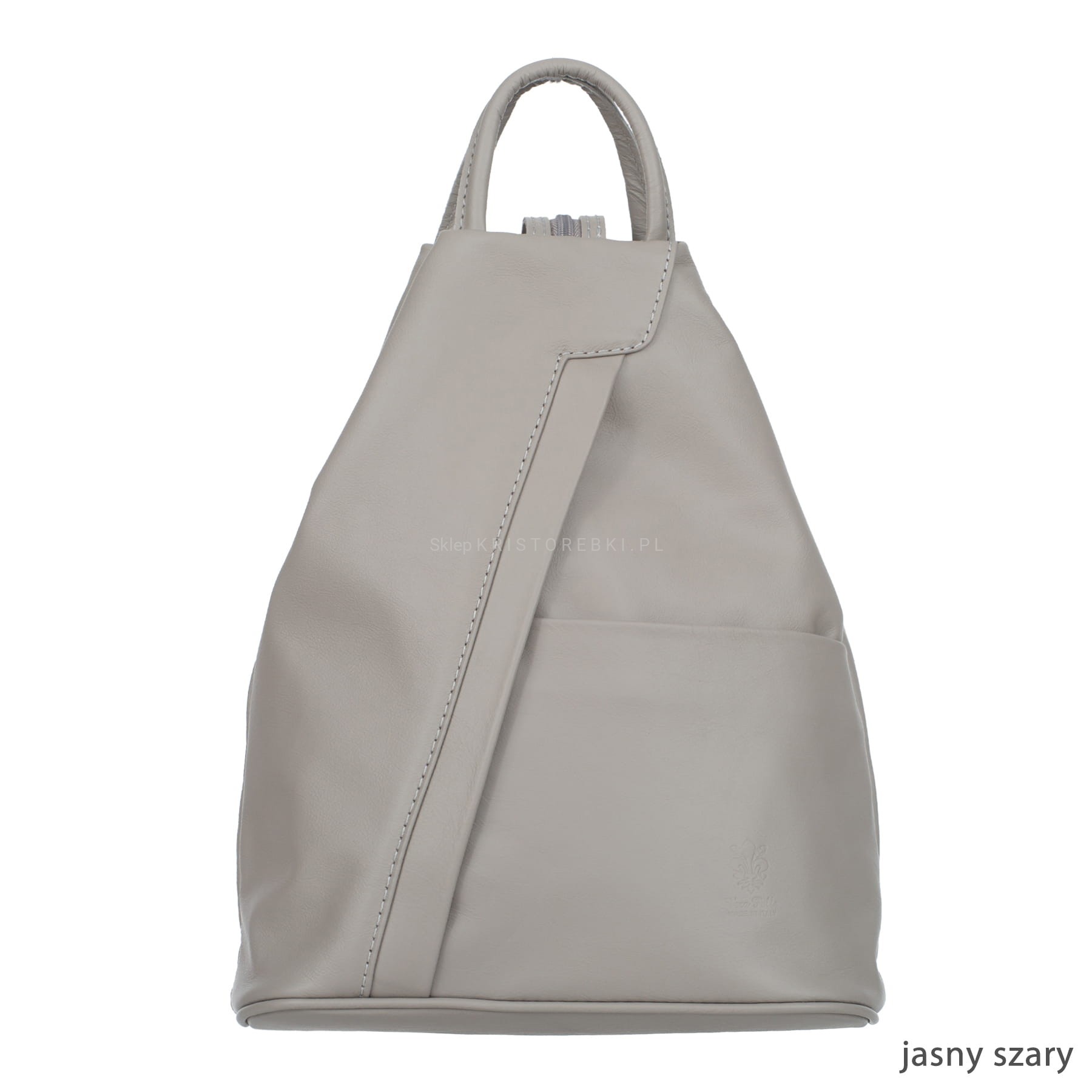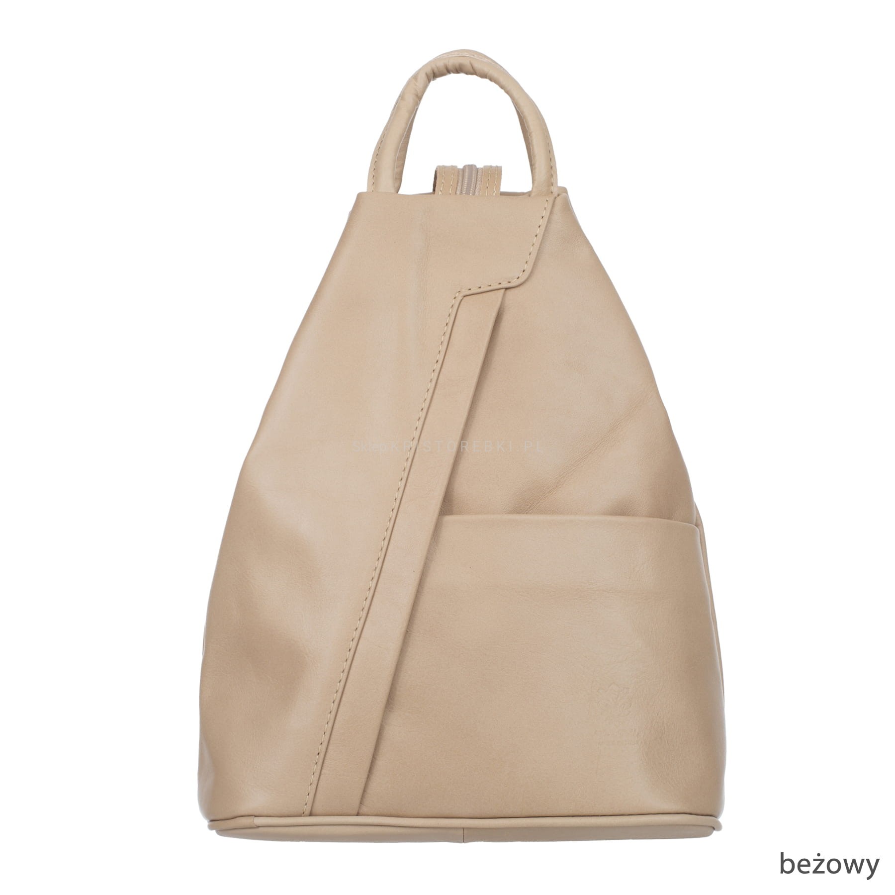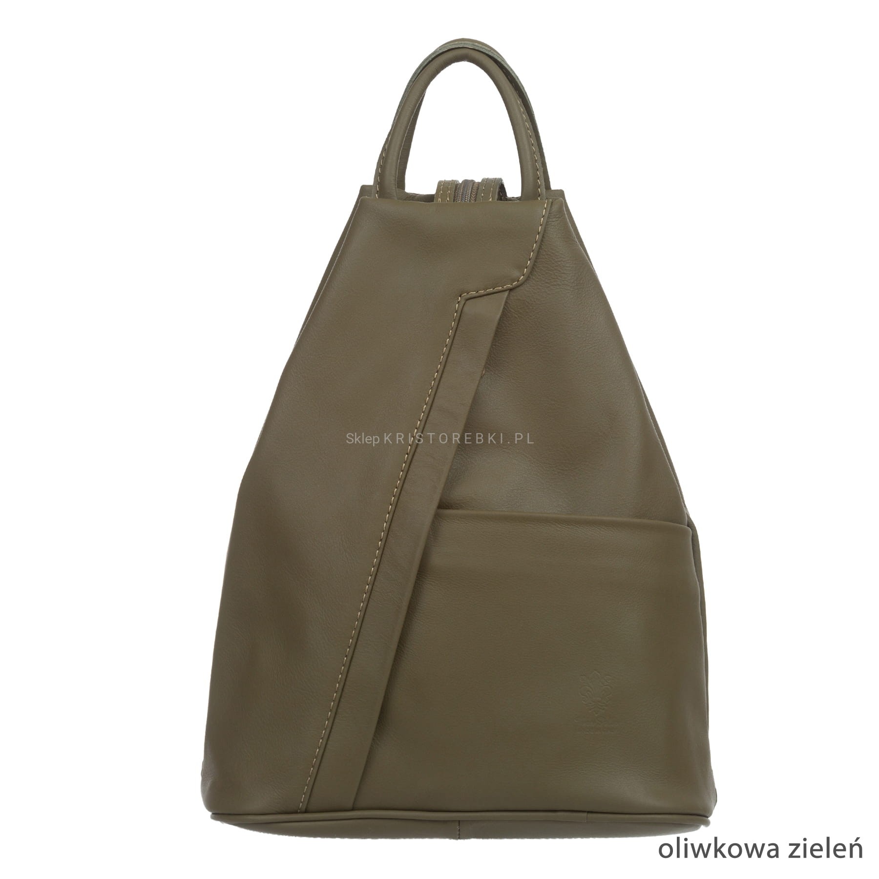 Elegancki trójkątny skórzany plecak damski znanej i cenionej na rynku europejskim marki VERA PELLE ITALY dostępny w wielu modnych KOLORACH. Uszyty został z należną starannością z najwyższej jakości włoskiej skóry naturalnej licowej. Plecak posiada z tyłu dwie szelki do wygodnego noszenia go na plecach. Szelki są dodatkowo regulowane, dzięki czemu idealnie dopasujesz go do własnych preferencji. Można je spiąć razem zamontowanym suwaczkiem, dzięki czemu utworzy się jedna szelka do noszenia go wygodnie na ramieniu. Plecak posiada dodatkowo na górze wygodny uchwyt do noszenia go również w ręku. Okucia plecaka są w kolorze srebrnym a jego główna komora zapinana jest na solidny suwak. Środek wykończony jest podszewką. W środku dodatkowo znajduje się praktyczna kieszonka zamykana na suwak oraz otwarta kieszonka na telefon i dokumenty. Z przodu znajduje się duża kieszeń zamykana na suwak oraz dodatkowa nieduża otwarta kieszeń na drobiazgi. Dodatkowo z tyłu znajduje się kolejna duża kieszeń zamykana na suwak. Plecak jest bardzo elegancki, wygodny i jednocześnie praktyczny. Będzie świetnym dodatkiem do codziennych stylizacji.