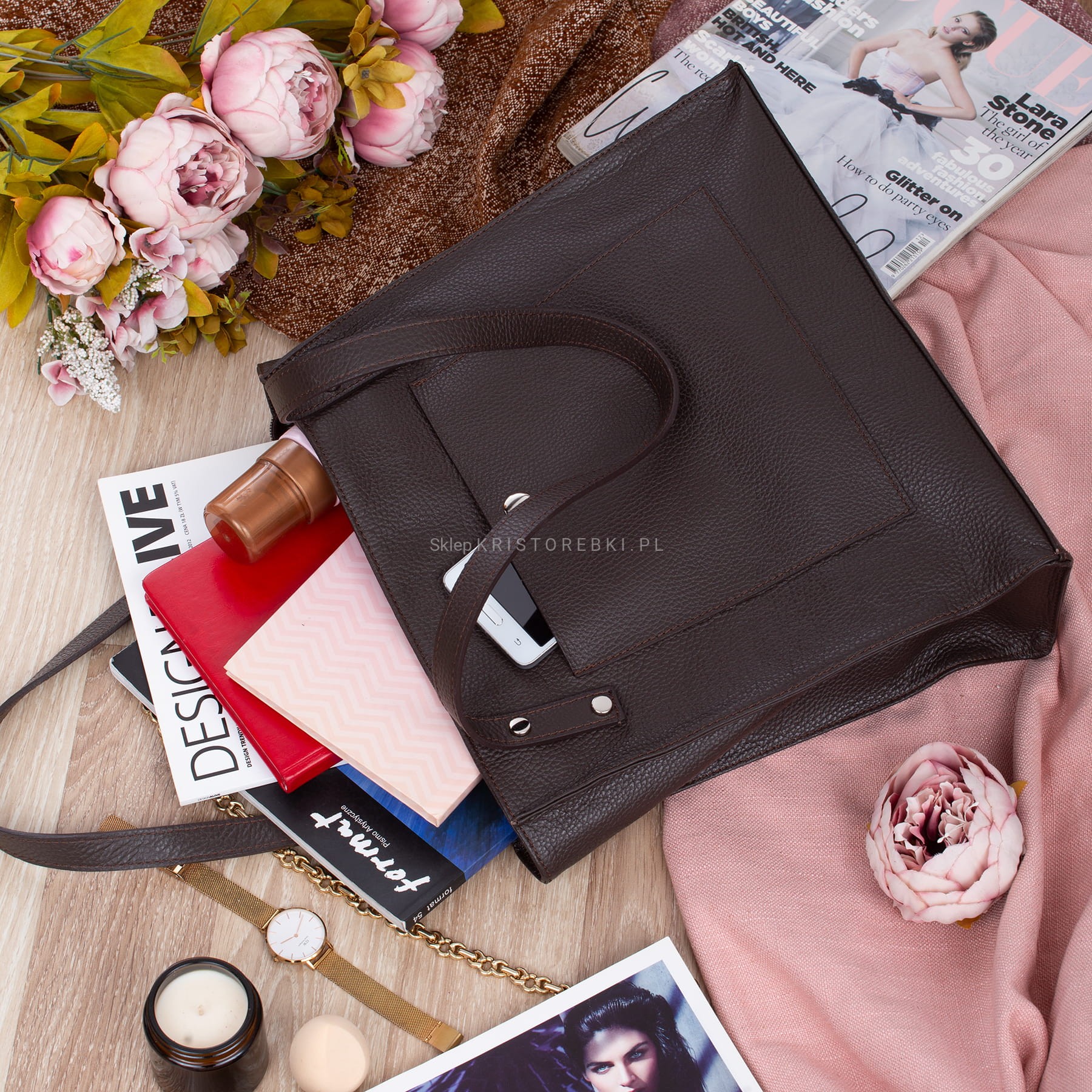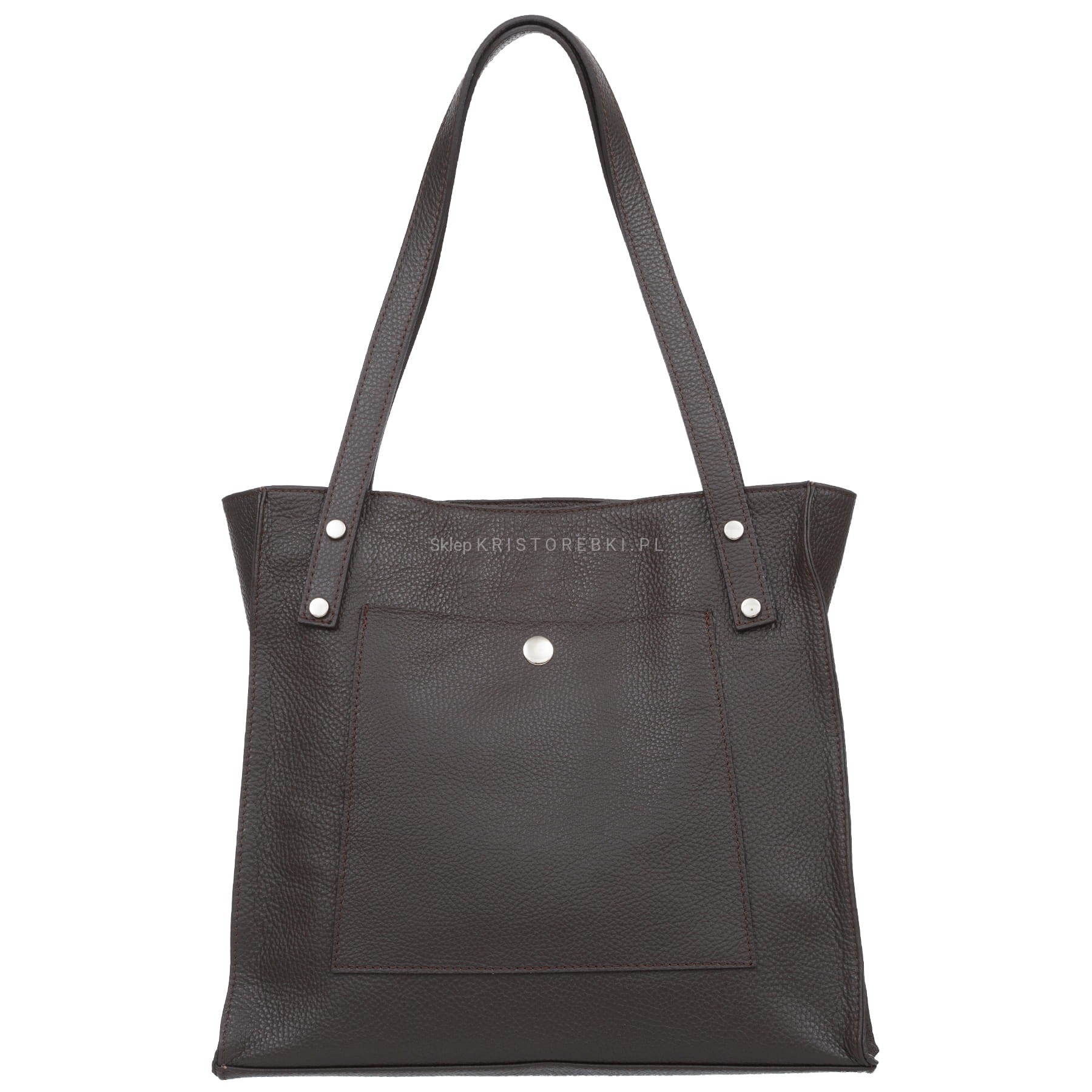 Duża torebka damska typu shopper znanej i cenionej na rynku europejskim marki VERA PELLE ITALY w kolorze CIEMNEGO CZEKOLADOWEGO BRĄZU. Uszyta została bardzo starannie z najwyższej jakości włoskiej skóry naturalnej z widoczną fakturą. Torebka posiada długie rączki, dzięki czemu można ją wygodnie nosić w ręku i na ramieniu. Torebka posiada okucia w kolorze srebrnym i zamykana jest na solidny suwak. Jednokomorowy środek wykończony jest podszewką. Dodatkowo w środku znajdziesz praktyczną kieszonkę zamykaną na suwak oraz otwartą małą kieszonkę na telefon lub dokumenty. Z przodu torebki znajduje się duża kieszeń zamykana na magnesik a z tyłu znajduje się kolejna duża kieszeń zamykana na suwak. Torebka jest bardzo pojemna i praktyczna. Będzie pasować do większości codziennych stylizacji.