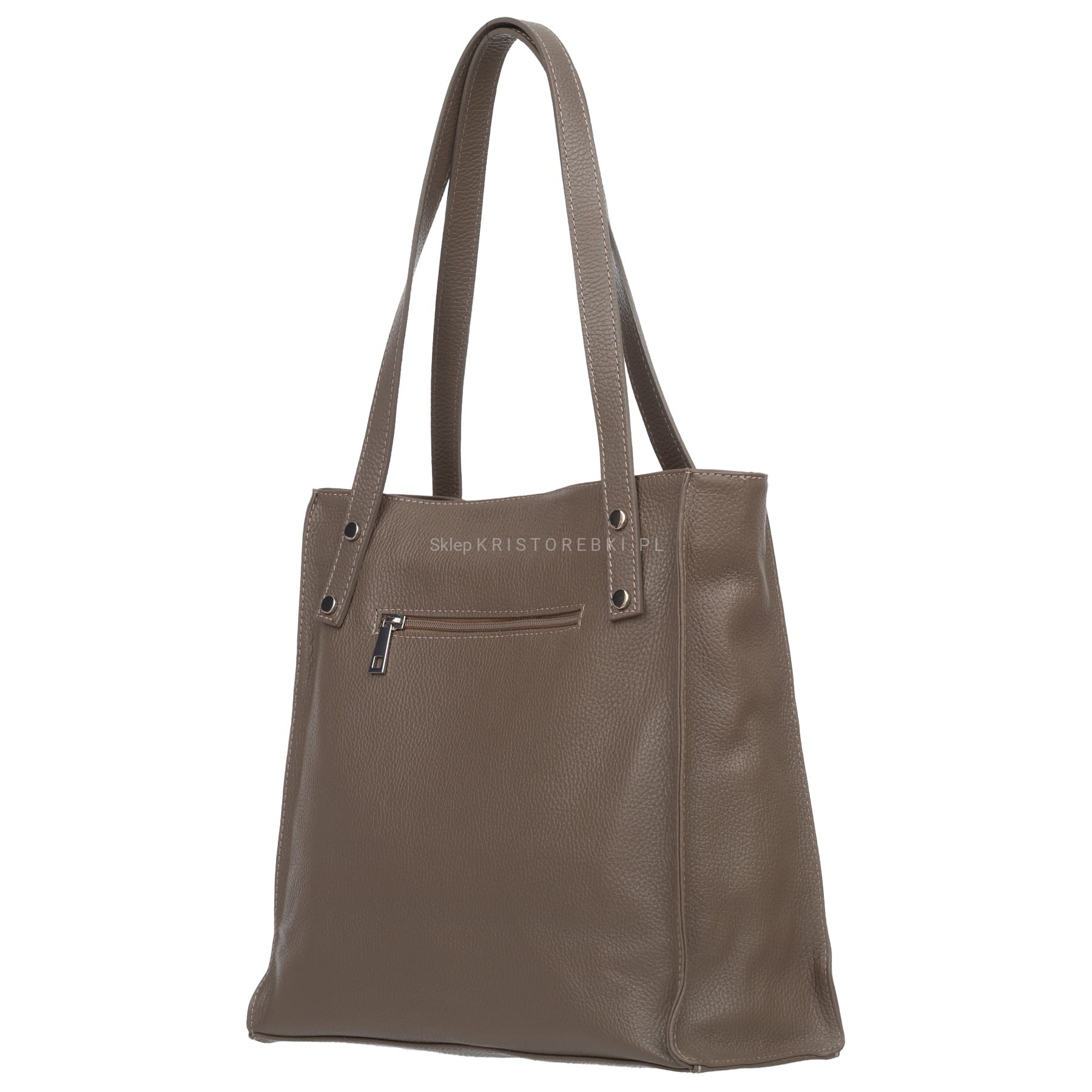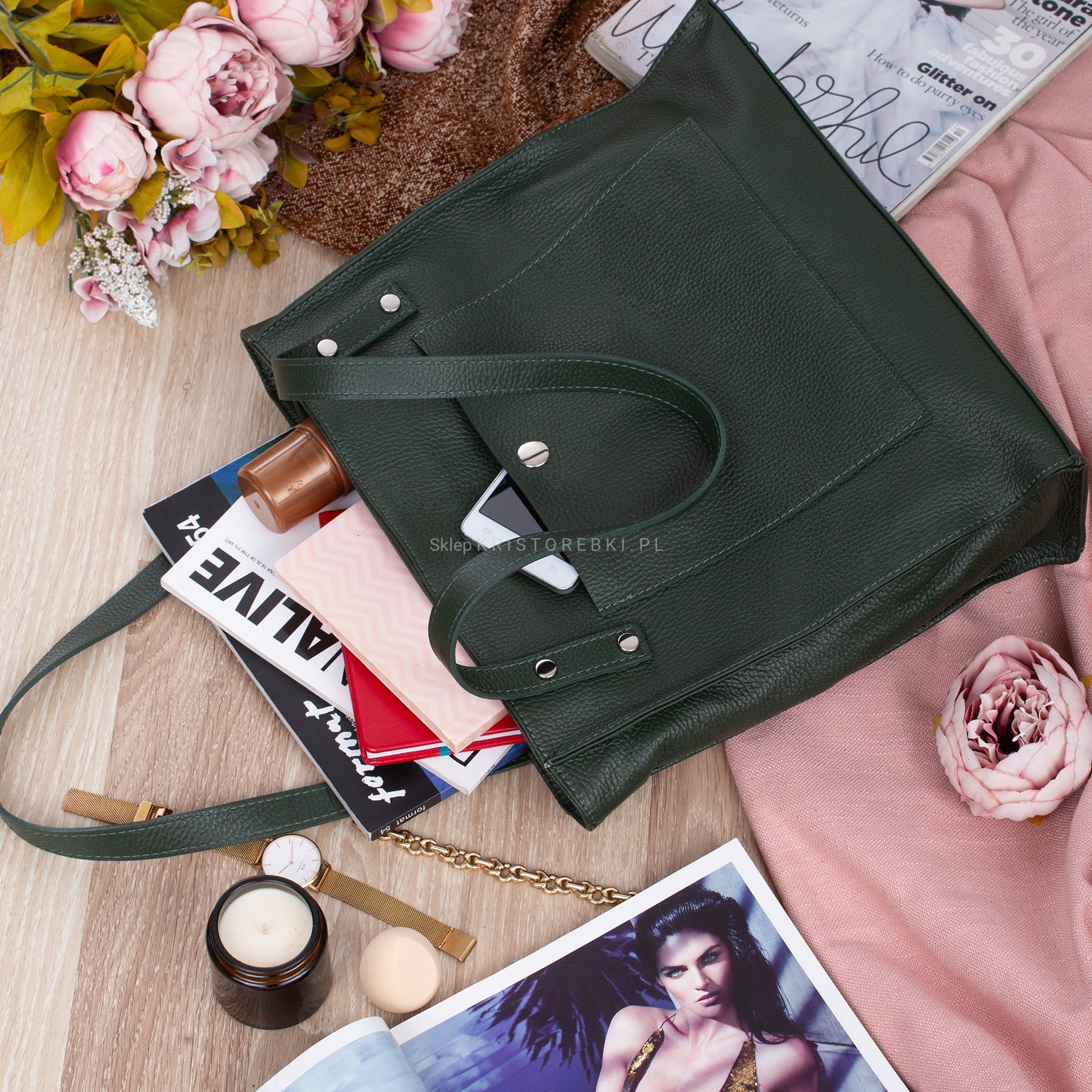 Duża torebka damska typu shopper znanej i cenionej na rynku europejskim marki VERA PELLE ITALY w kolorze CIEMNEJ BUTELKOWEJ ZIELENI. Uszyta została bardzo starannie z najwyższej jakości włoskiej skóry naturalnej z widoczną fakturą. Torebka posiada długie rączki, dzięki czemu można ją wygodnie nosić w ręku i na ramieniu. Torebka posiada okucia w kolorze srebrnym i zamykana jest na solidny suwak. Jednokomorowy środek wykończony jest podszewką. Dodatkowo w środku znajdziesz praktyczną kieszonkę zamykaną na suwak oraz otwartą małą kieszonkę na telefon lub dokumenty. Z przodu torebki znajduje się duża kieszeń zamykana na magnesik a z tyłu znajduje się kolejna duża kieszeń zamykana na suwak. Torebka jest bardzo pojemna i praktyczna. Będzie pasować do większości codziennych stylizacji.