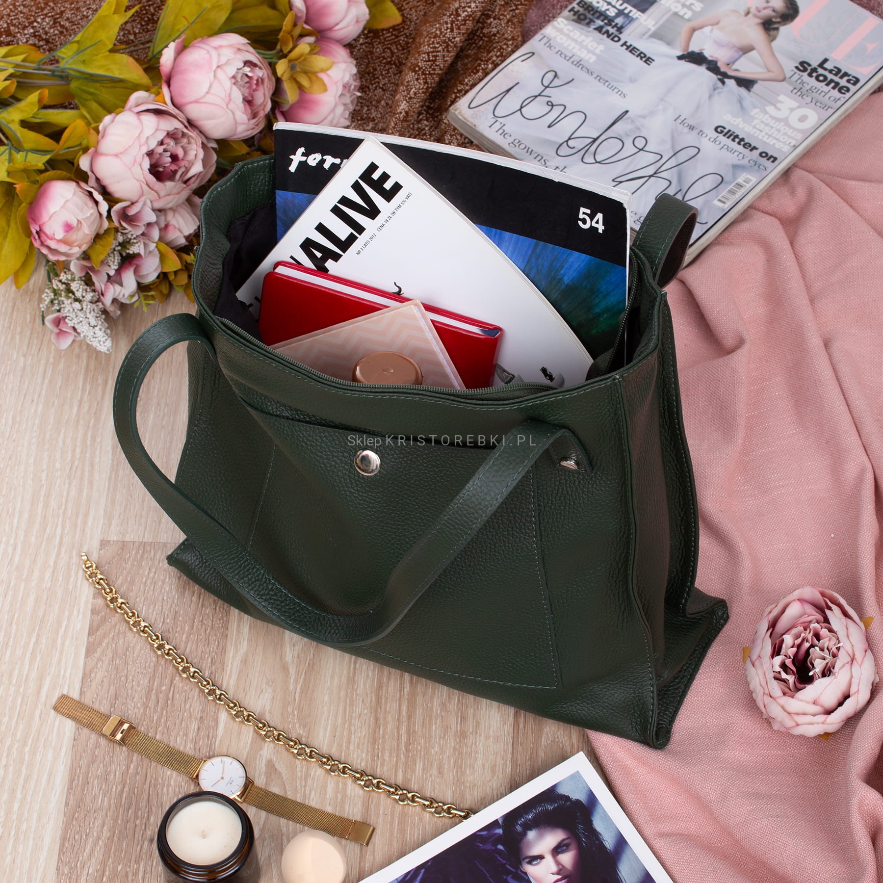 VERA PELLE torebka damska skórzana shopper z długimi rączkami na ramię V527 ciemna zielona