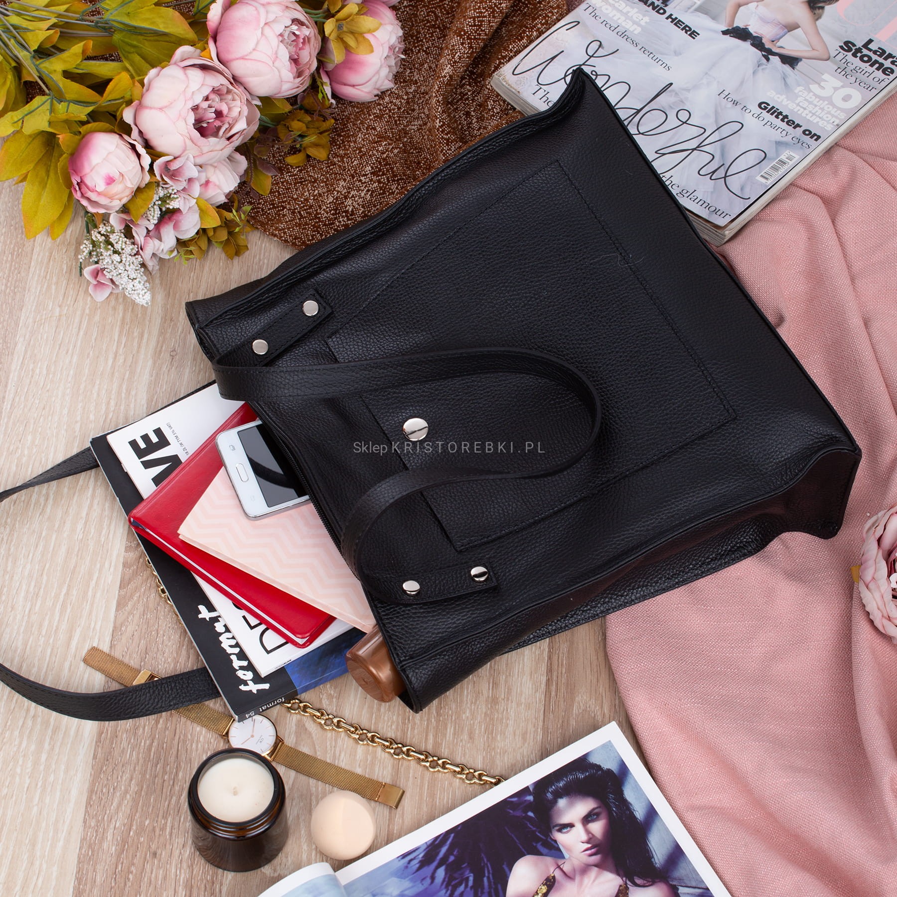 Duża torebka damska typu shopper znanej i cenionej na rynku europejskim marki VERA PELLE ITALY w kolorze CZARNYM. Uszyta została bardzo starannie z najwyższej jakości włoskiej skóry naturalnej z widoczną fakturą. Torebka posiada długie rączki, dzięki czemu można ją wygodnie nosić w ręku i na ramieniu. Torebka posiada okucia w kolorze srebrnym i zamykana jest na solidny suwak. Jednokomorowy środek wykończony jest podszewką. Dodatkowo w środku znajdziesz praktyczną kieszonkę zamykaną na suwak oraz otwartą małą kieszonkę na telefon lub dokumenty. Z przodu torebki znajduje się duża kieszeń zamykana na magnesik a z tyłu znajduje się kolejna duża kieszeń zamykana na suwak. Torebka jest bardzo pojemna i praktyczna. Będzie pasować do większości codziennych stylizacji.