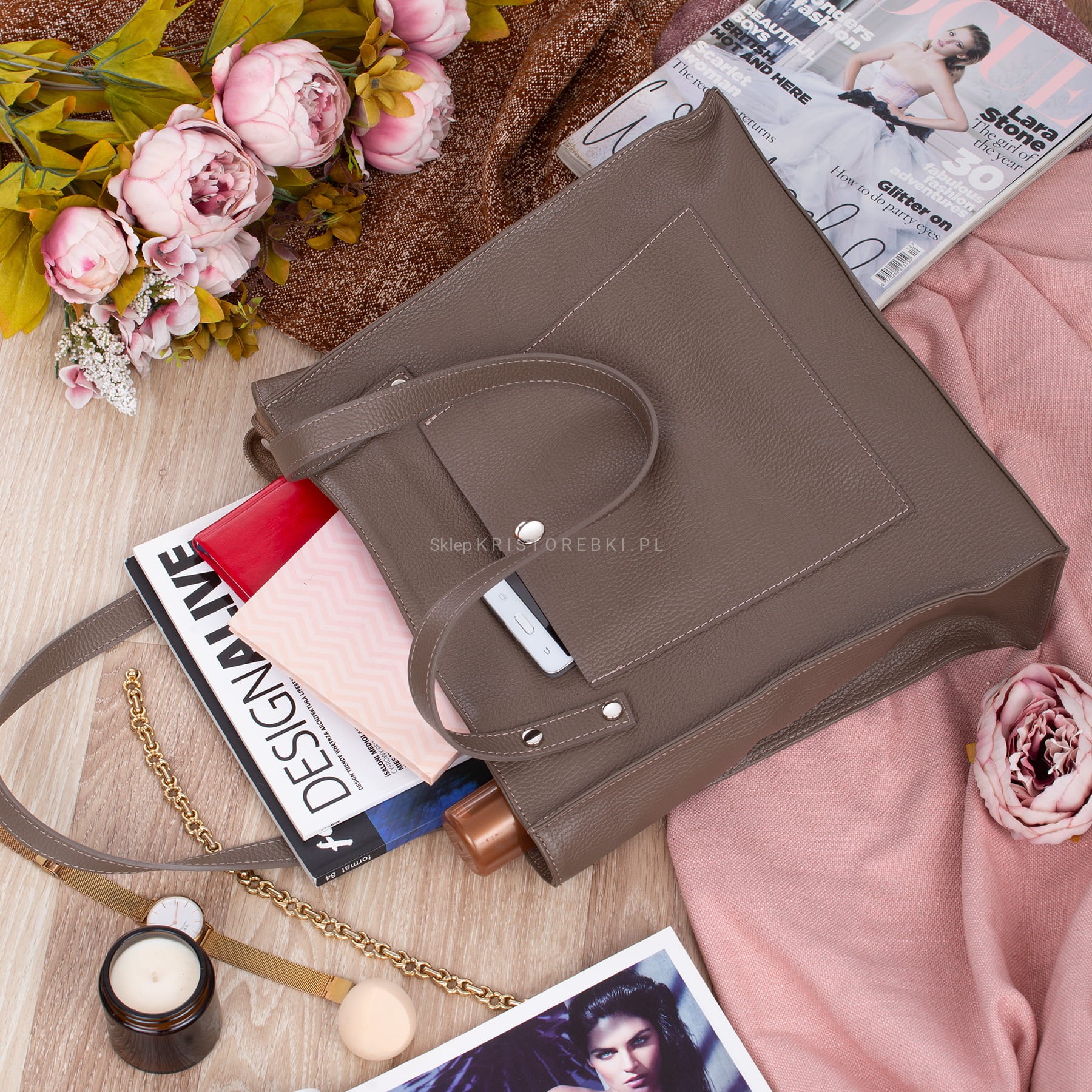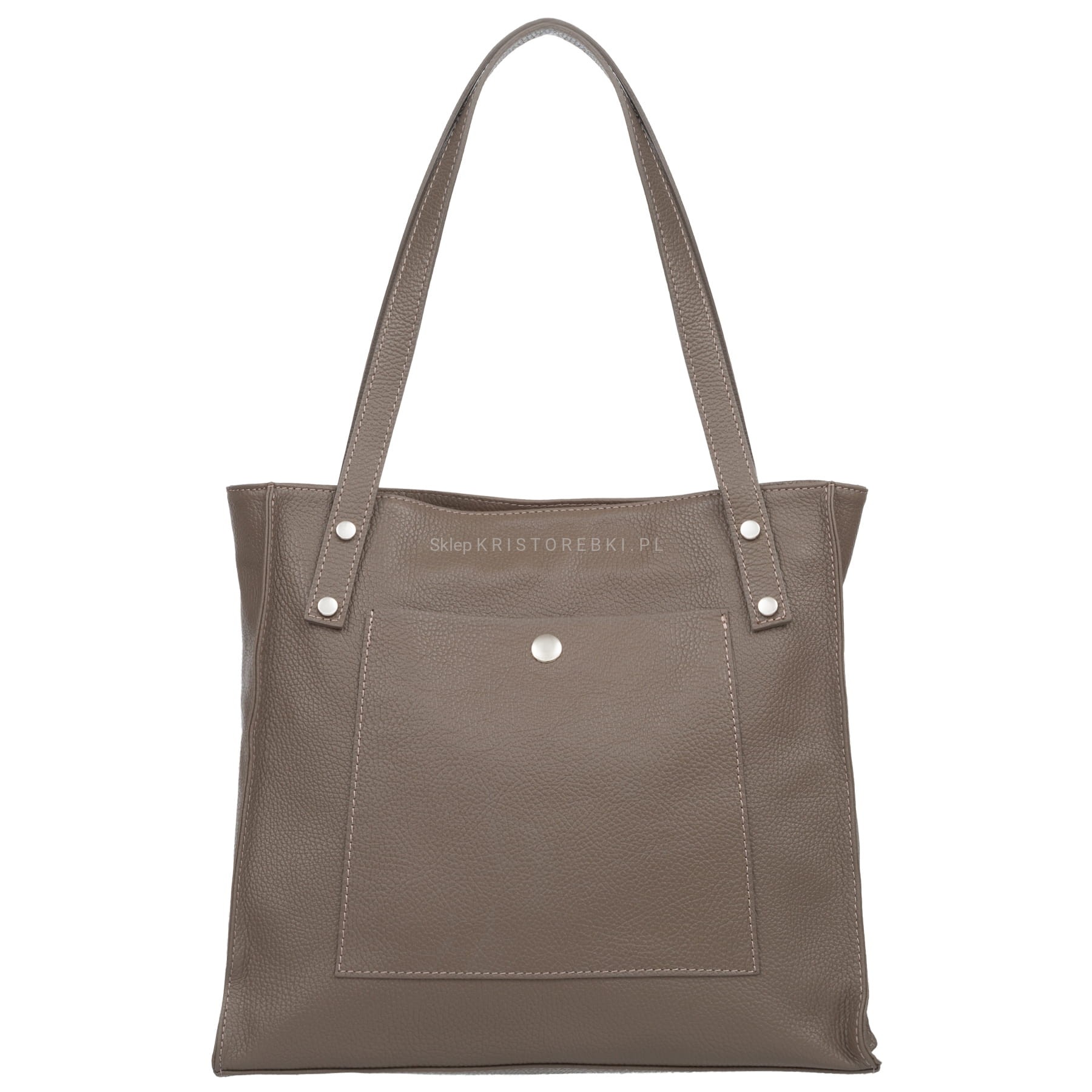 Duża torebka damska typu shopper znanej i cenionej na rynku europejskim marki VERA PELLE ITALY w kolorze TAUPE. Uszyta została bardzo starannie z najwyższej jakości włoskiej skóry naturalnej z widoczną fakturą. Torebka posiada długie rączki, dzięki czemu można ją wygodnie nosić w ręku i na ramieniu. Torebka posiada okucia w kolorze srebrnym i zamykana jest na solidny suwak. Jednokomorowy środek wykończony jest podszewką. Dodatkowo w środku znajdziesz praktyczną kieszonkę zamykaną na suwak oraz otwartą małą kieszonkę na telefon lub dokumenty. Z przodu torebki znajduje się duża kieszeń zamykana na magnesik a z tyłu znajduje się kolejna duża kieszeń zamykana na suwak. Torebka jest bardzo pojemna i praktyczna. Będzie pasować do większości codziennych stylizacji.