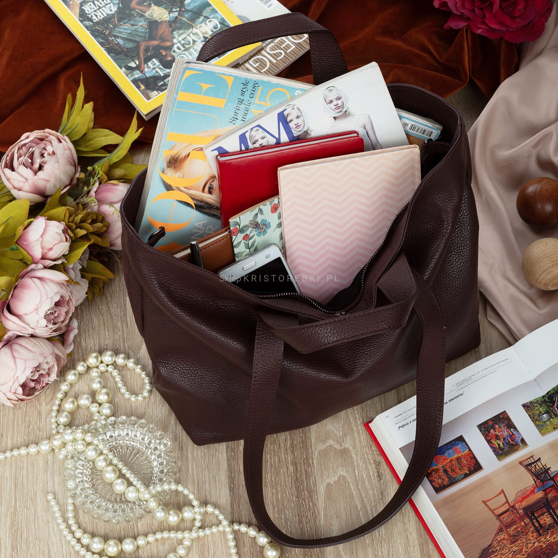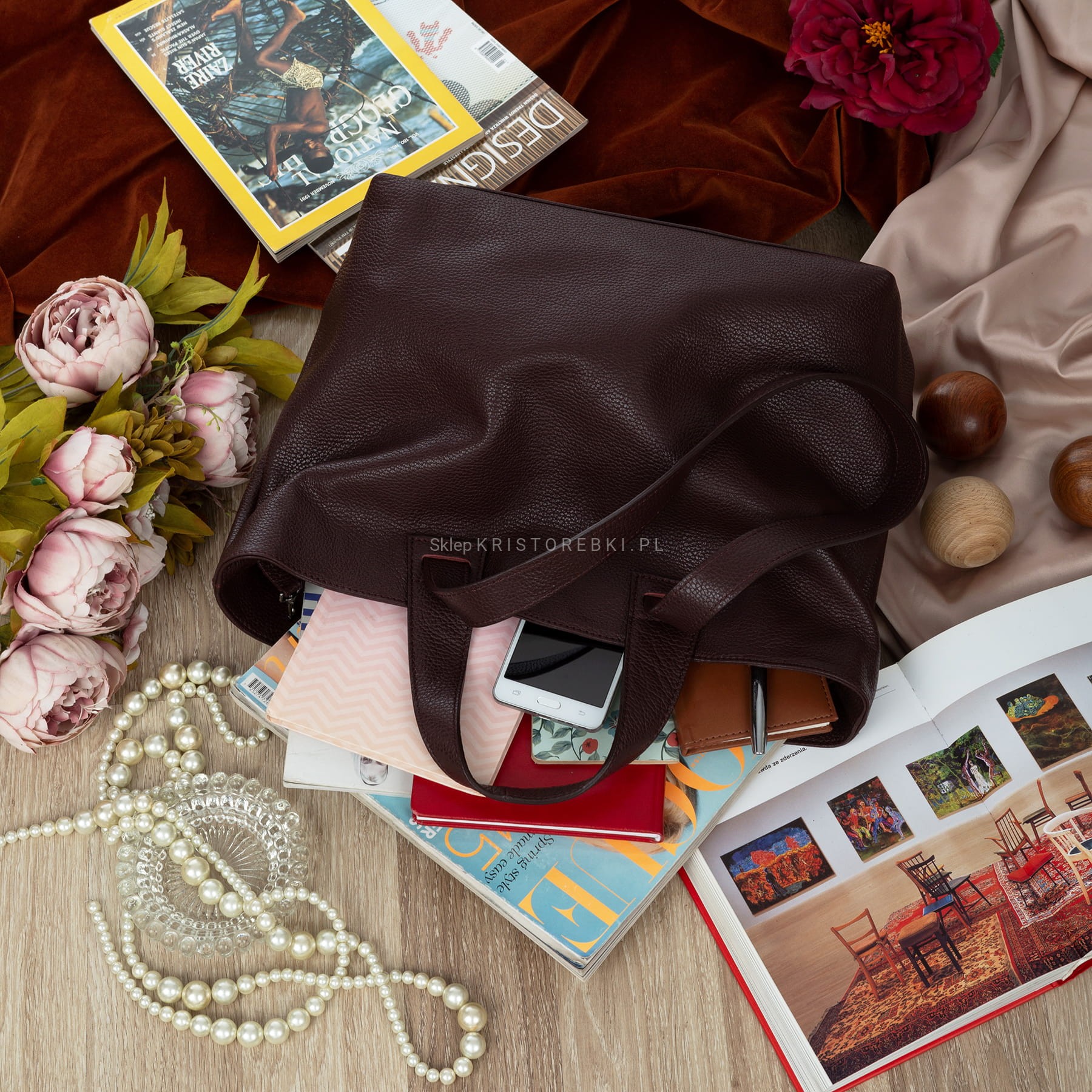 VERA PELLE torebka damska skórzana shopper z długimi rączkami na ramię V529 ciemna bordowa