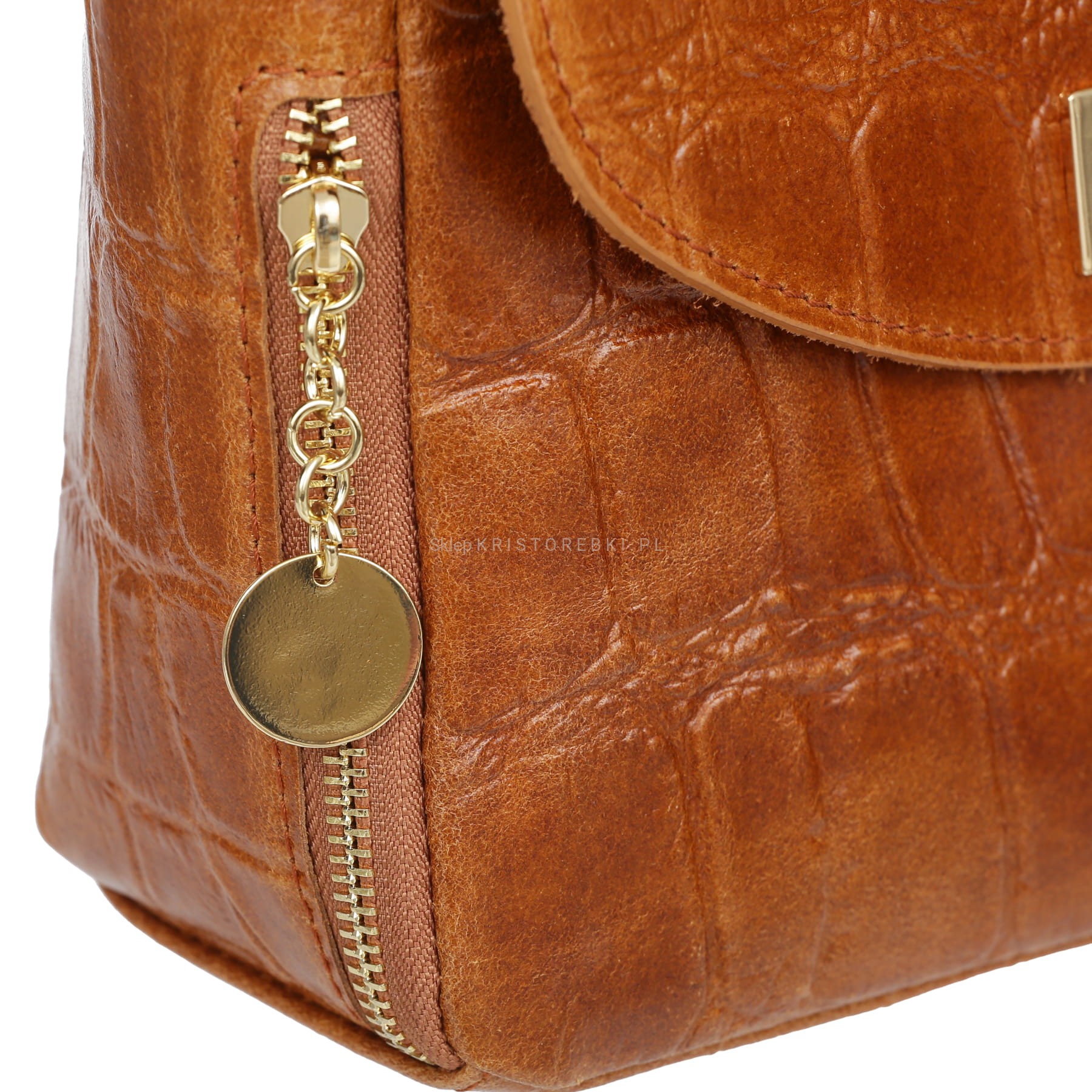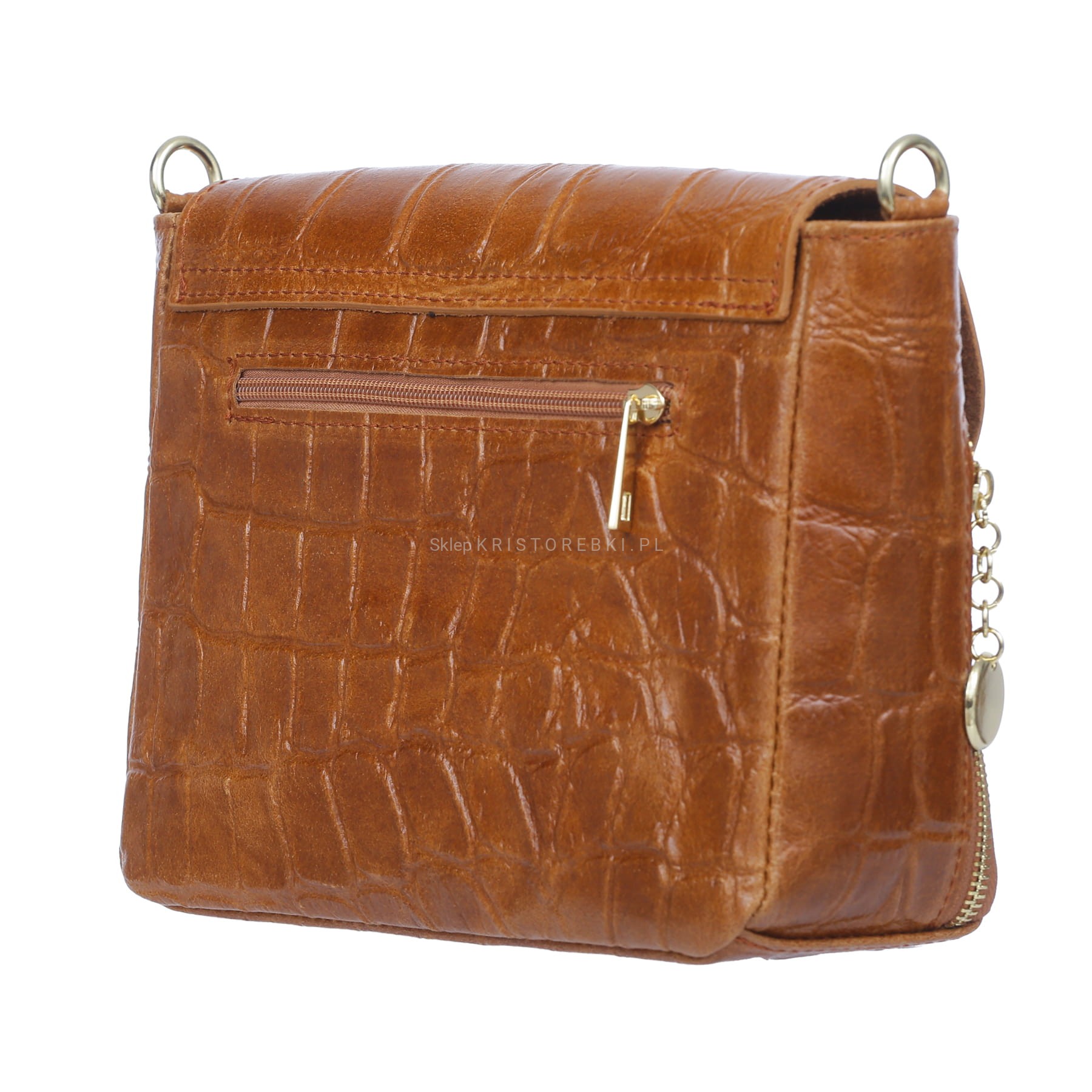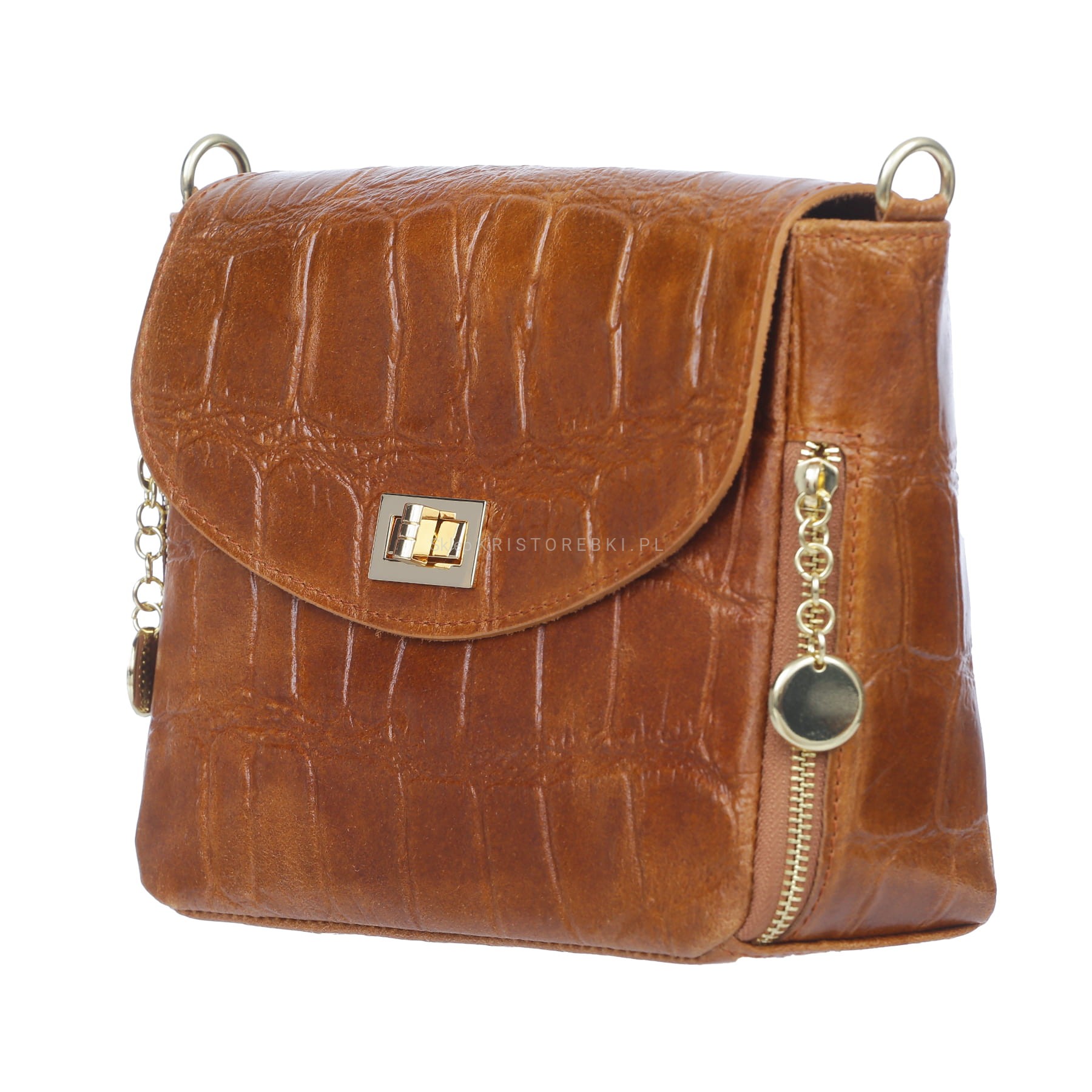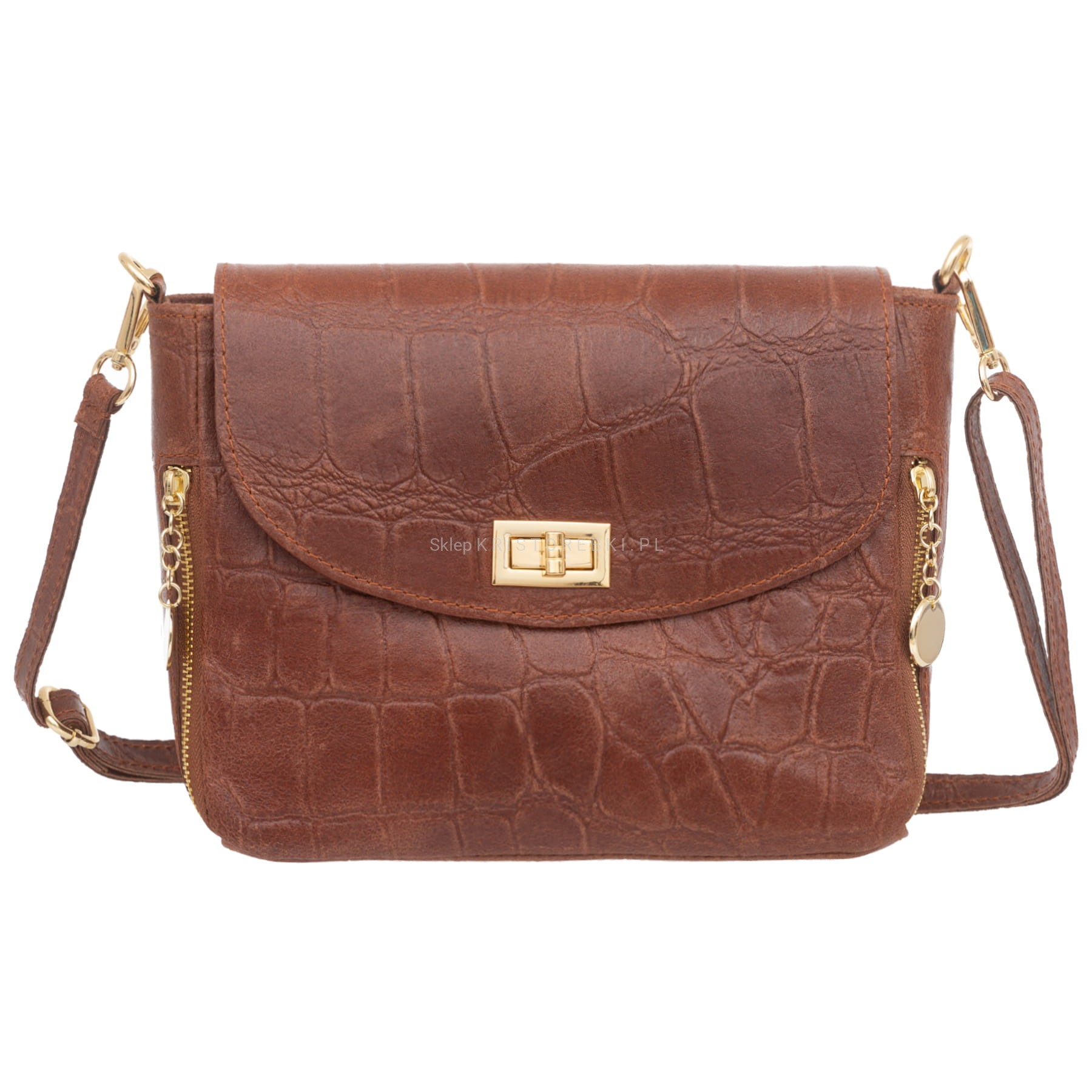 Torebka damska listonoszka znanej i cenionej na rynku europejskim marki VERA PELLE ITALY w kolorze KONIAKOWEGO BRĄZU. Wykonana została bardzo starannie z wysokogatunkowej skóry naturalnej z wytłoczonym wzorem. Torebka posiada długi odpinany i regulowany pasek, dzięki czemu możesz ją wygodnie nosić na ramieniu i dopasować do własnych preferencji. Główna klapa zamykana jest na obrotowy bigiel. Złote okucia oraz ozdobne suwaczki po bokach nadają jej modnego i nowoczesnego stylu. Torebka posiada pojemną komorę zamykaną na suwak a wnętrze wykończone jest podszewką. W środku dodatkowo znajduje się kieszonka zamykana na suwak, oraz dodatkowa otwarta kieszonka na telefon lub dokumenty. Dzięki usztywnianemu dnu listonoszka nie straci swoich kształtów nawet przy niewielkim wypełnieniu. Klasyczna, stylowa a zarazem elegancka, sprawdzi się zarówno podczas oficjalnych, jak i codziennych wyjść.