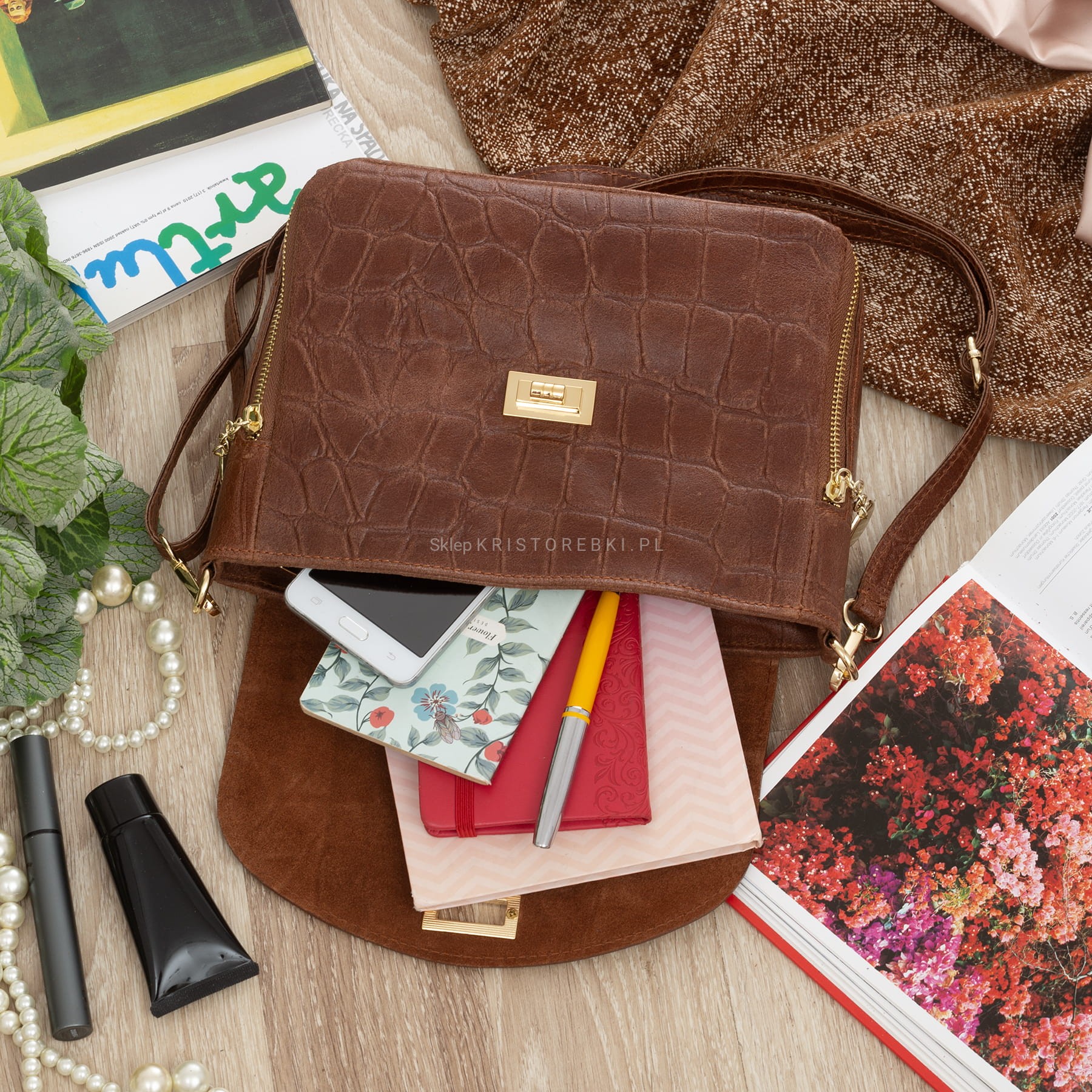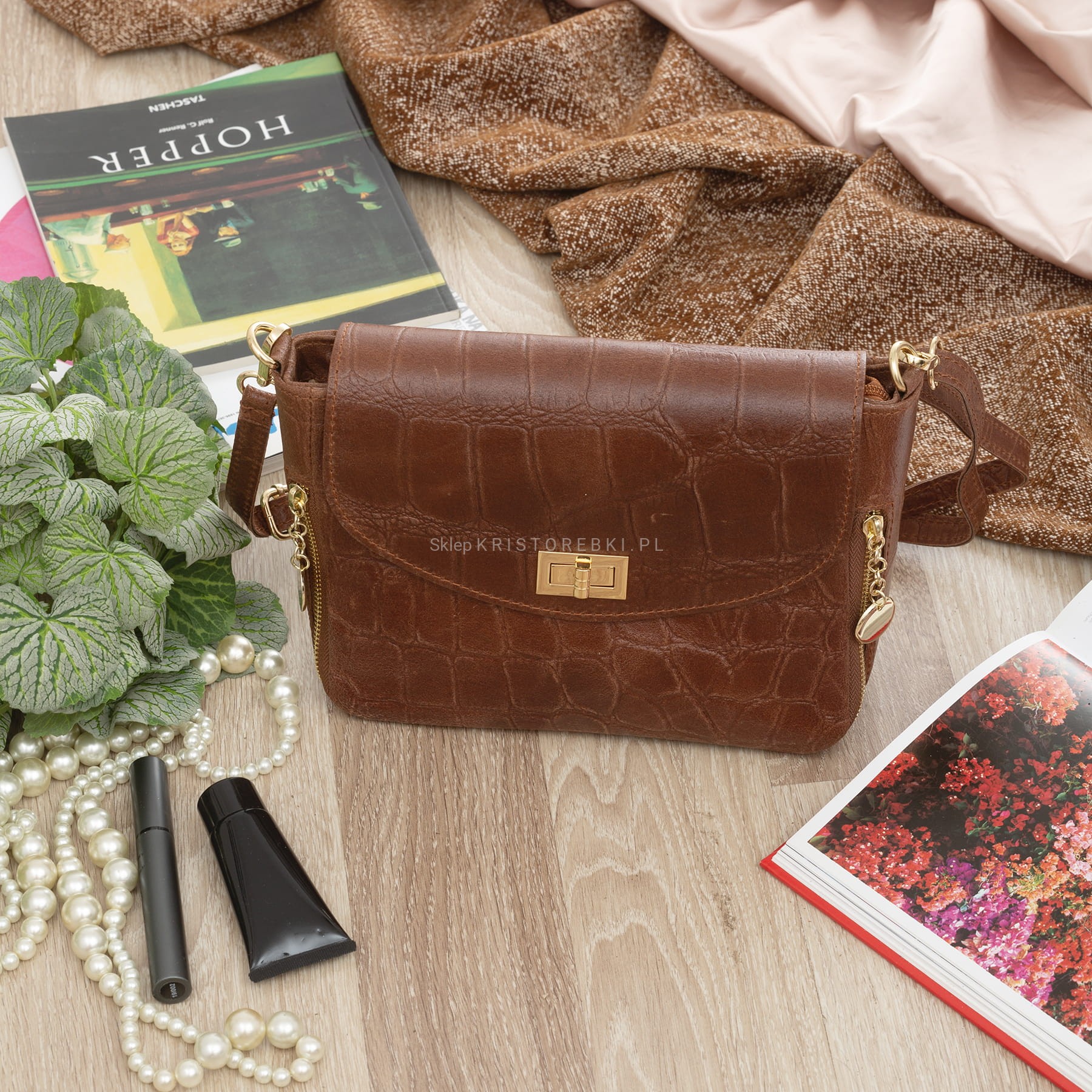 VERA PELLE torebka damska skórzana listonoszka kroko z paskiem V532 brązowa