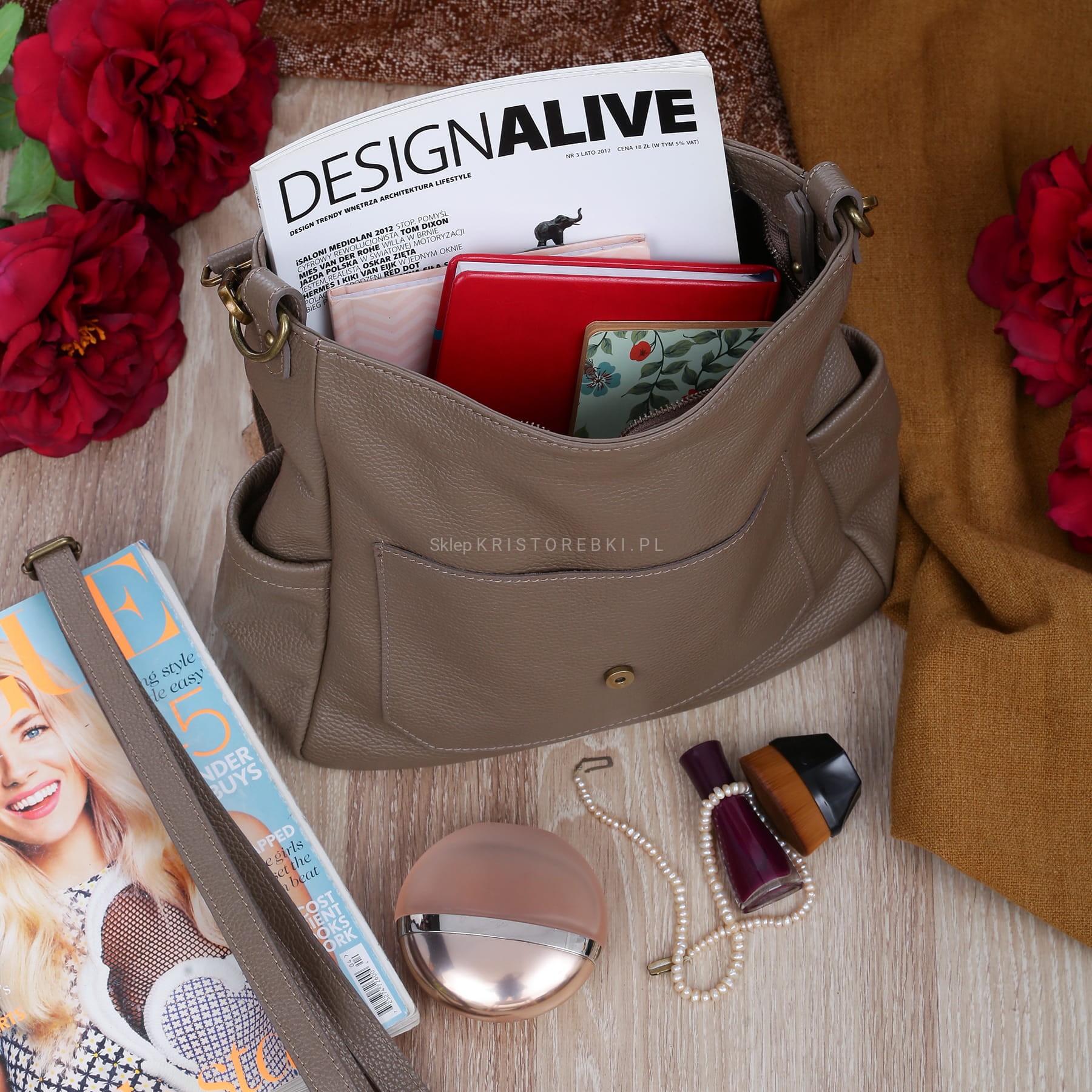 Duża torebka damska typu worek znanej i cenionej na rynku europejskim marki VERA PELLE ITALY w kolorze TAUPE. Uszyta została bardzo starannie z najwyższej jakości włoskiej skóry naturalnej z widoczną fakturą. Posiada długą i odpinaną rączkę, dzięki czemu można ją wygodnie nosić w ręku i na ramieniu. Do torebki dołączony został również długi i regulowany pasek, dzięki czemu można ją wygodnie nosić również na ramieniu i dopasować do własnych preferencji. Przednia klapa zapinana jest na magnesik i posiada ozdobny paseczek a pod klapą znajduje się funkcjonalna otwarta kieszonka. Torebka posiada okucia w kolorze mosiężnym i zamykana jest na solidny suwak. Jednokomorowy środek wykończony jest podszewką. Dodatkowo w środku znajdziesz praktyczną przegrodę, kieszonkę zamykaną na suwak oraz otwartą kieszonkę na telefon lub dokumenty. Z tyłu znajduje się kolejna praktyczna kieszeń zamykana na suwak. Torebka jest bardzo pojemna i praktyczna w codziennym użytkowaniu a jej spód jest dodatkowo usztywniony. Będzie pasować do większości codziennych i eleganckich stylizacji.