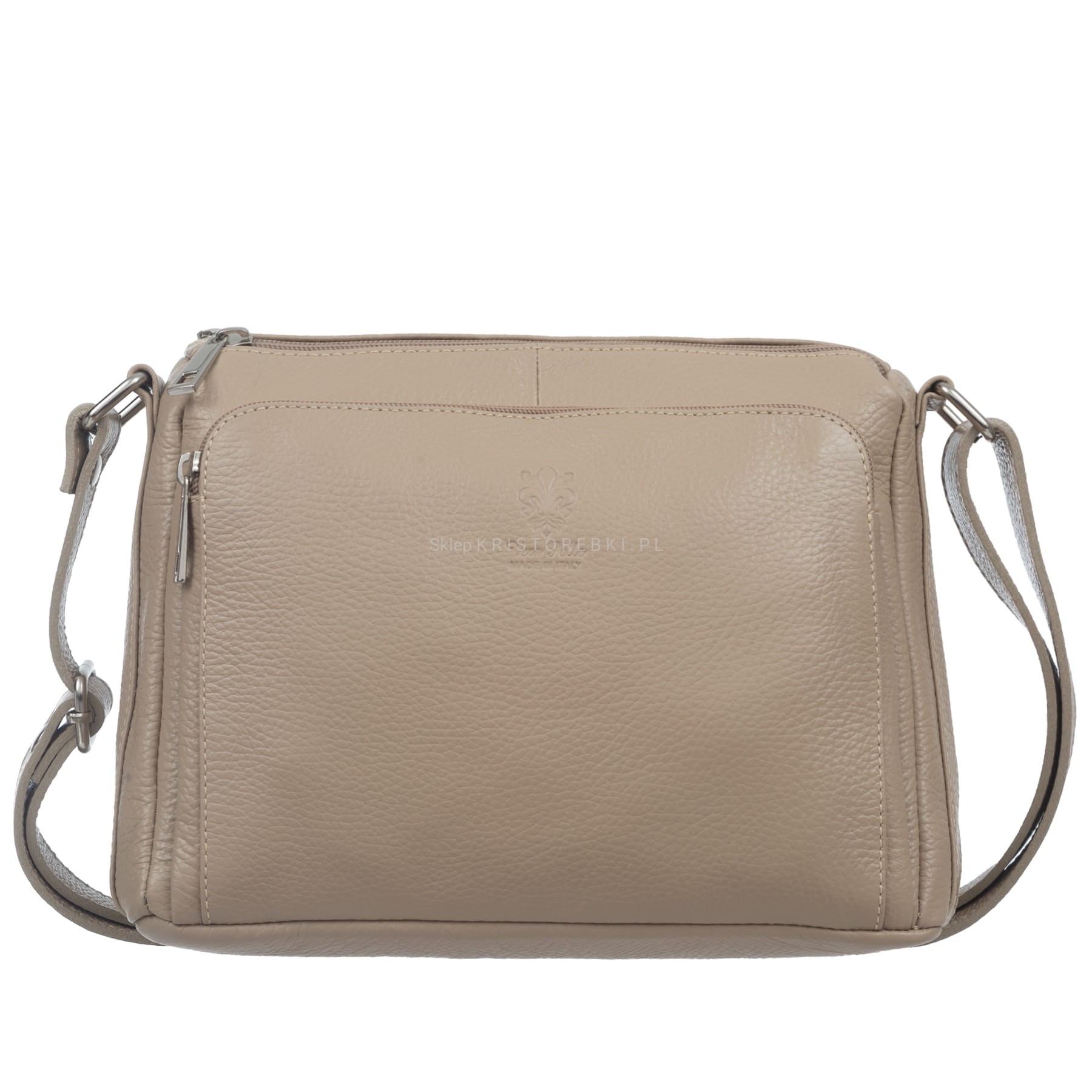 Torebka damska listonoszka znanej i cenionej na rynku europejskim marki VERA PELLE ITALY w kolorze BEŻOWYM. Wykonana została bardzo starannie z najwyższej jakości włoskiej skóry naturalnej z widoczną fakturą. Torebka posiada długi i regulowany pasek, dzięki czemu możesz ją wygodnie nosić na ramieniu i dopasować do własnych preferencji. Torebka posiada okucia w kolorze srebrnym i zamykana jest na dwa solidne suwaki. Dwukomorowy środek wykończony jest podszewką. Dodatkowo w środku jednej z komór znajduje się praktyczna kieszonka zamykana na suwak. Z przodu i z tyłu torebki znajdują się kolejne funkcjonalne duże kieszenie zamykane na suwak. Dzięki usztywnianemu dnu listonoszka nie straci swoich kształtów nawet przy niewielkim wypełnieniu. Klasyczna, stylowa a zarazem elegancka, sprawdzi się zarówno podczas oficjalnych, jak i codziennych wyjść.