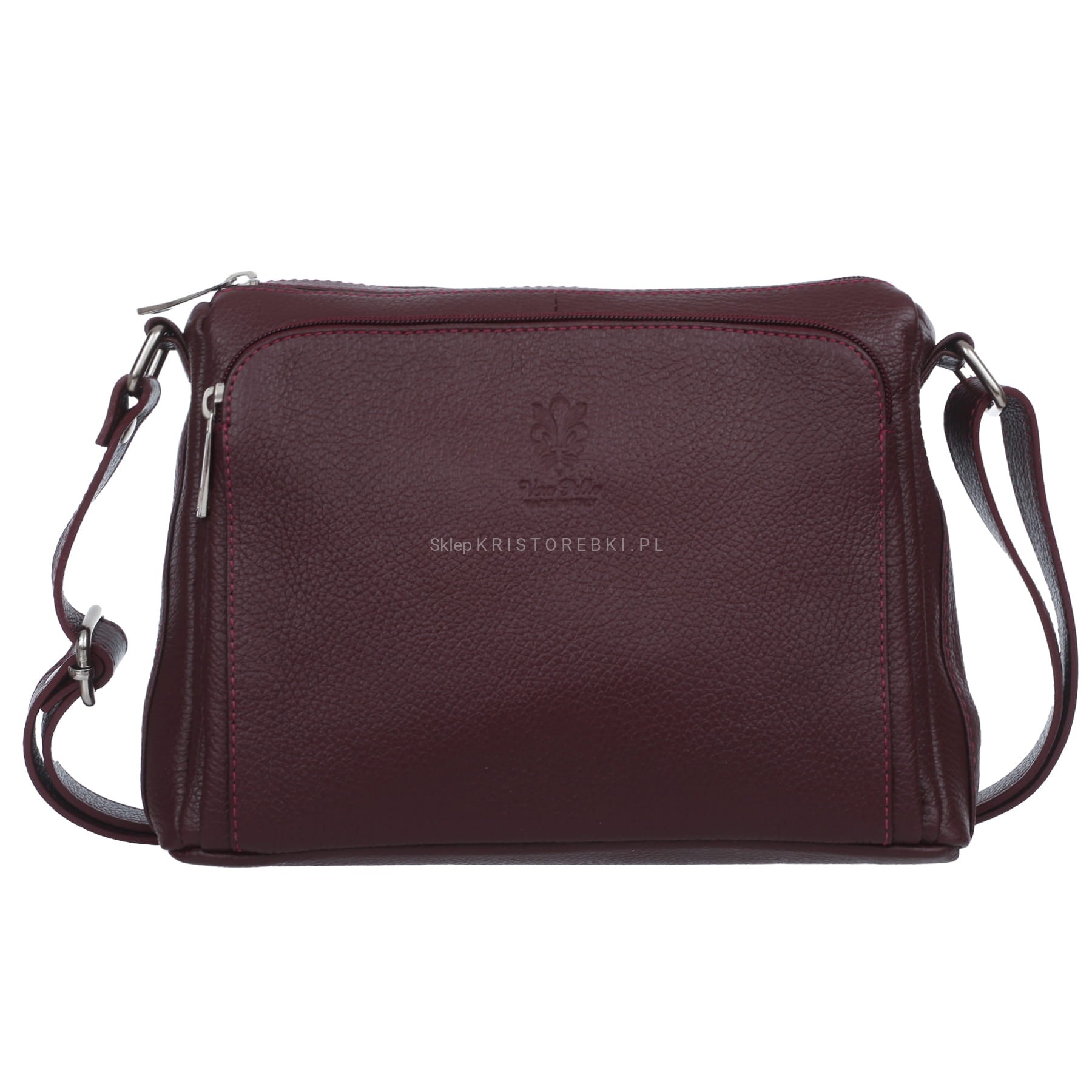 Torebka damska listonoszka znanej i cenionej na rynku europejskim marki VERA PELLE ITALY w kolorze CIEMNEGO BORDO. Wykonana została bardzo starannie z najwyższej jakości włoskiej skóry naturalnej z widoczną fakturą. Torebka posiada długi i regulowany pasek, dzięki czemu możesz ją wygodnie nosić na ramieniu i dopasować do własnych preferencji. Torebka posiada okucia w kolorze srebrnym i zamykana jest na dwa solidne suwaki. Dwukomorowy środek wykończony jest podszewką. Dodatkowo w środku jednej z komór znajduje się praktyczna kieszonka zamykana na suwak. Z przodu i z tyłu torebki znajdują się kolejne funkcjonalne duże kieszenie zamykane na suwak. Dzięki usztywnianemu dnu listonoszka nie straci swoich kształtów nawet przy niewielkim wypełnieniu. Klasyczna, stylowa a zarazem elegancka, sprawdzi się zarówno podczas oficjalnych, jak i codziennych wyjść.