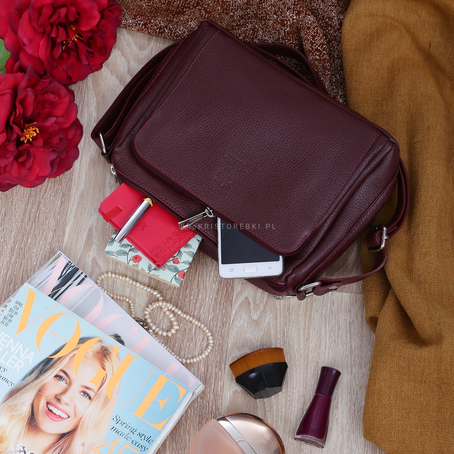 VERA PELLE torebka damska skórzana listonoszka z paskiem na ramię V535 ciemna bordowa