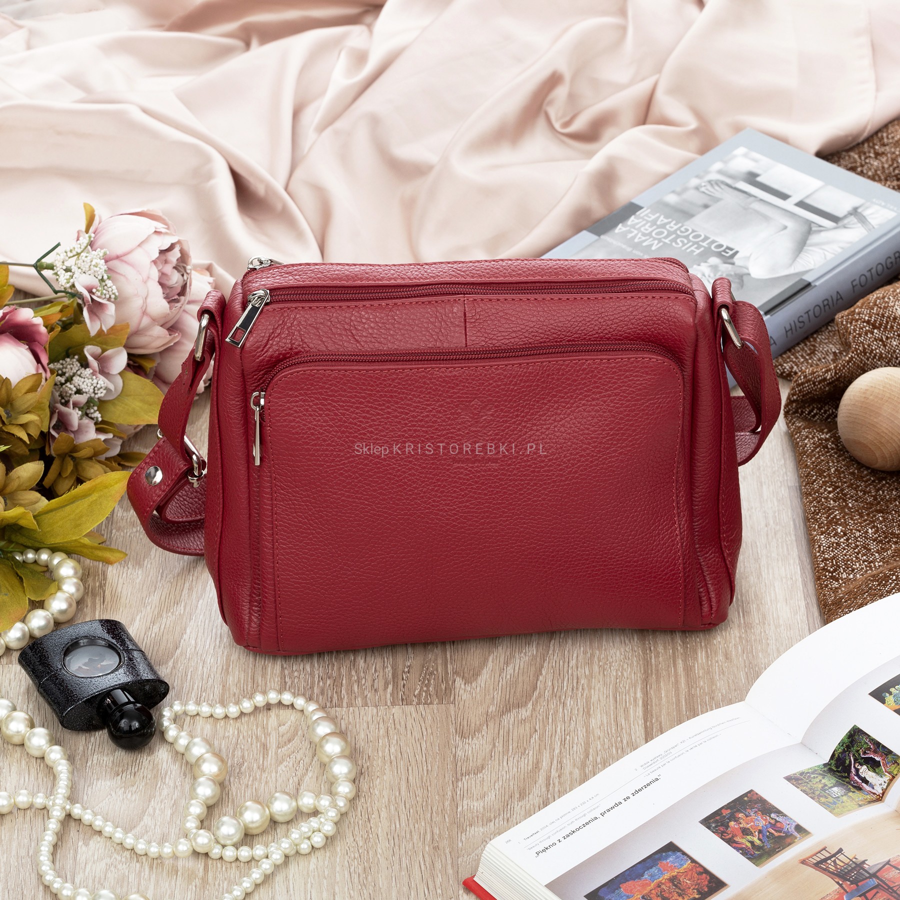 Torebka damska listonoszka znanej i cenionej na rynku europejskim marki VERA PELLE ITALY w kolorze CIEMNEJ CZERWIENI. Wykonana została bardzo starannie z najwyższej jakości włoskiej skóry naturalnej z widoczną fakturą. Torebka posiada długi i regulowany pasek, dzięki czemu możesz ją wygodnie nosić na ramieniu i dopasować do własnych preferencji. Torebka posiada okucia w kolorze srebrnym i zamykana jest na dwa solidne suwaki. Dwukomorowy środek wykończony jest podszewką. Dodatkowo w środku jednej z komór znajduje się praktyczna kieszonka zamykana na suwak. Z przodu i z tyłu torebki znajdują się kolejne funkcjonalne duże kieszenie zamykane na suwak. Dzięki usztywnianemu dnu listonoszka nie straci swoich kształtów nawet przy niewielkim wypełnieniu. Klasyczna, stylowa a zarazem elegancka, sprawdzi się zarówno podczas oficjalnych, jak i codziennych wyjść.