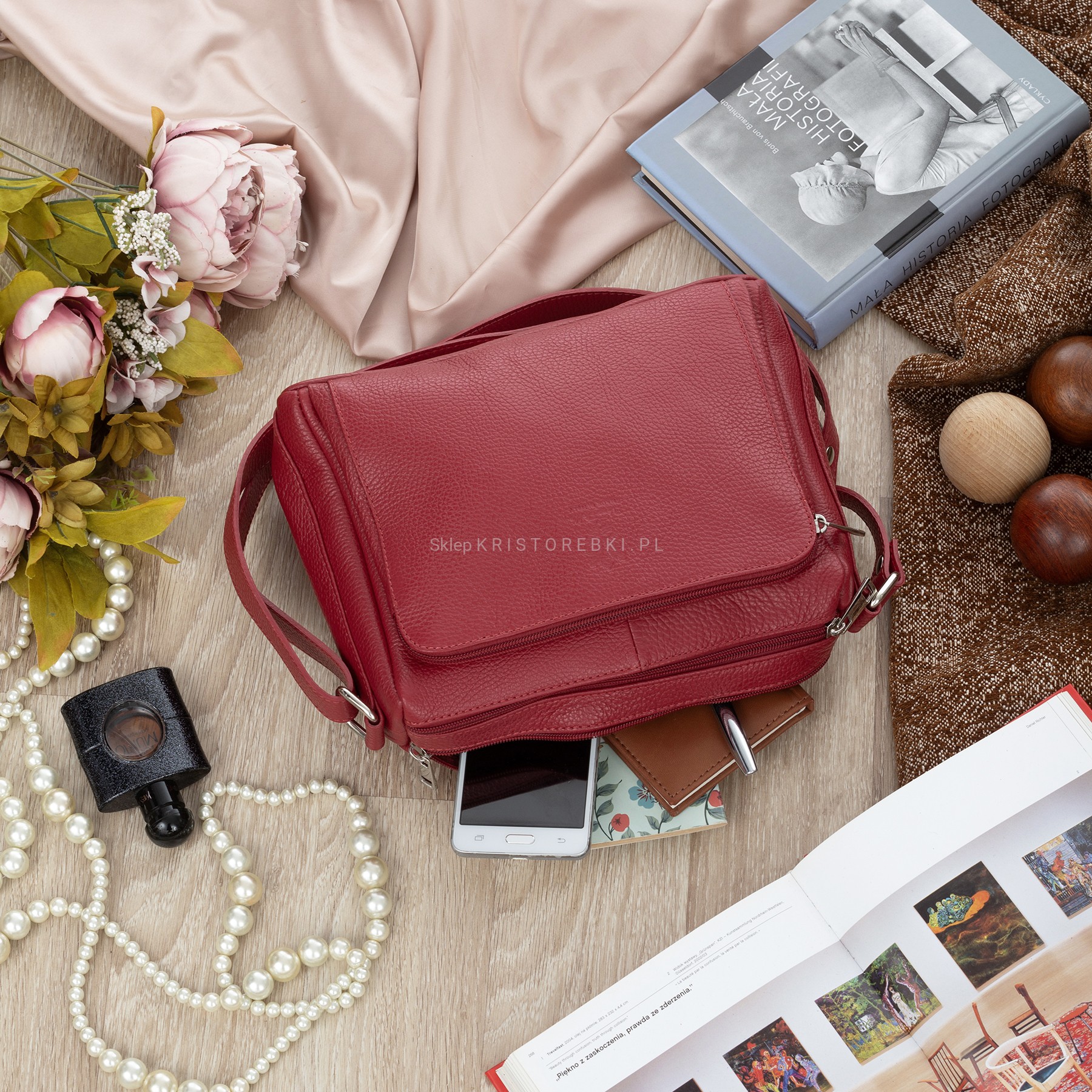 VERA PELLE torebka damska skórzana listonoszka z paskiem na ramię V535 ciemna czerwona